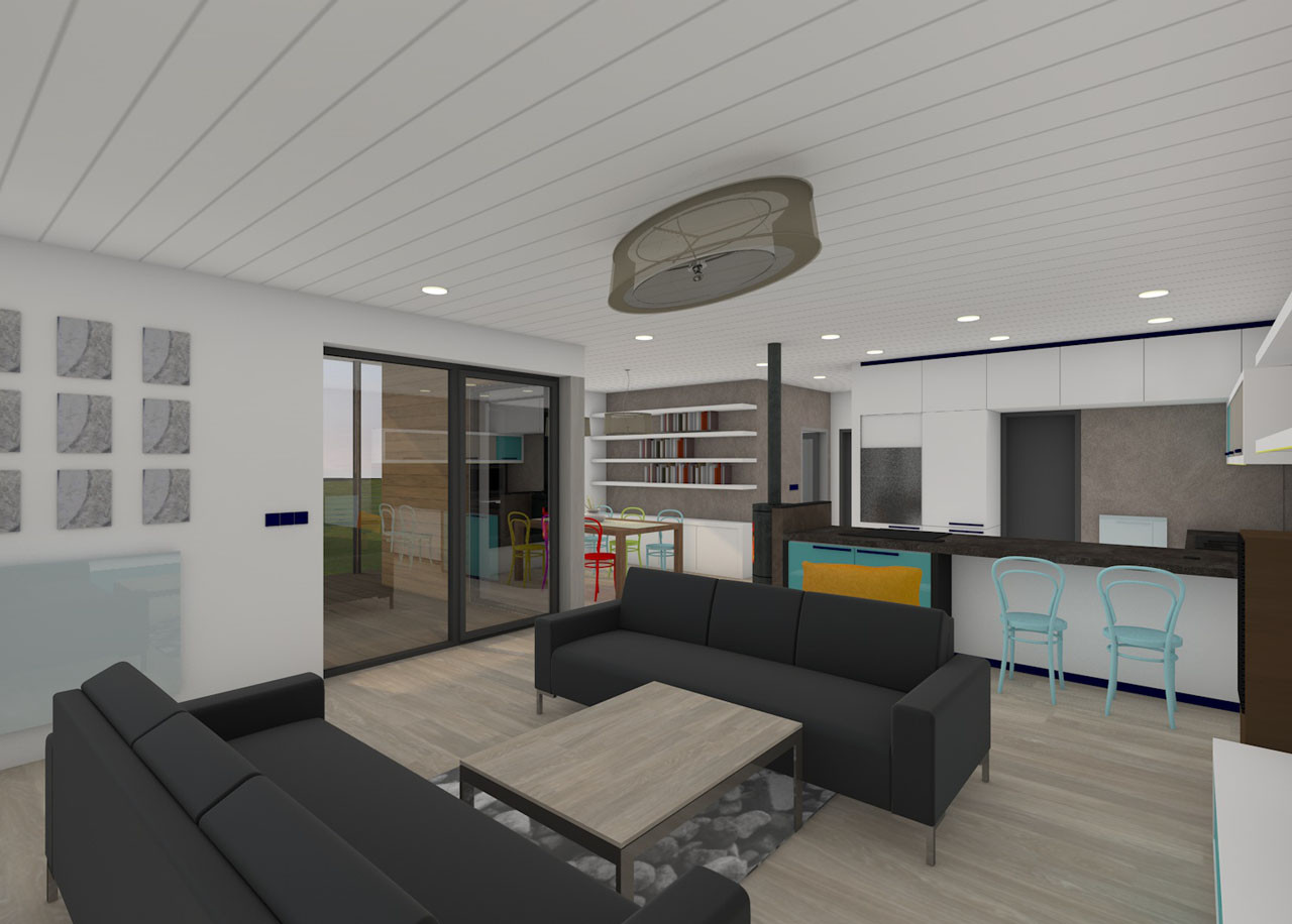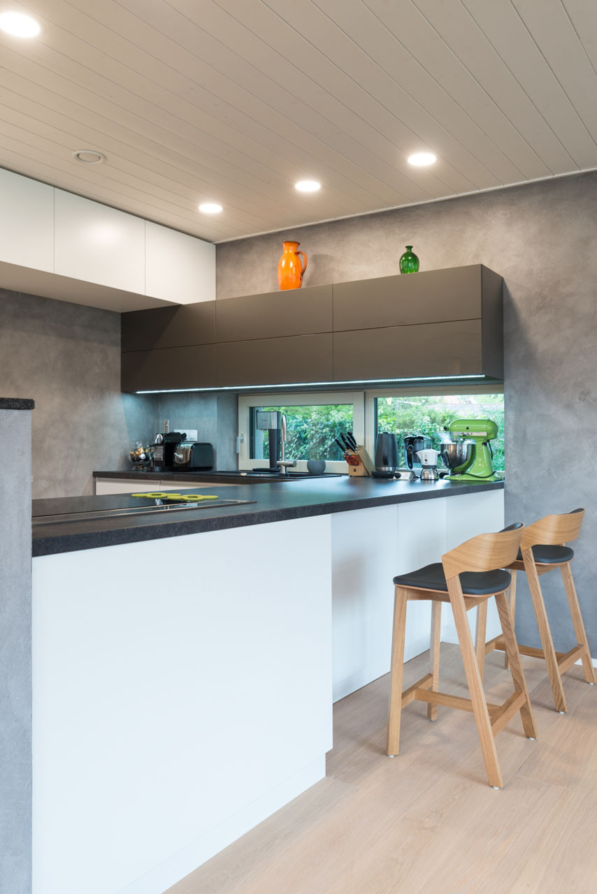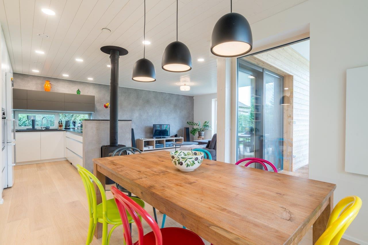 Všechny prvky interiéru musely ustoupit do pozadí vysněnému stolu z masivního cedru a barevným tonetkám. Proto se zde pracovalo převážně s běleným dubem a odstíny bílé, šedé a antracitové. Dokonce i na dřevěný obklad stropu byla zvolena bílá barva, současně si však svou rustikální podstatu uchovává díky přirozeným nerovnostem a nedokonalostem.