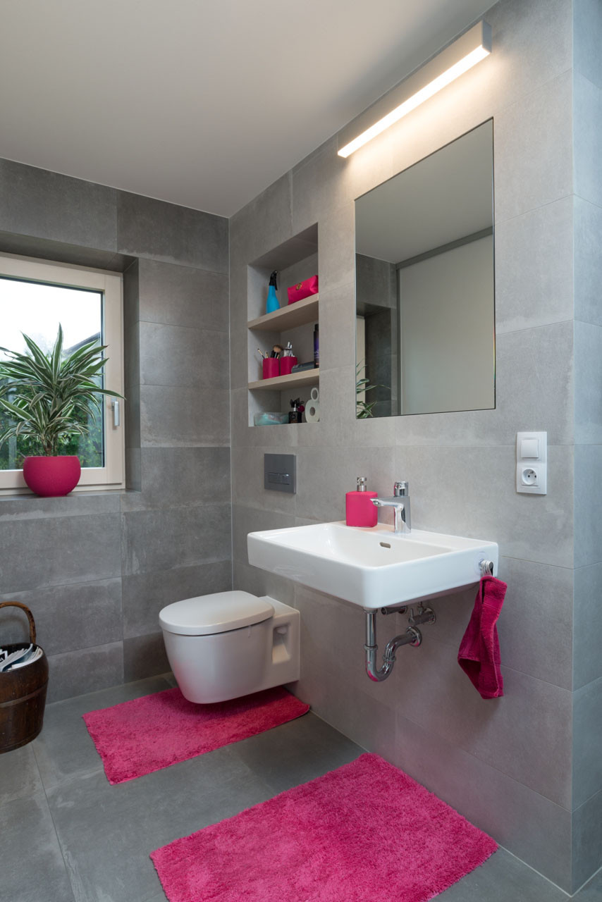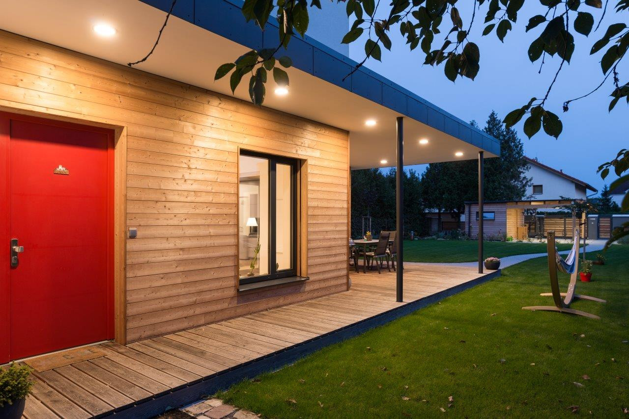 Sytě červená barva vstupních dveří doplňuje elegantní bílo-antracitovo-dřevěnou kombinaci fasády. Dveře jsou tak překvapením a pozdravením pro příchozí. Důležitý detail fasádě přidává propojení oken do jednoho celku, přiznané industriální kotvení antracitových obkladových desek i modřínový obklad se skrytým kotvením.