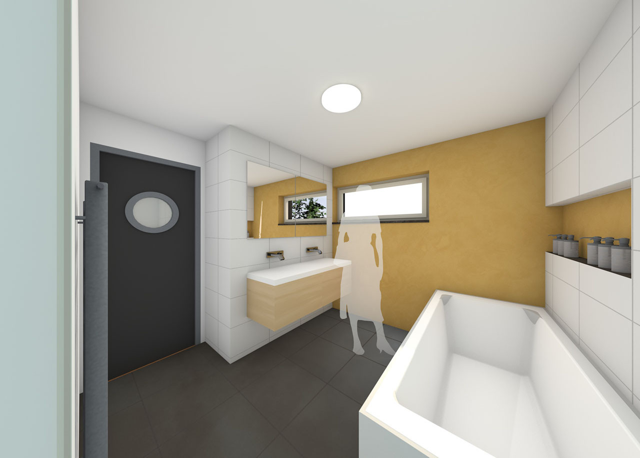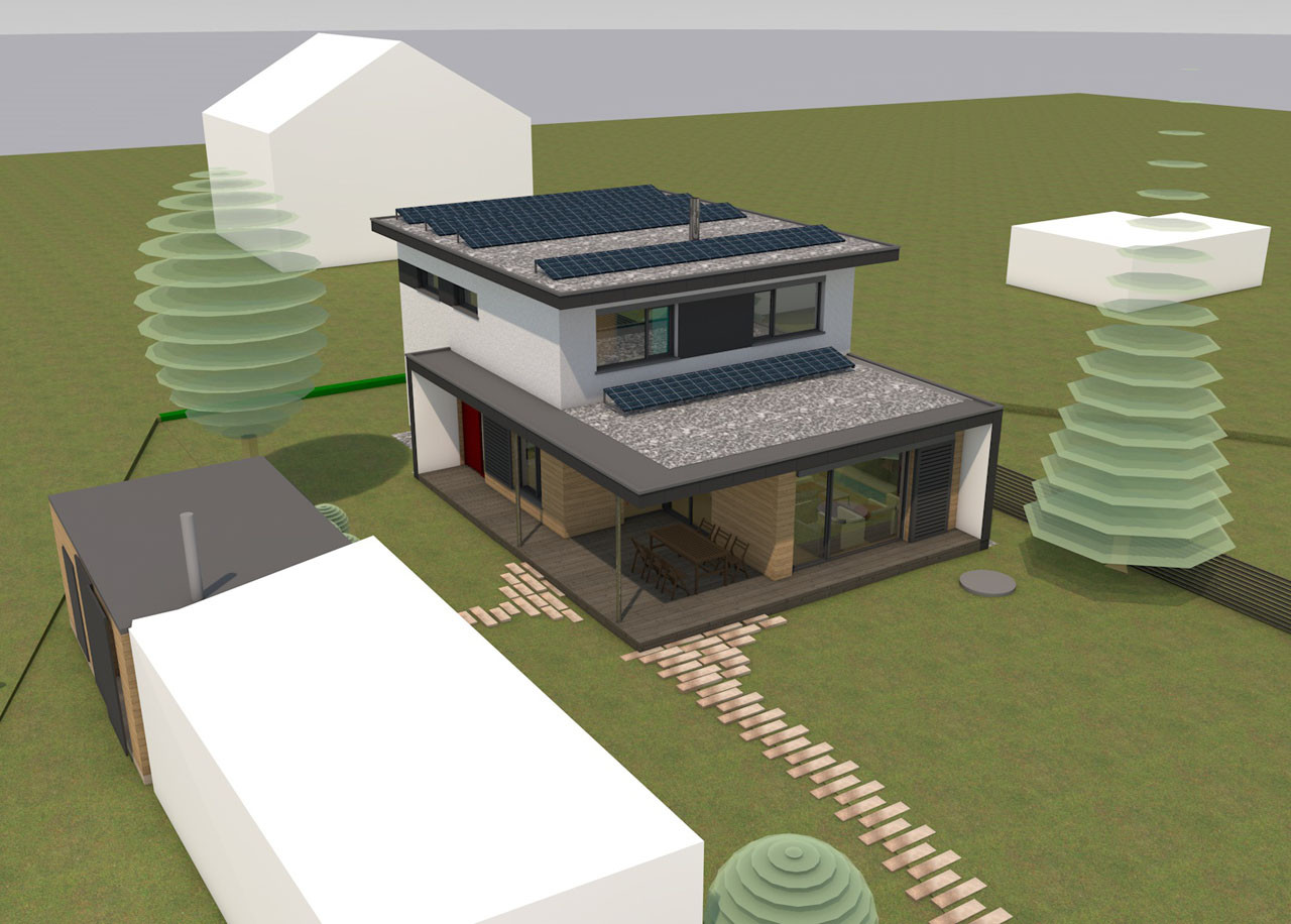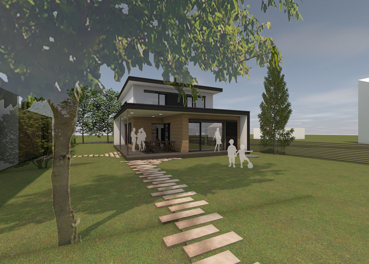 Projekt domu byl vytvářen v softwaru Allplan. Již v rámci studie se v tomto programu tvořilo několik verzí ve 3D. K reálné představě osazení domu do okolního terénu sloužil model terénu, který byl v programu vymodelován v nadstavbě GEO. Ta umožňuje vymodelovat terén dle zaměření od geodeta. Tak je možné dům vhodně osadit do terénu tak, aby byla vyrovnaná bilance zemních prací. Po odsouhlasení finální studie investorem byla v Allplanu vypracována 2D dokumentace v podrobnosti pro prováděcí dokumentaci. Ve statické části této dokumentace byl využit modul pro vyztužování betonových konstrukcí, který podstatně ulehčí práci a automaticky generuje výkazy výztuže.