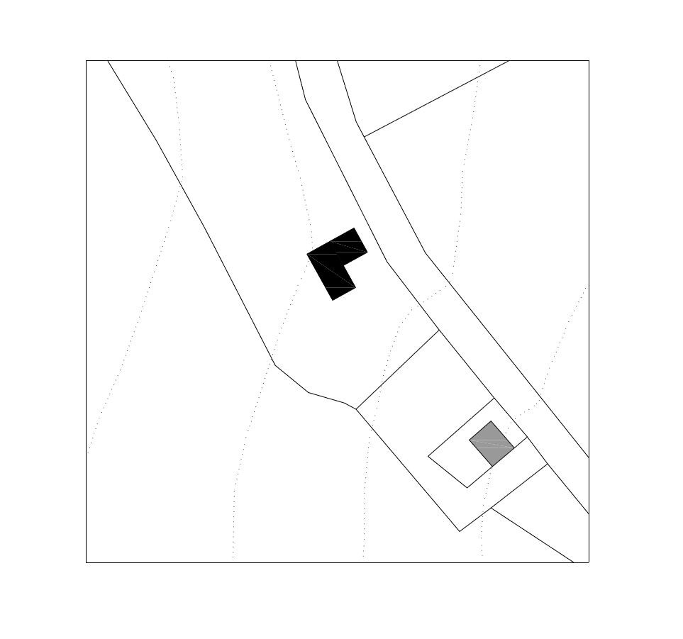 Zásadní roli při tvorbě návrhu sehrálo umístění objektu na pozemku, které následně výrazně ovlivnilo také řešení vnitřní dispozice. Dvoupodlažní obytnou hmotu architekti orientovali souběžně s komunikací, která s domem sousedí při severní straně, kolmo k ní pak připojili přízemní garáž se zelenou střechou. Ta zároveň kryje také hlavní vstup do objektu. Díky této výhodné orientaci jsou veškeré hlavní obytné prostory situovány k velkoryse prosklené jižní stěně domu, která vedle panoramatických výhledů do krajiny zajišťuje také dostatečné prosvětlení daných místností.