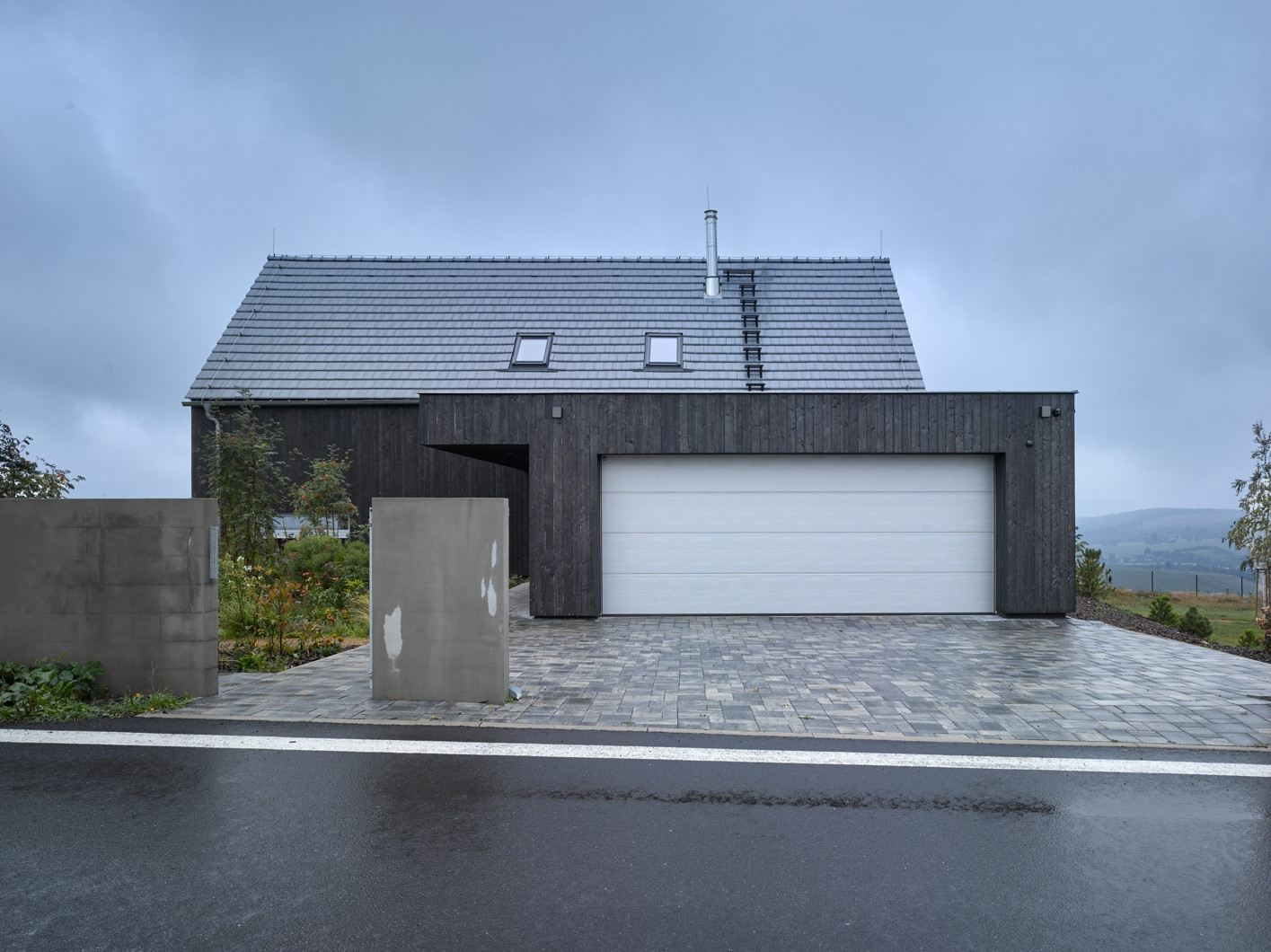 Na pozemku ve výšce 750 metrů nad mořem vyrostl nový rodinný dům z dílny architektonické dvojice Stempel&Tesar, která se při jeho návrhu nechala inspirovat tradičními principy místního stavitelství a architektury. Archetypálně vyhlížející dům s fasádou z tmavých, opalovaných modřínových prken doplnil krušnohorskou krajinu, do níž se nyní rozhlíží.