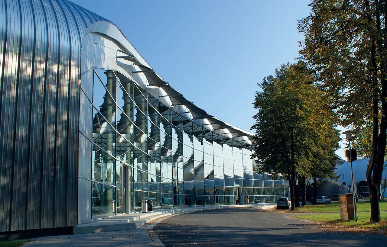 Východní fasáda ve tvaru evokujícím turbínu, resp. její výseč, je tvořena oblým přesahem střechy tvořícím lem fasády, skládaným kovovým pláštěm z profilovaných trapézových plechů, kruhových otvorů a předsazenou membránovou konstrukcí v podobě lopatek turbíny, které mají stínicí funkci. Západní fasáda je pojednána funkčně. Tvoří ji rovněž skládaný kovový plášť z profilovaných trapézových plechů, do něhož je umístěn podlouhlý okenní otvor, který ve středu přechází do posuvných vrat a tvoří ve fasádě náznak písmena T. V ploše fasády jsou situovány rovněž horizontální lamely, které sjednocují plochu kovové fasády a prosklené plochy. V lemu fasády se nachází membránová konstrukce, která tvoří náznak prodloužení střešního pláště a slouží ke stínění.