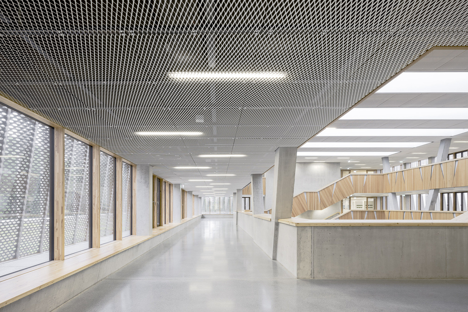 Projekt nabízí různé formy a kombinace typů výuky. Vstřícnost k uživatelům budovy architekti vyjádřili otevřenými prostory s velkými okny, díky kterým se dovnitř dostává nadstandardní množství přirozeného světla, které v celém projektu hraje zcela zásadní roli. Slunce se do budovy dostává jak díky velkoplošnému prosklení v přízemí, pásovým oknům v patrech s nápaditým stíněným z perforovaného plechu, tak i skrze velké modulární střešní světlíky od společnosti VELUX. Jednotlivé světlíky jsou seskládány do šesti světelných řad, které zajišťují osvětlení atria a přispívají k jeho celkové vzdušnosti a otevřenosti. Prvky jsou opatřeny izolačním zasklením, které mimo jiné napomáhá budově dosahovat standardu pasivního domu.