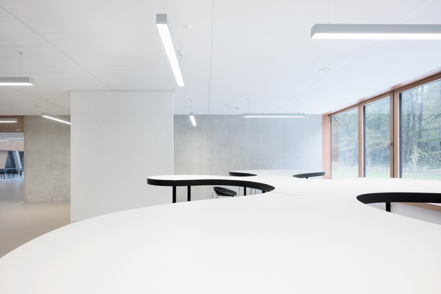 Vnitřní prostory pak plynule přecházejí v exteriér, který svým řešením umožňuje organizované skupinové činnosti. V pásu mezi budovou a lesem, s nímž škola sousedí, architekti navrhli malé zahradní prostory, které je možné různě kultivovat a upravovat pro potřeby venkovních učeben či například zahradních laboratoří.