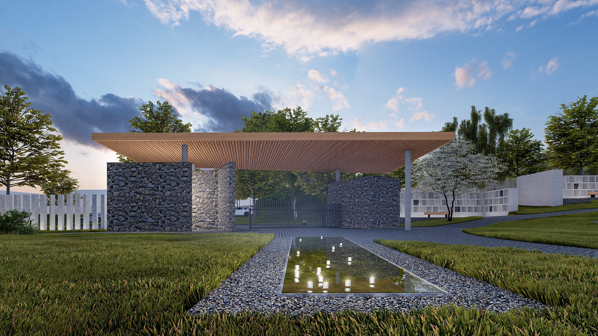 Jako vstup do pietního parku navrhli architekti důstojnou bránu, která je střídmou parafrází smuteční sloupové síně, navržené v kombinaci z místního kamene a dřeva. „Akcentem vstupního prostoru hřbitova je poetická intervence vodní kaskády zrcadlící oblohu. Nekonečná vodní plocha je místem, kde lze zapálit svíci a nechat ji symbolicky plout vstříc horizontu,“ říká architekt Michal Šourek. Na vstupní prostor hřbitova navazuje prstenec hlavní stezky a radiální pěšiny, zpřístupňující jednotlivé části hřbitova.