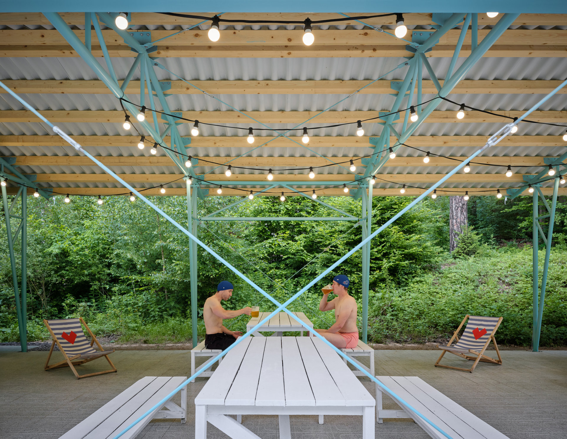 Zázemí Lesního koupaliště je i zajímavý kousek architektury, který navrhlo studio Mjölk spolu s Marií Vondrákovou. Hlavní součást je plechová střecha s ocelovou příhradovou konstrukcí v tyrkysové barvě – to je „deštník a slunečník plovárny,“ jak říkají architekti.