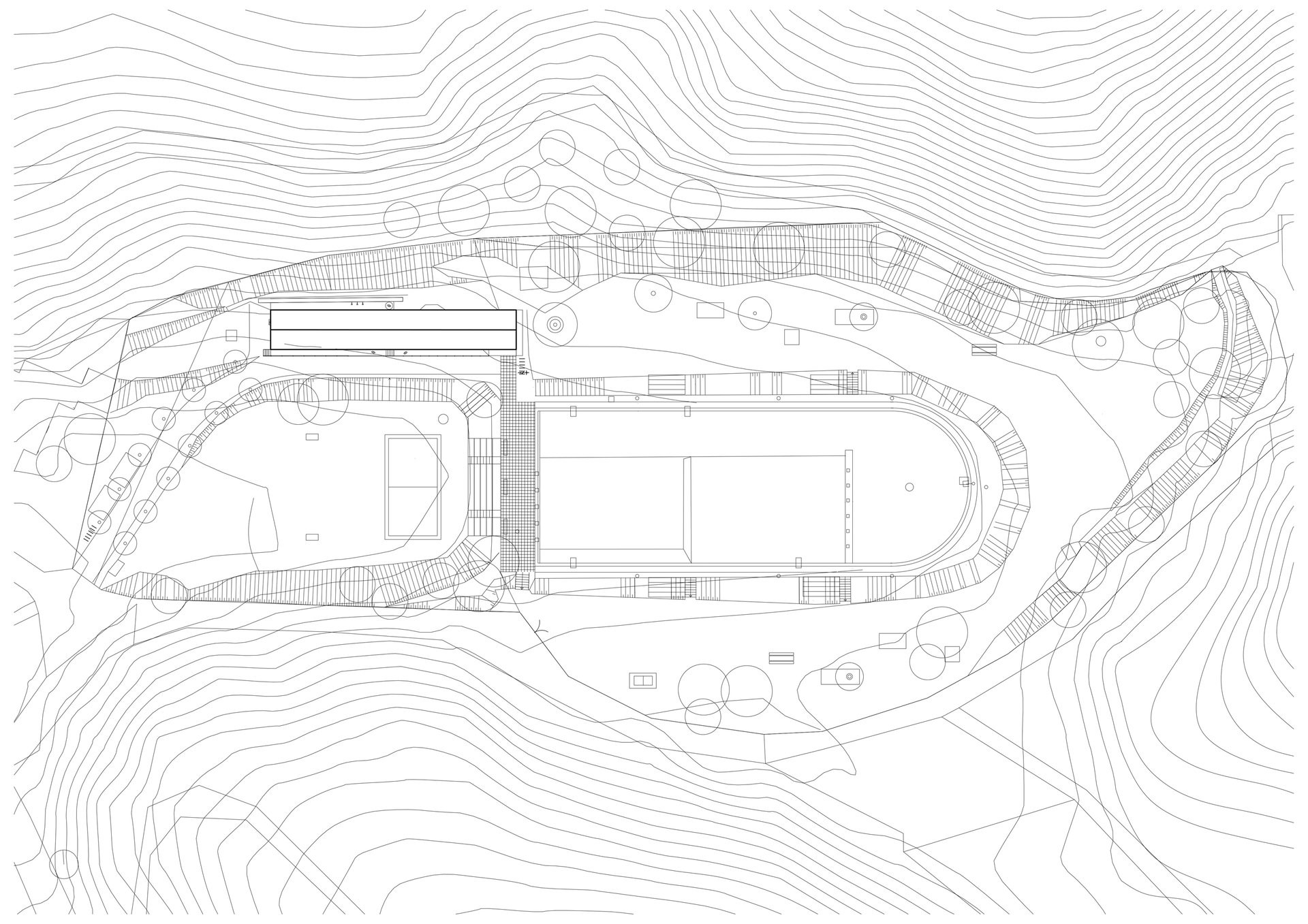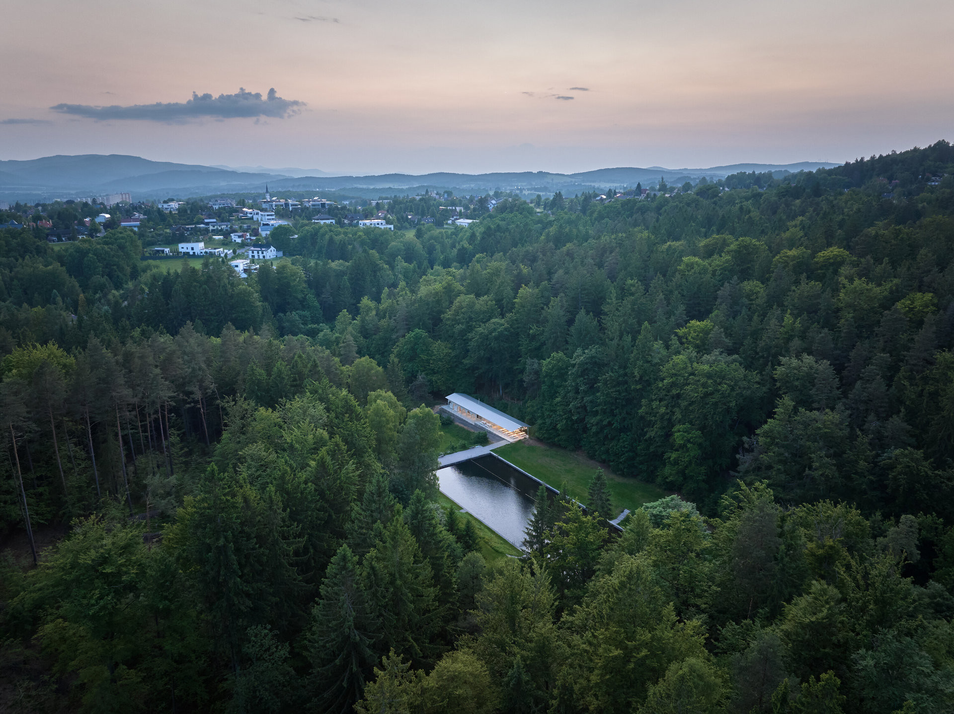 Střecha ukrývá všechny zmíněné funkce, a dá se pod ní také posedět. Objekty pod ní jsou z dřevěných CLT panelů, které jsou dokonce recyklované. „Byl to nějaký výzkum, ležely asi pět let venku,“ říká Jan Vondrák. Architekti je získali za dobrou cenu, zdravé části použili a ponechali jim jejich patinu - ke koupališti, které tu je už od 30. let, se to hodí.