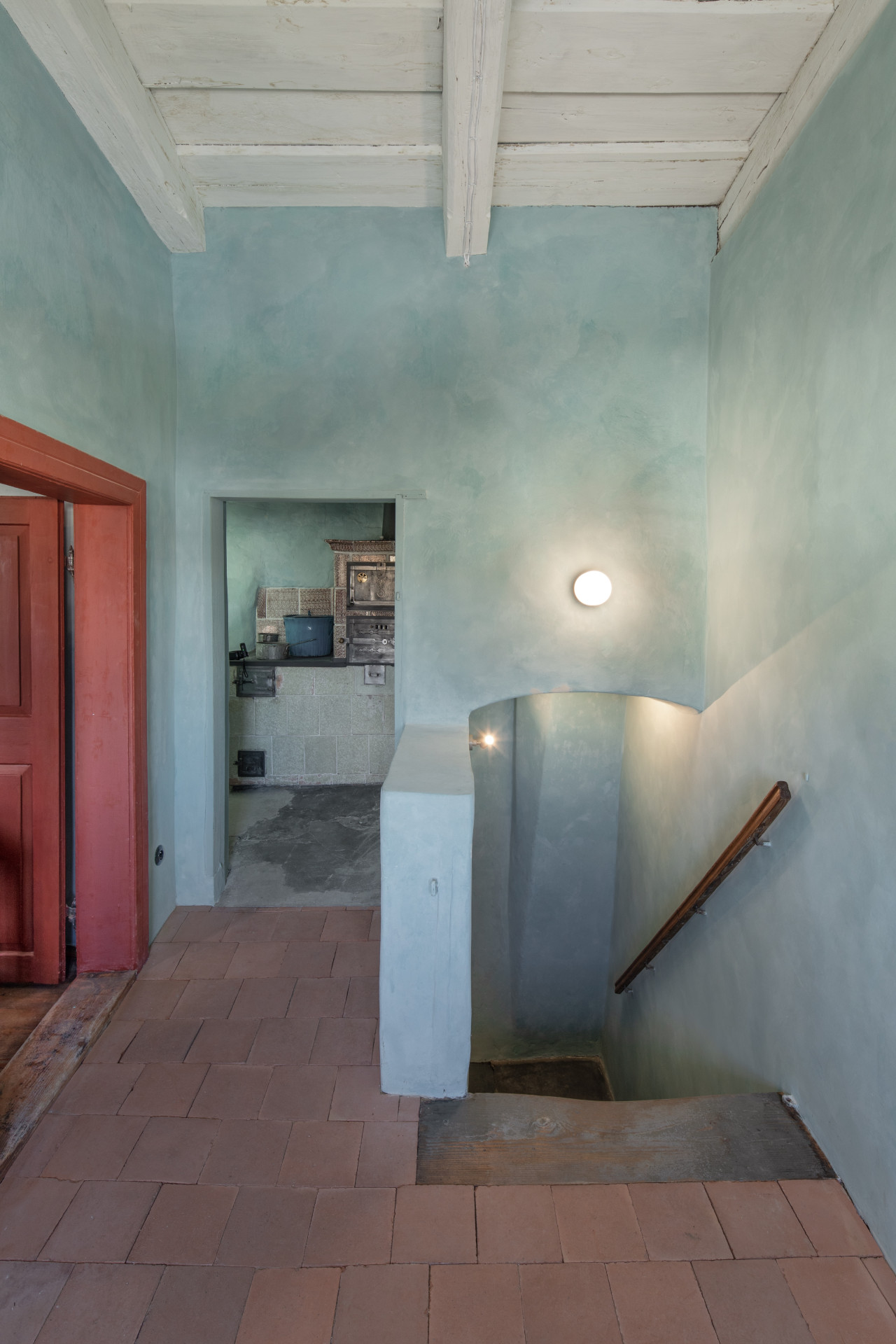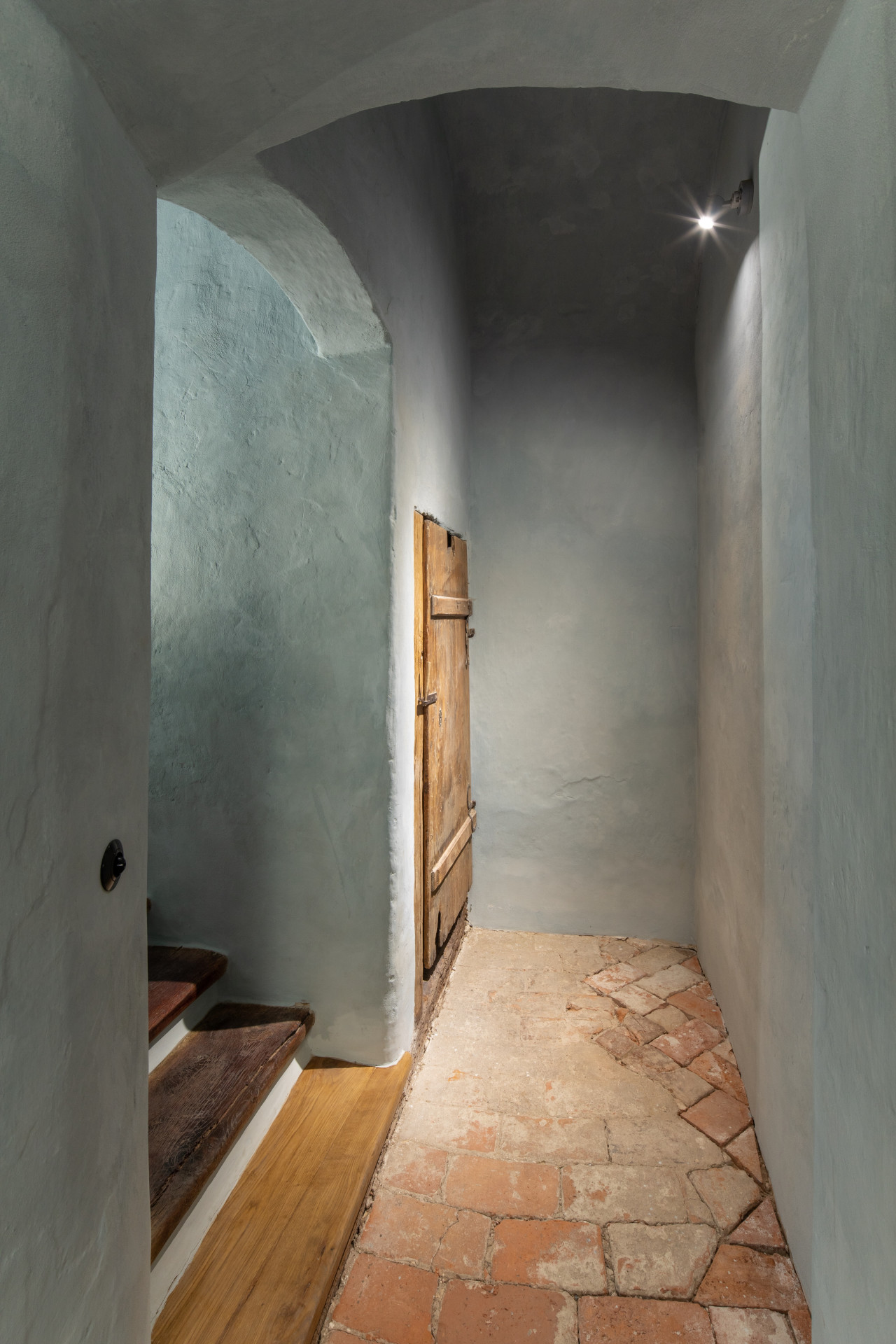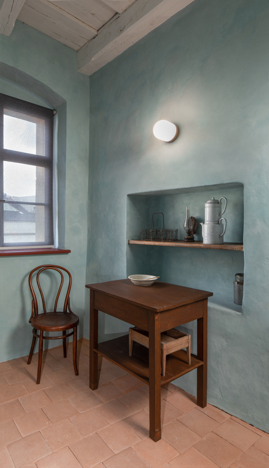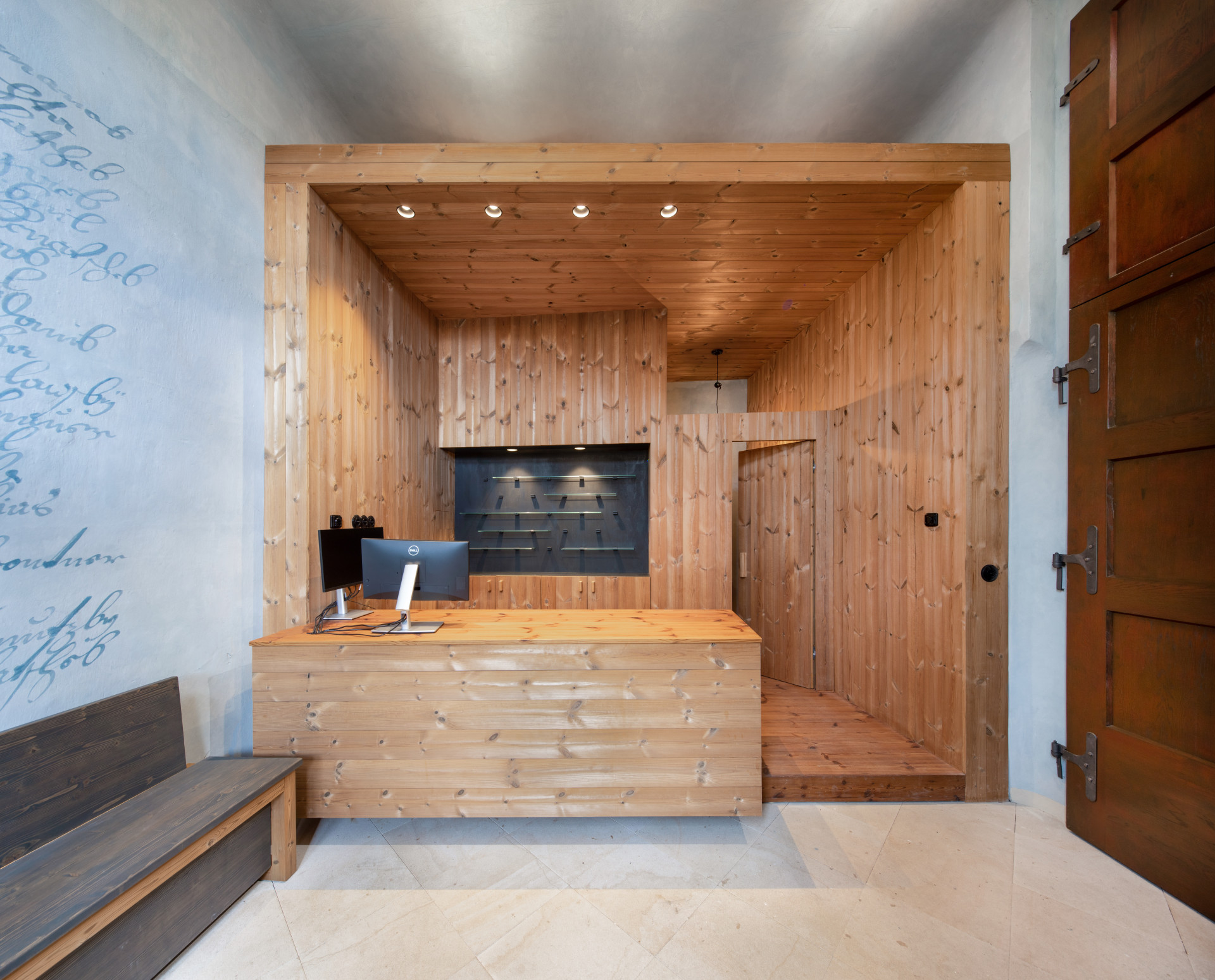K interiérovým zásahům architektka říká, že se děly za pomoci klasických materiálů – tedy masivního dřeva, pískovce, vápenné omítky a nátěrů. Množství původních dochovaných prvků – hlavně těch truhlářských a zámečnických – se restaurovalo. Vzhledem k tomu, že jde o kulturní památku stojící hned vedle zámku zapsaném na seznamu UNESCO, by to snad ani nemělo být jinak.