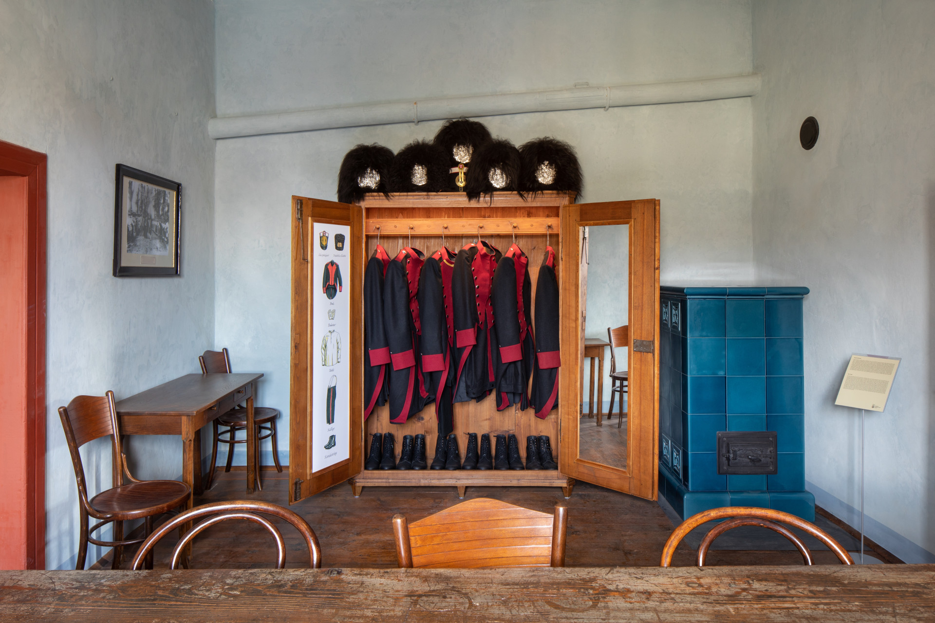 „Návštěvník se ocitá v autentickém prostoru, s dobovým nábytkem a vybavením, který může běžně použít – posadit se, listovat ve vystavených dokumentech, vyzkoušet si uniformu,“ popisuje charakter expozice architekta.