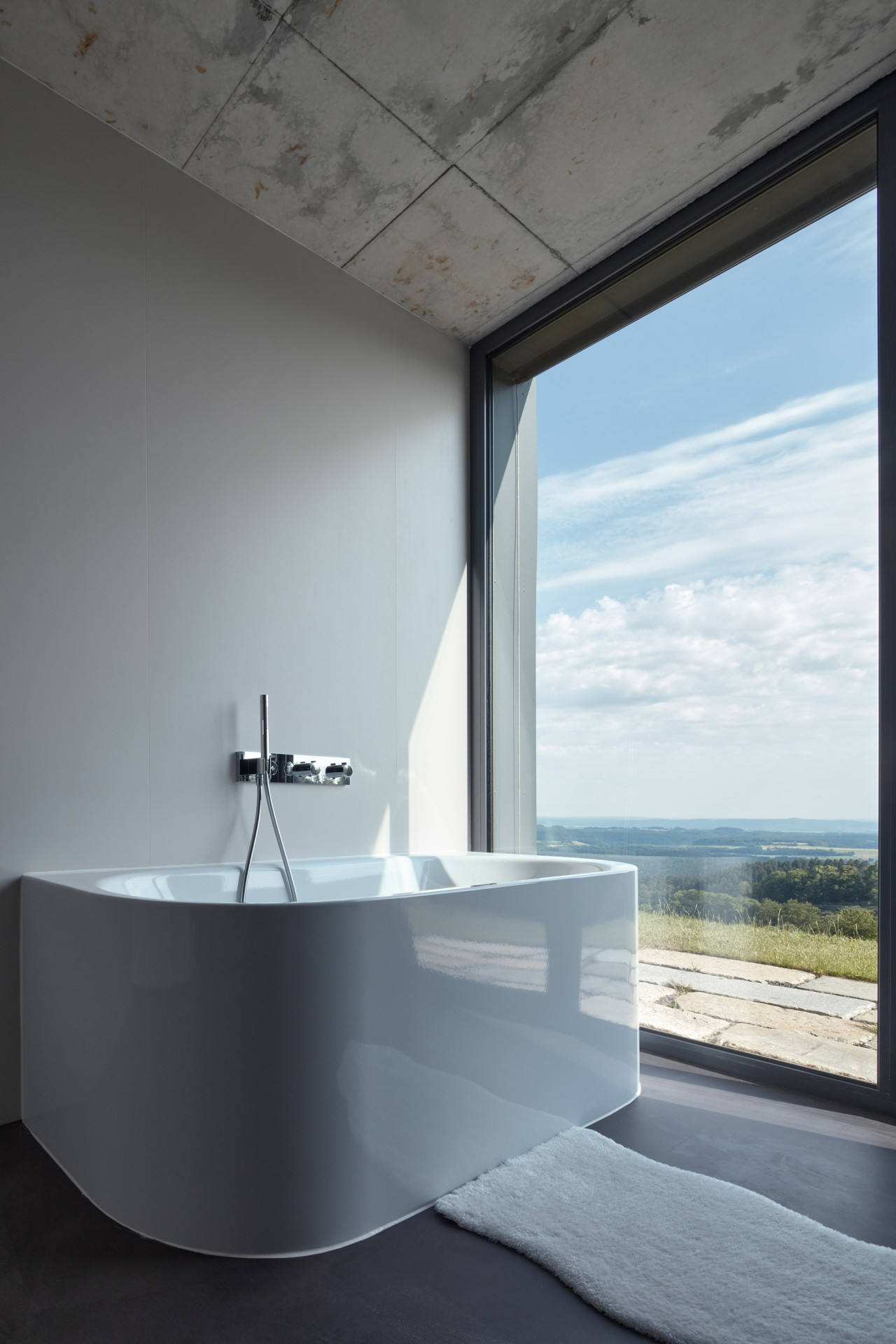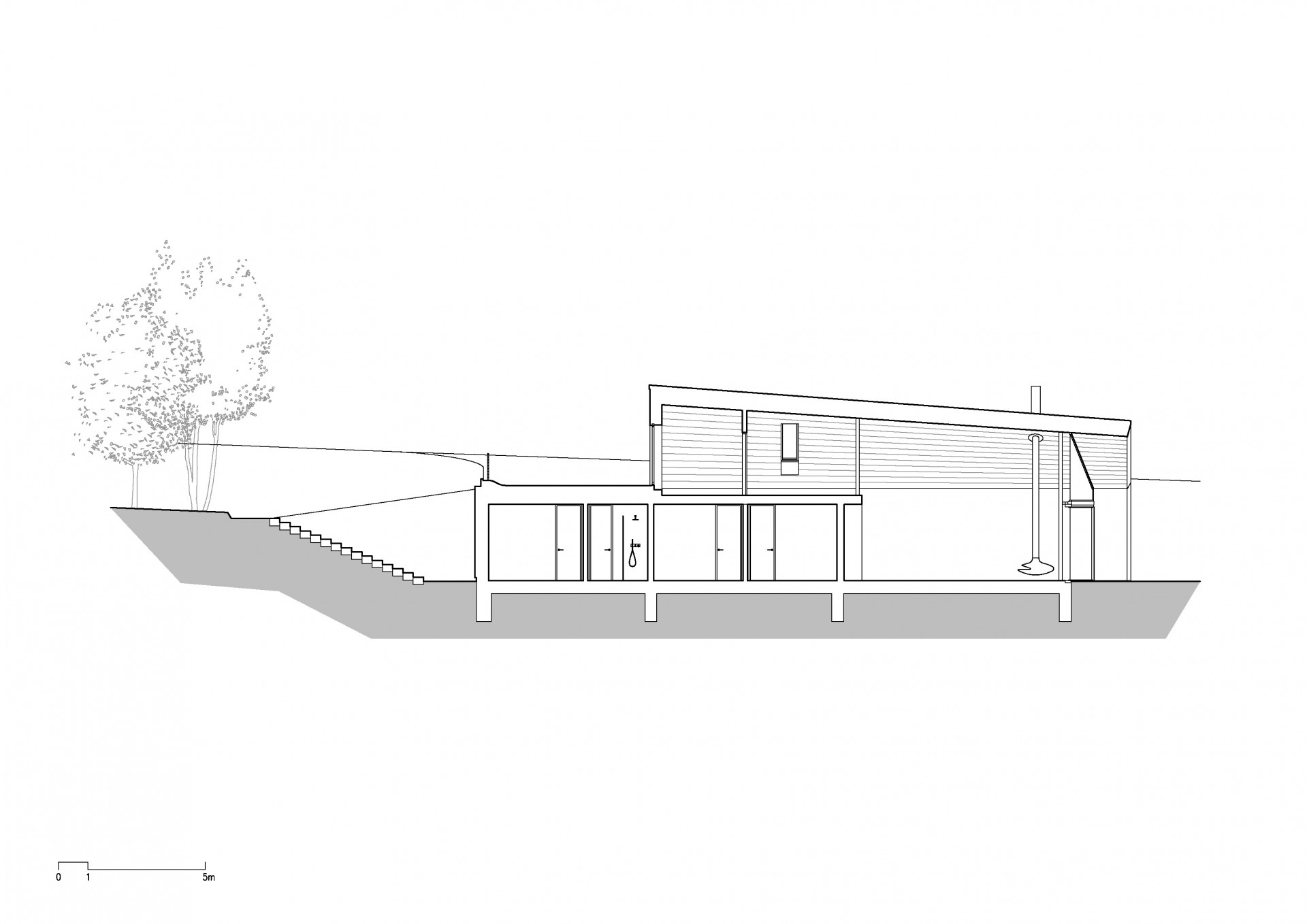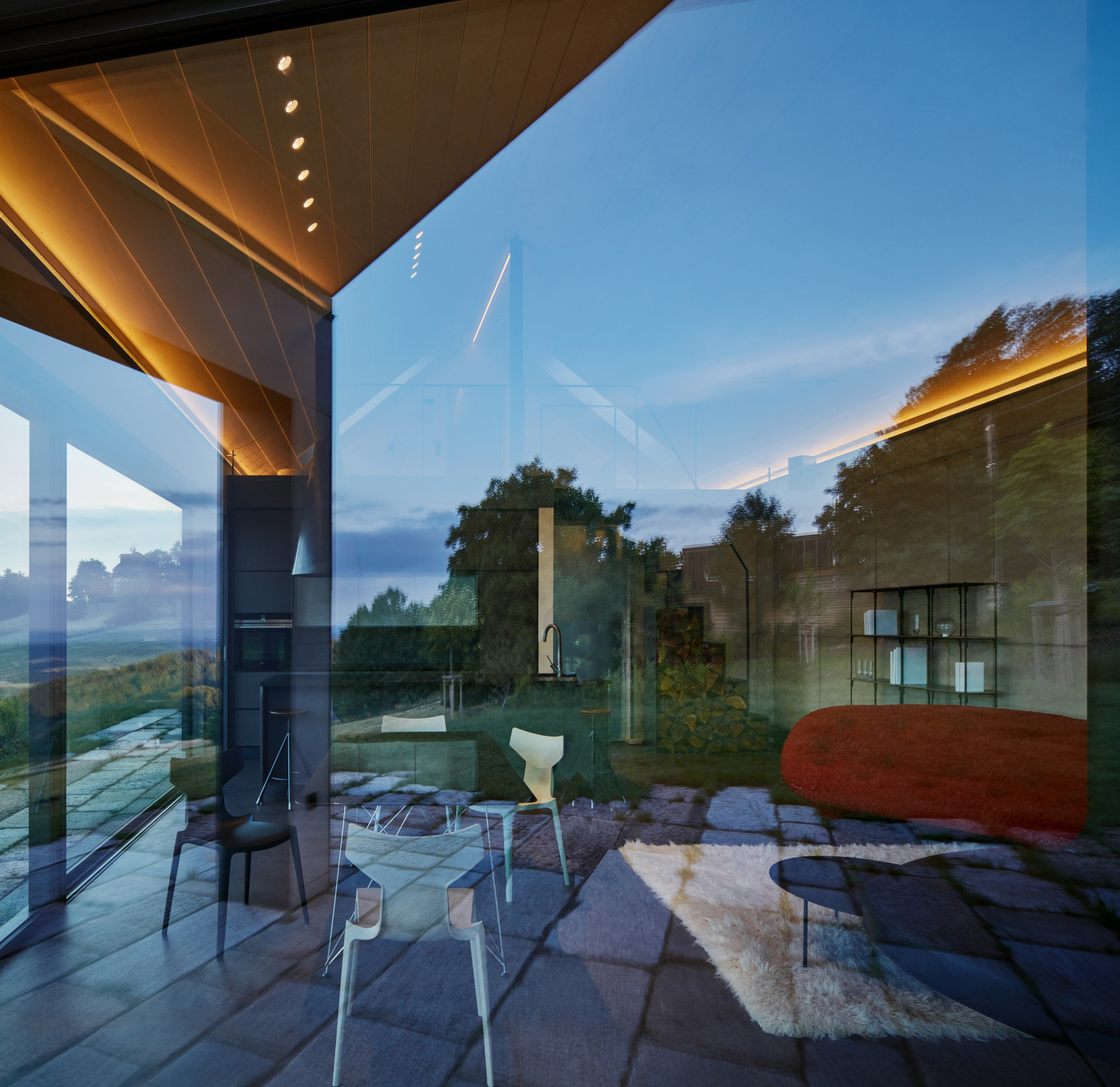 Velkoformátová posuvná okna pak pokračují i na zahradní průčelí, interiér je tak neustále v kontaktu s okolní přírodou a výhledem na krajinu Českého ráje. „Výhled a propojení vnitřních prostor s krajinou byl jedním z určujících motivů při navrhování domu. Rovněž všechny další obytné místnosti přízemí, včetně koupelny, se prosklenými otvory na jižní straně otevírají krajině,“ říkají autoři.
