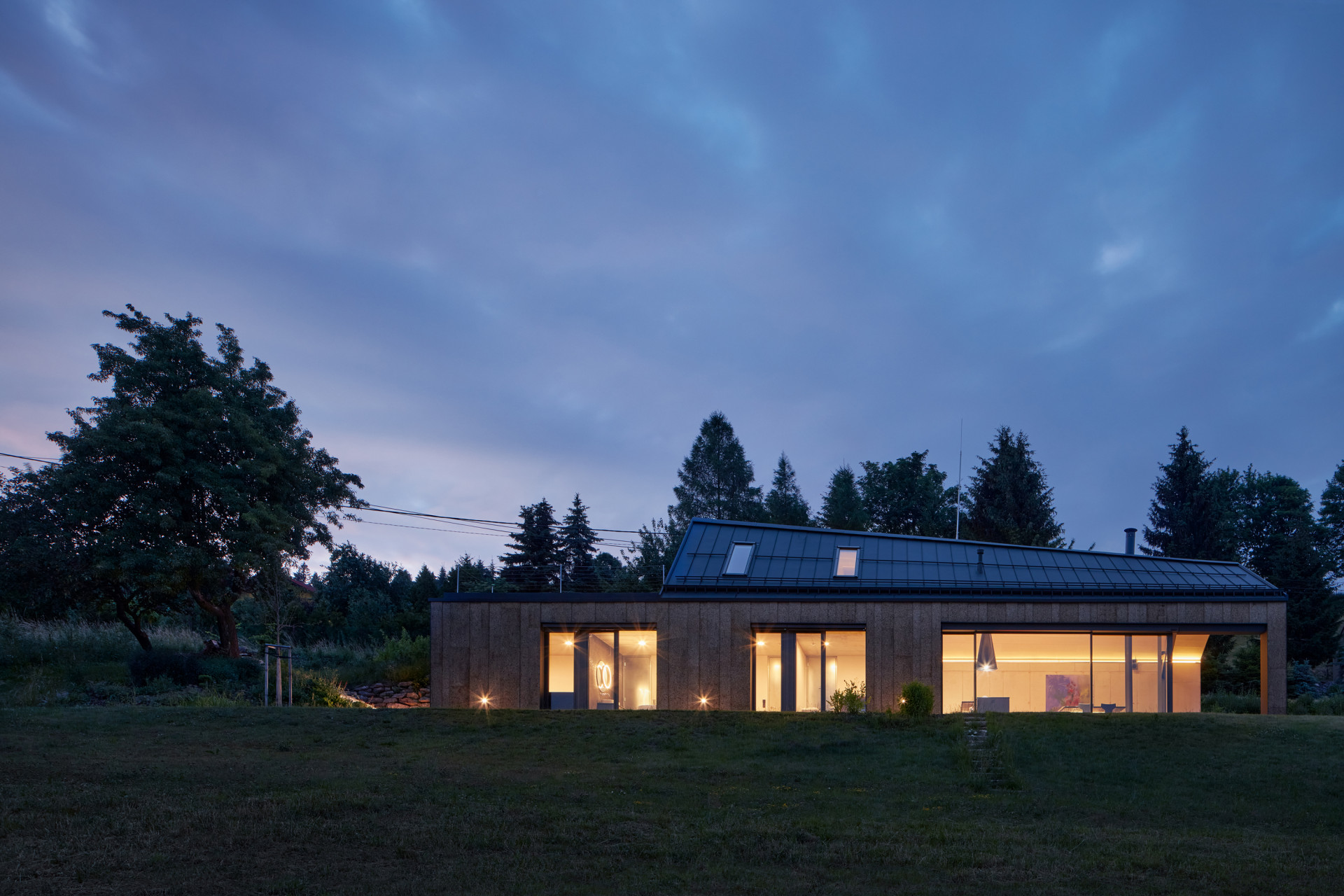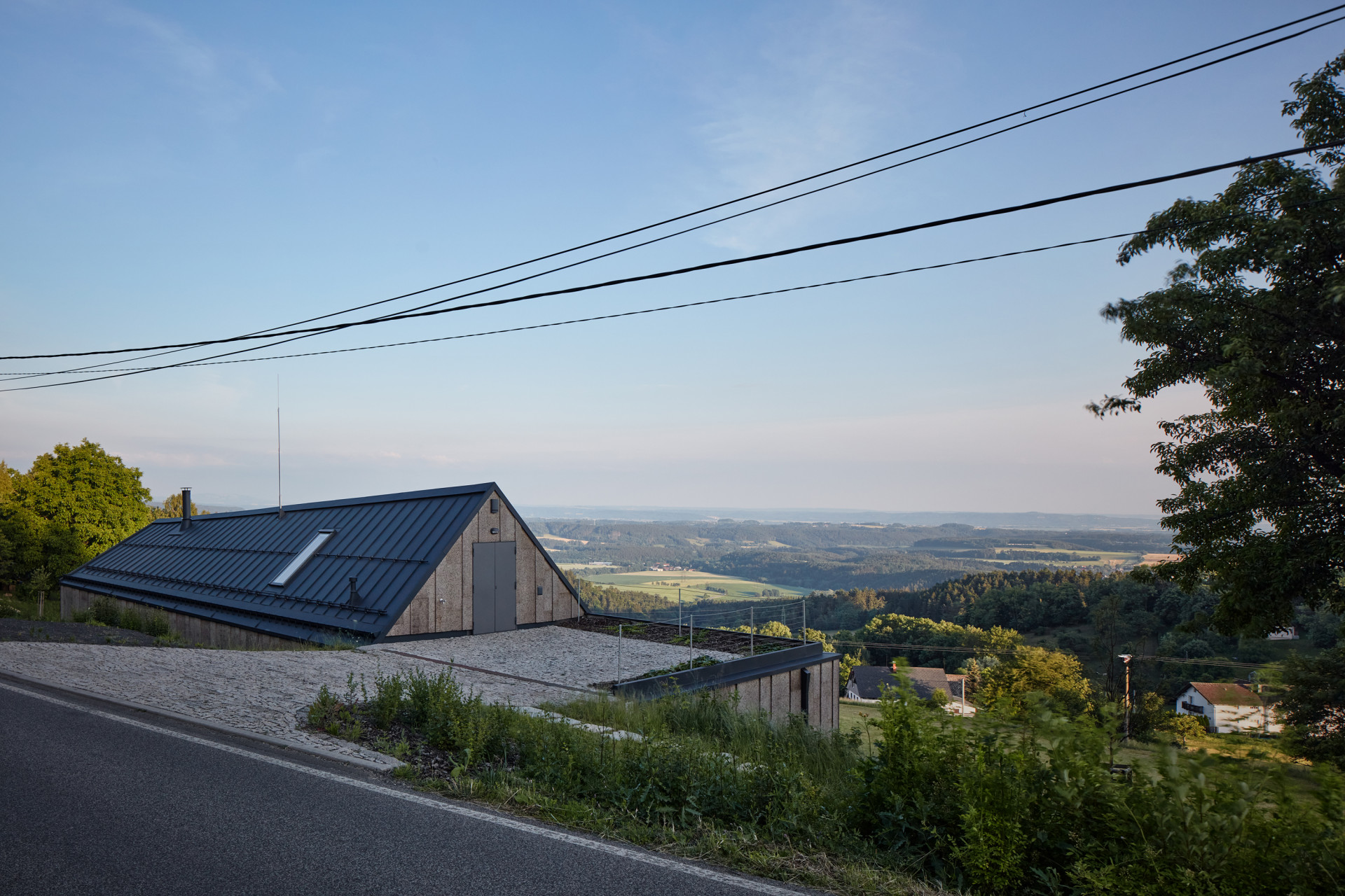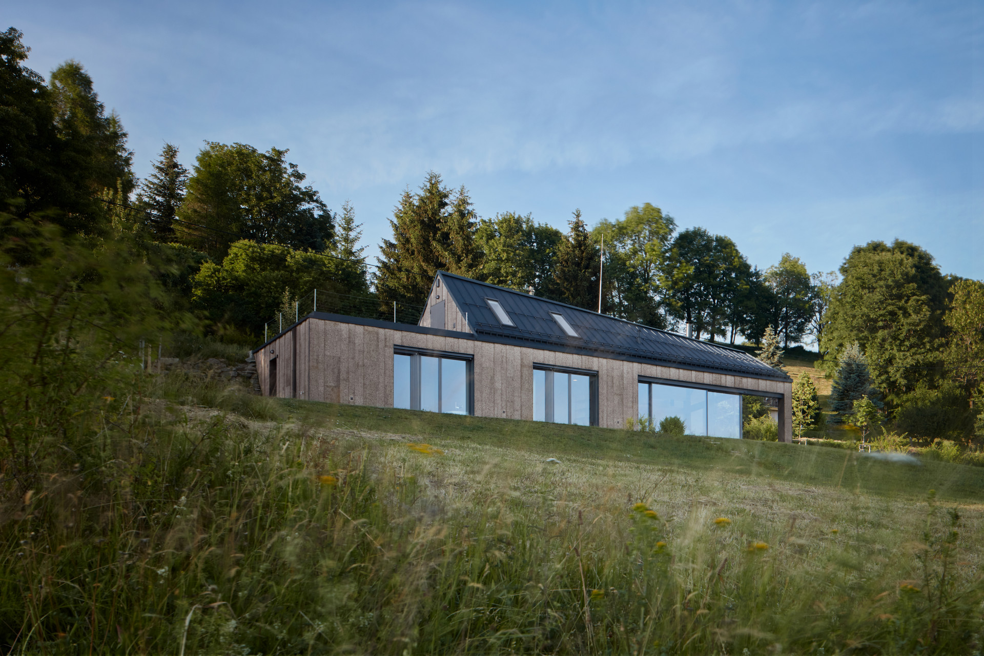 Rodinný dům od Atelieru SAD a designérky Ivety Zachariášové je nenápadný a výrazný zároveň. Jeho archetypální hmota posazená do svahu Ještědského hřbetu se skrývá za náspem silnice. Při průjezdu kolem je vidět pouze sedlová střecha s plechovou krytinou a fasáda obložená portugalským expandovaným korkem. „Tento materiál nebyl dosud v ČR takto použit,“ komentují situaci autoři.