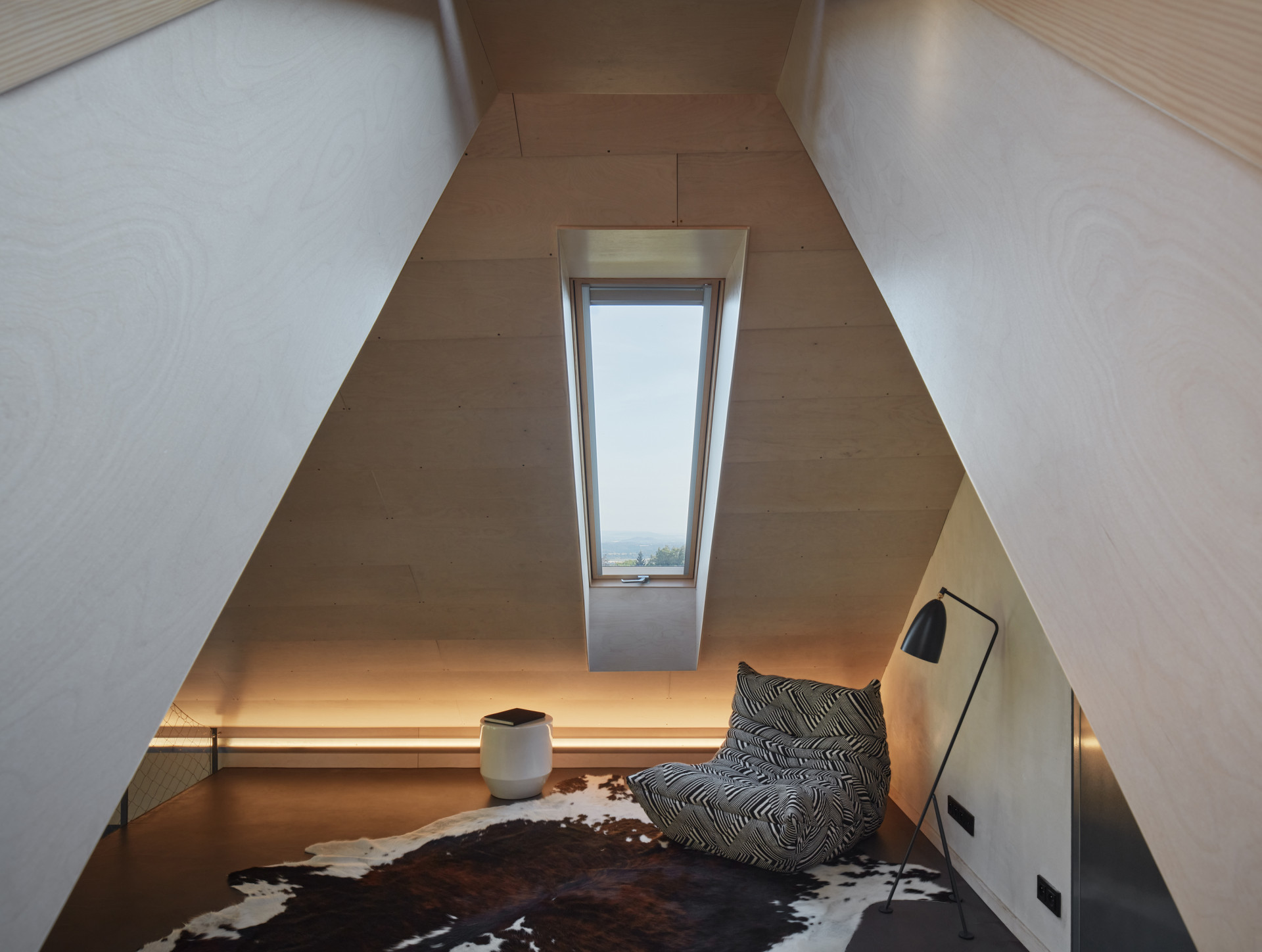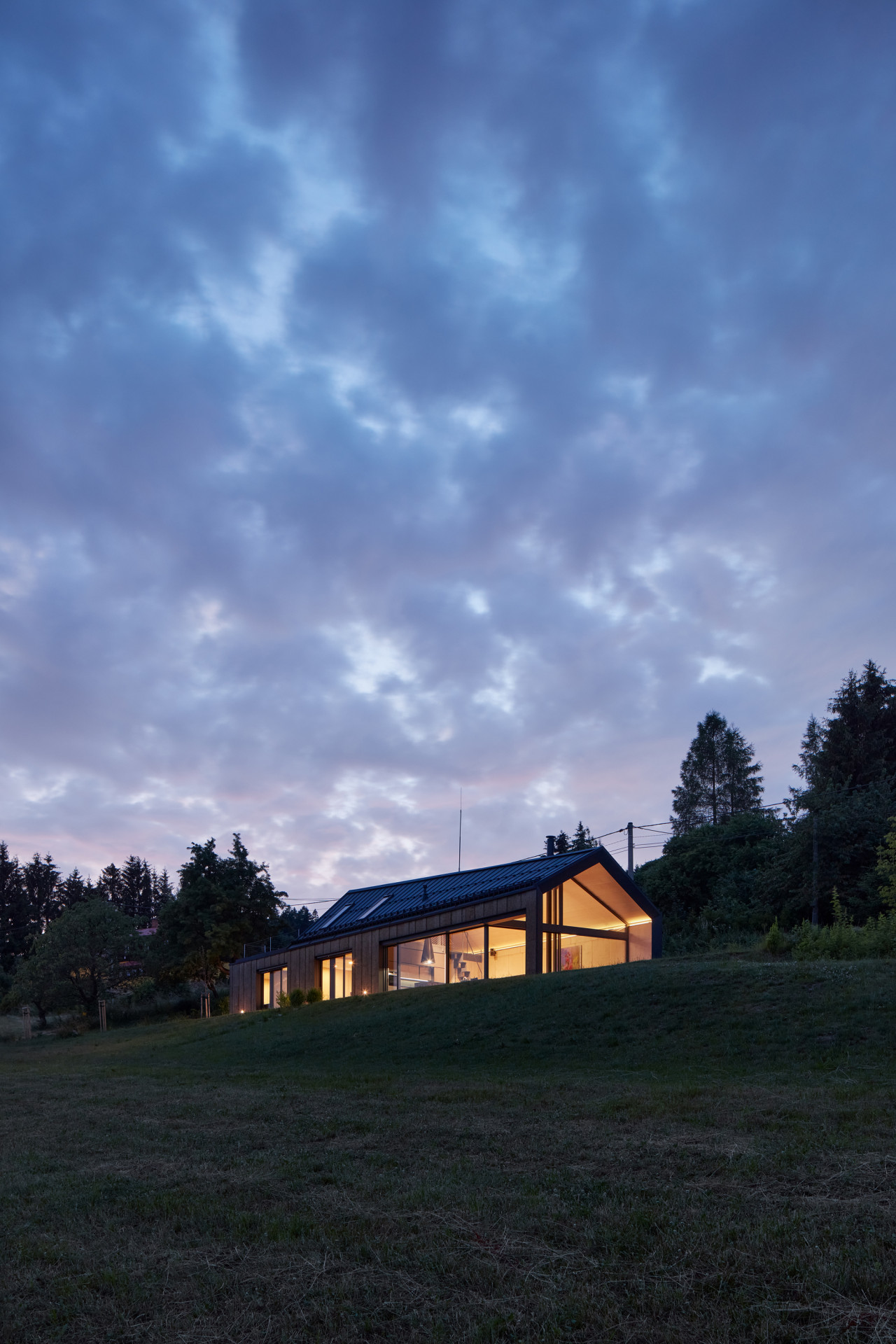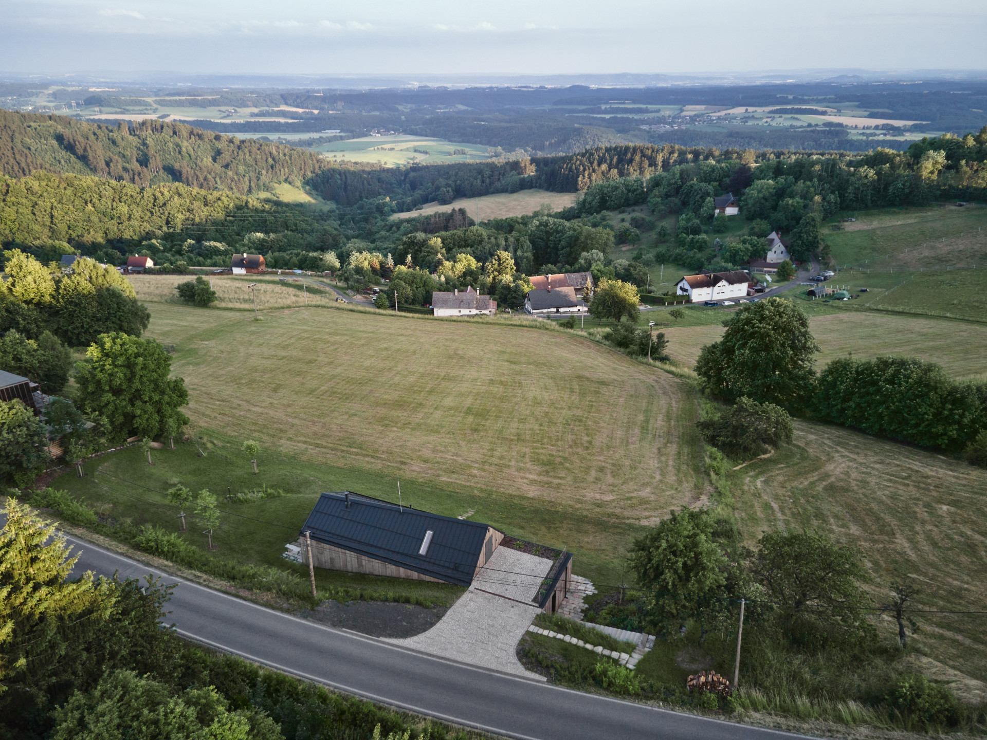 Rodinný dům od Atelieru SAD a designérky Ivety Zachariášové je nenápadný a výrazný zároveň. Jeho archetypální hmota posazená do svahu Ještědského hřbetu se skrývá za náspem silnice. Při průjezdu kolem je vidět pouze sedlová střecha s plechovou krytinou a fasáda obložená portugalským expandovaným korkem. „Tento materiál nebyl dosud v ČR takto použit,“ komentují situaci autoři.