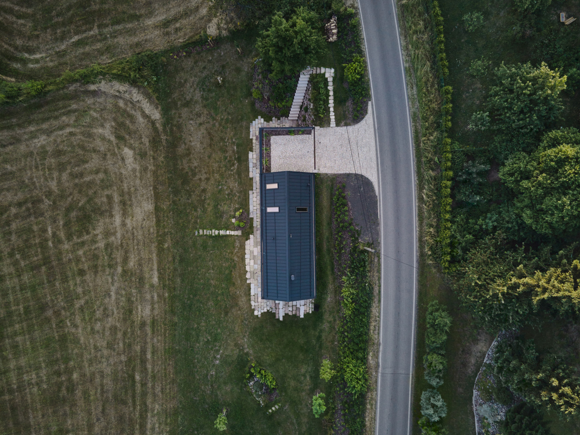 Adam Jirkal a Tomáš Kubák z Atelieru SAD popisují, že chtěli dům koncipovat tak, aby do svého prostředí co nejlépe zapadl. Vedle tradiční siluety mu však vtiskli také několik ozvláštnění. Například východní štítovou stěnu nechali kompletně otevřít. Místo železobetonu, ze kterého byl dům na místě odlit jako monolit, použili sklo. Okna zasazená v subtilních profilech rafinovaně ustupují a přesah stěn a střechy tvoří přístřešek nad venkovní terasou.