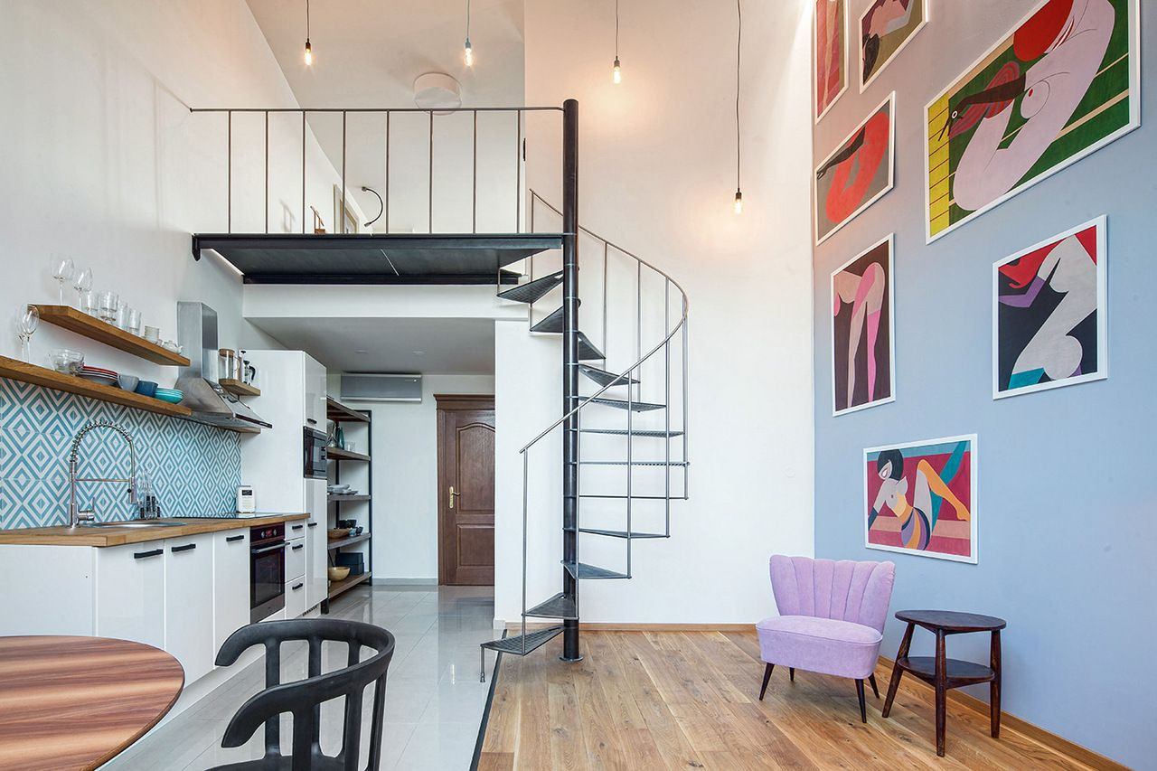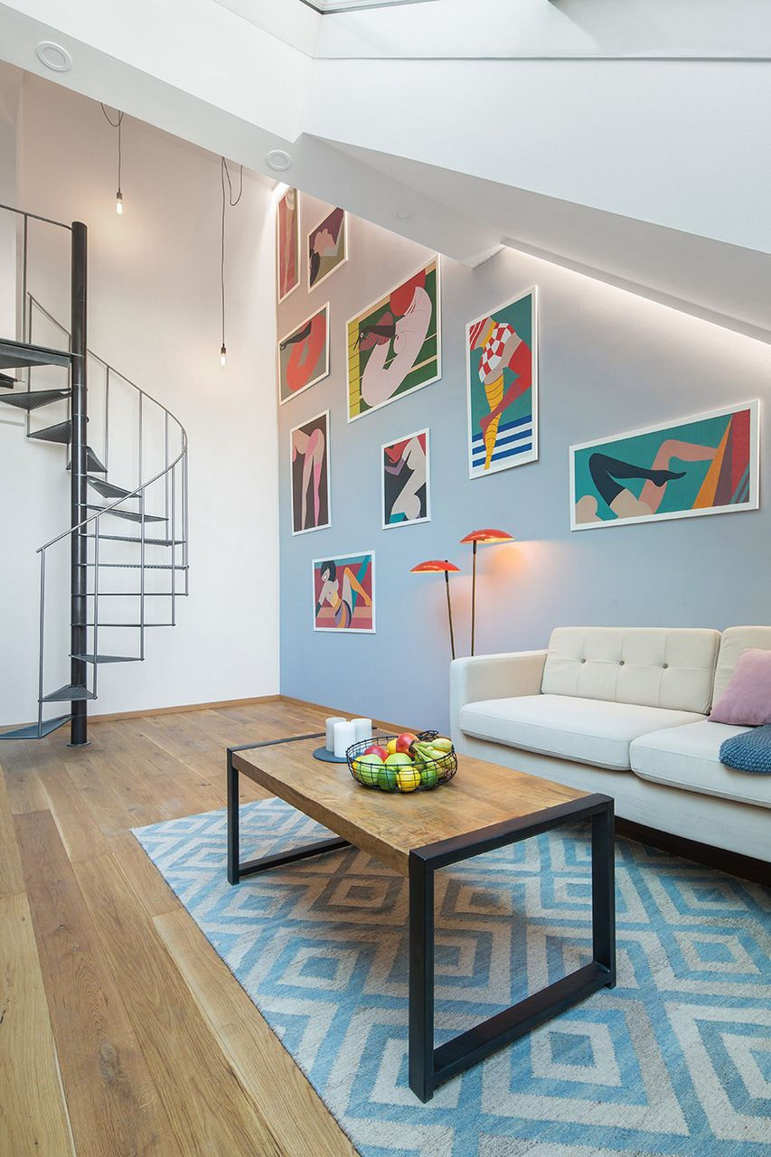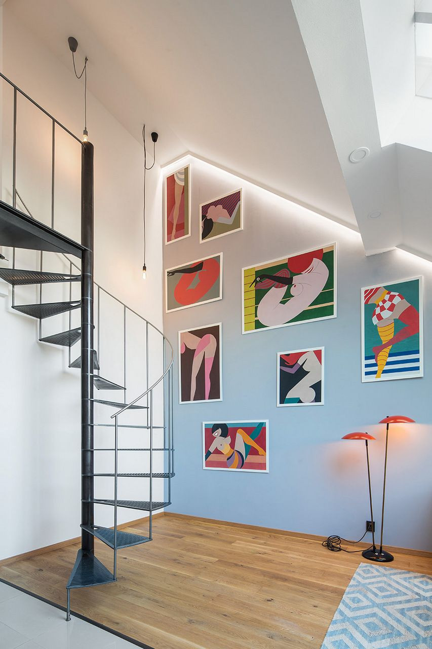 Rekonstrukcí mezonetového bytu s terasou v nejvyšším patře secesního bytového domu v Praze na Smíchově bylo docíleno většího prosvětlení a rozšíření obytné plochy. Interiér, vybavený retro nábytkem, sjednocují pastelové barvy povrchů stěn a obkladů a v symbióze s prostorem působí i početná výtvarná díla.