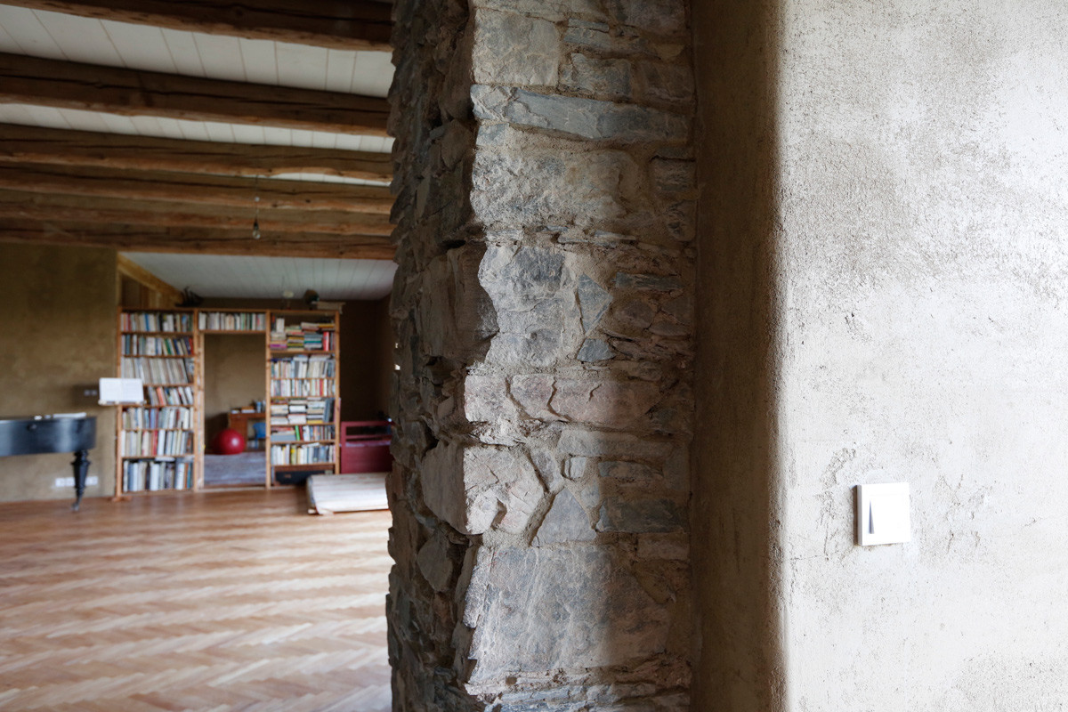 Stodola má kamenné zdi, devět metrů dlouhé trámy a je extrémně velká. „Kdybych to porovnávala s panelovým bytem jedna + kk, tak stodola je asi desetinásobná,“ říká Naďa Klimešová. Do velké plochy Klimešovi vestavěli pohodlný byt, každý tu má pracovnu, děti svoji dětskou sekci a koncertní křídlo se tu skoro ztratí.
