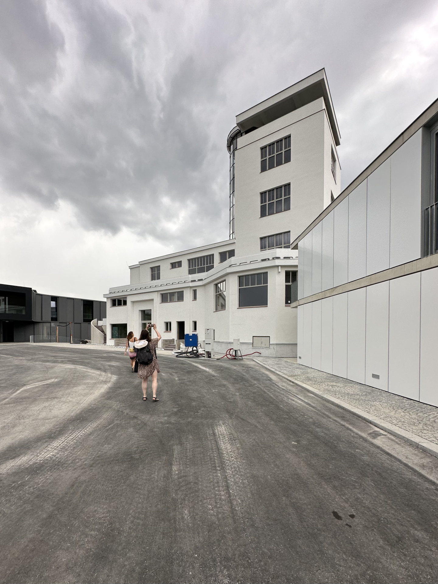 Větší dům má čtyřicet pět bytů, má tmavou kovovou fasádu a půdorys lichoběžníku. Podle architektů má kontrastovat s oblou bílou vlnovkou.