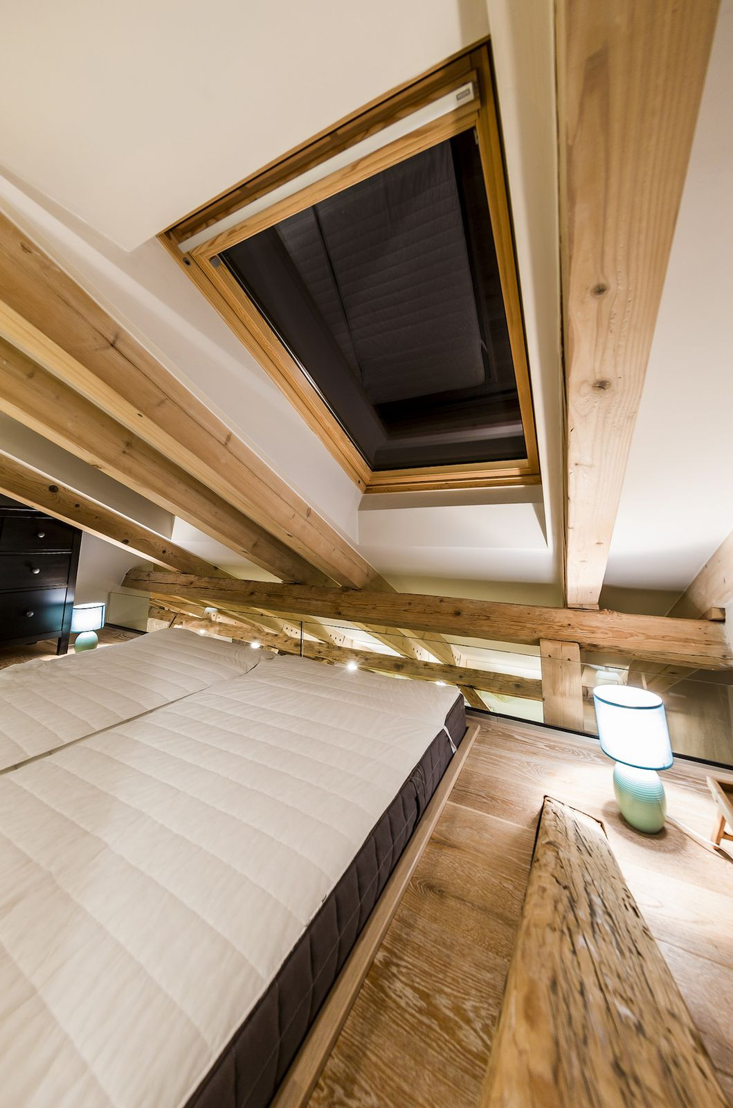 Navzdory zachování původního charakteru podkroví s odkrytými nosnými trámy prostor zároveň reprezentuje představu moderního bydlení. Na některých místech se ponechalo původní dřevo, jinde ztrouchnivělé trámy nahradily nové. Pro co nejvyšší kvalitu řemeslné práce architekti přizvali firmu J.M.J.Pro. „Bratři Šariští se dlouhodobě zabývají rekonstrukcemi historických památek. Jeden z nich dokonce studoval práci s dřevem u mistrů tesařů v Japonsku. Jejich profesionalita a zaujetí pro práci se naplno projevily i tady. Pokaždé si dokázali citlivě poradit i se zdánlivě neřešitelnou situací. Spolupráce s nimi byla opravdu na vysoké úrovni.“