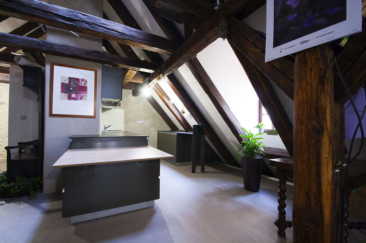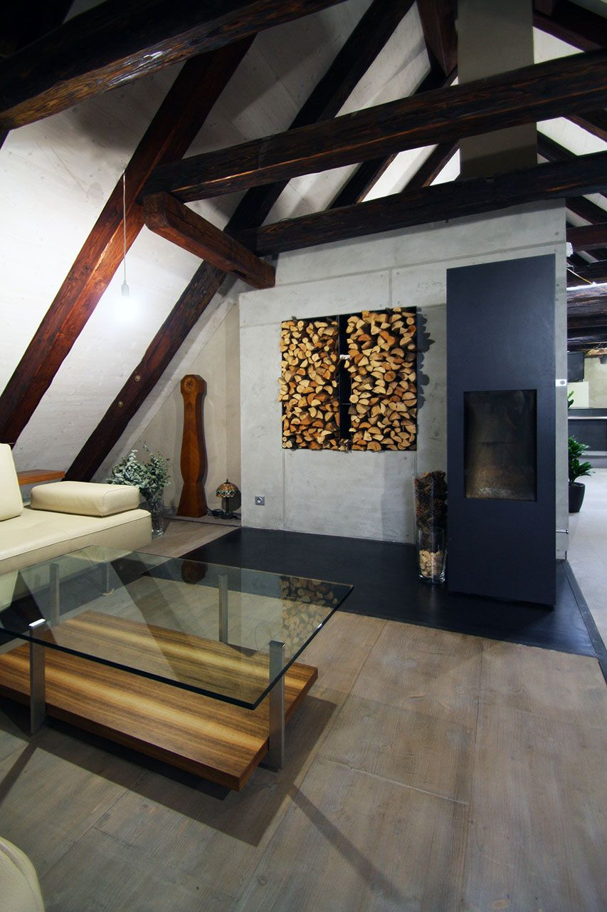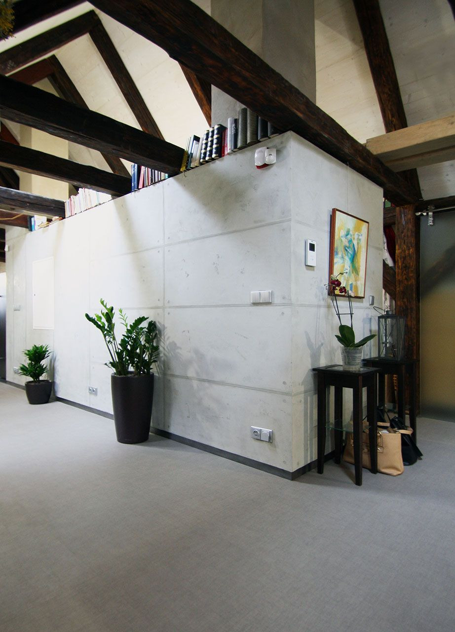 Druhé podkroví tohoto týdne, tentokráte na pražské barokní faře v Konviktské, kde si umělecky založený klient přál vytvořit otevřený byt pro dva, přestože výška krovu a plocha by umožňovala vestavět i patro a více samostatných pokojů. Výsledkem je skutečně velkoryse pojatý prostor.