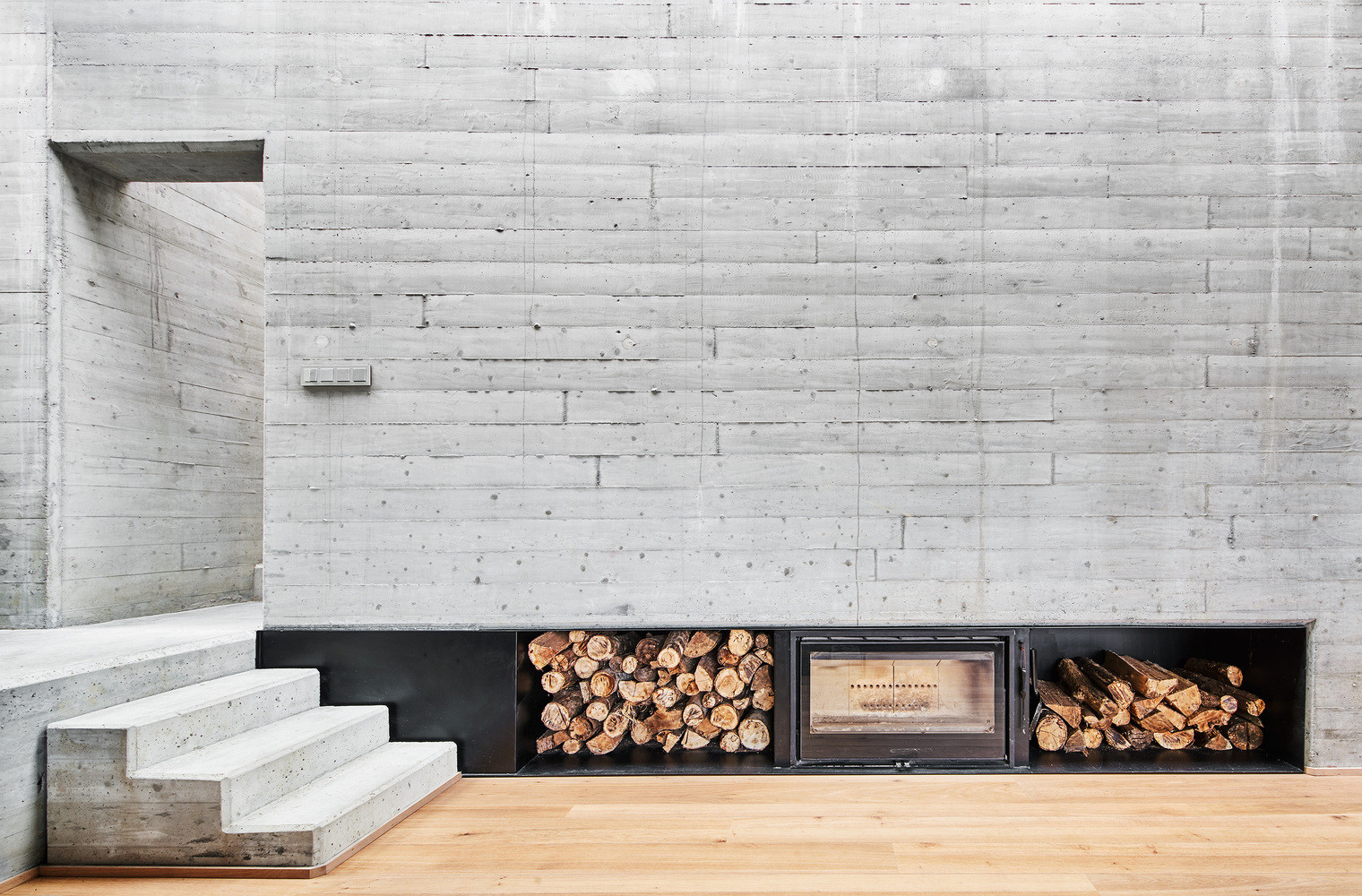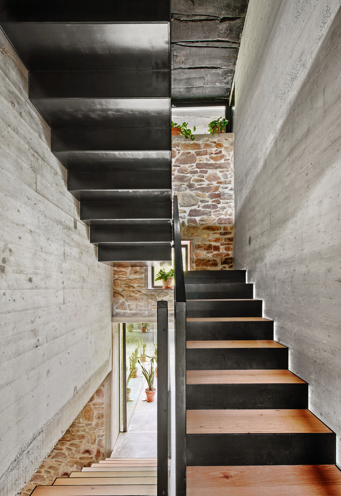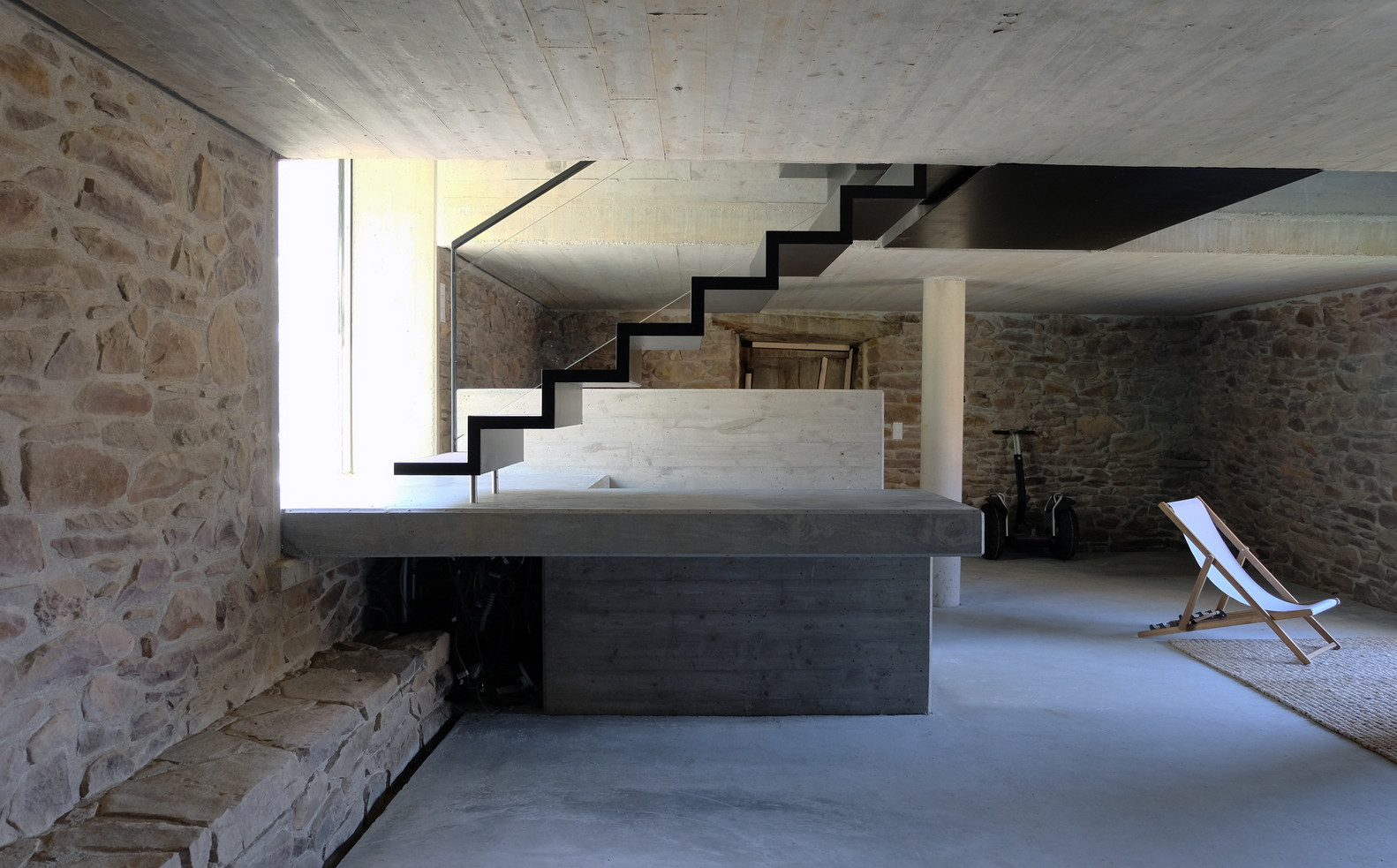 Trochu nečekaně se ale beton objevuje také na stěnách a stropech starého stavení, jehož kamenná fasáda tak působí pouze jako jakási obálka odkazující k historii a poctivé řemeslné tradici místního stavitelství.