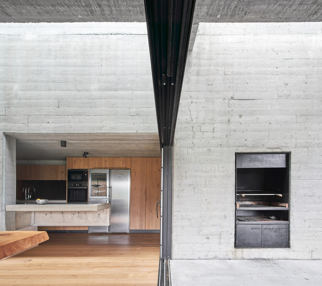 V neposlední řadě pak betonu a sklu směle sekunduje dubové dřevo, které je, jakožto místní materiál, použito na podlahách, vestavěném nábytku či masivní desce jídelního stolu.