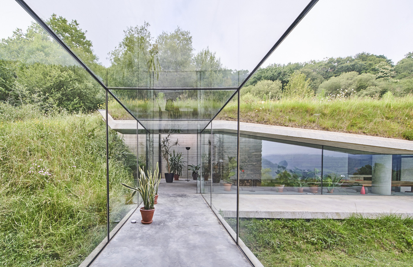 Míříte-li k domu po příjezdové cestě, vidíte před sebou nejprve pouze starý kamenný dům se sedlovou střechou, kterých se po okolí nachází bezpočet. Jak se však člověk přibližuje, objevuje stále nové podněty vzbuzující jeho pozornost. Nejprve je možné rozeznávat obrysy skleněného tubusu, který jako by spojoval objekt se samotným svahem za ním, poté se v trávě objeví stezka z pravidelných kamenných bloků a nakonec se dostaví největší překvapení v podobě podlouhlé betonové dutiny vyčnívající přímo ze svahu.