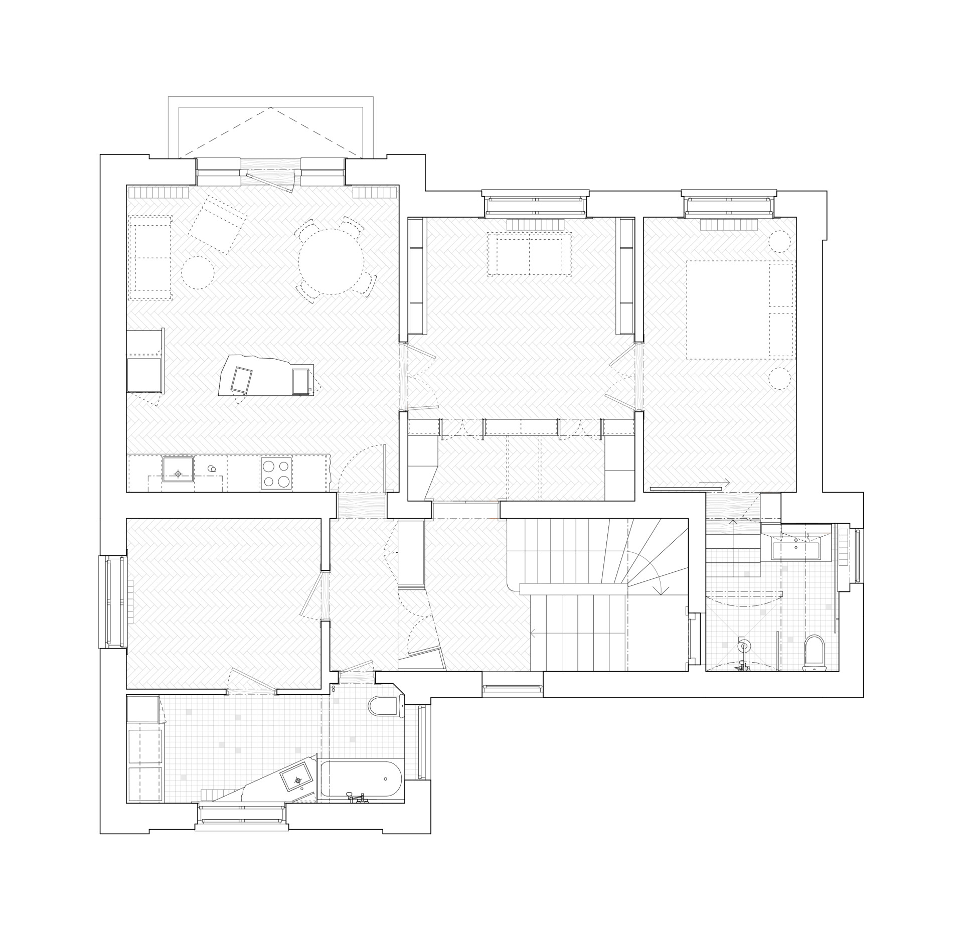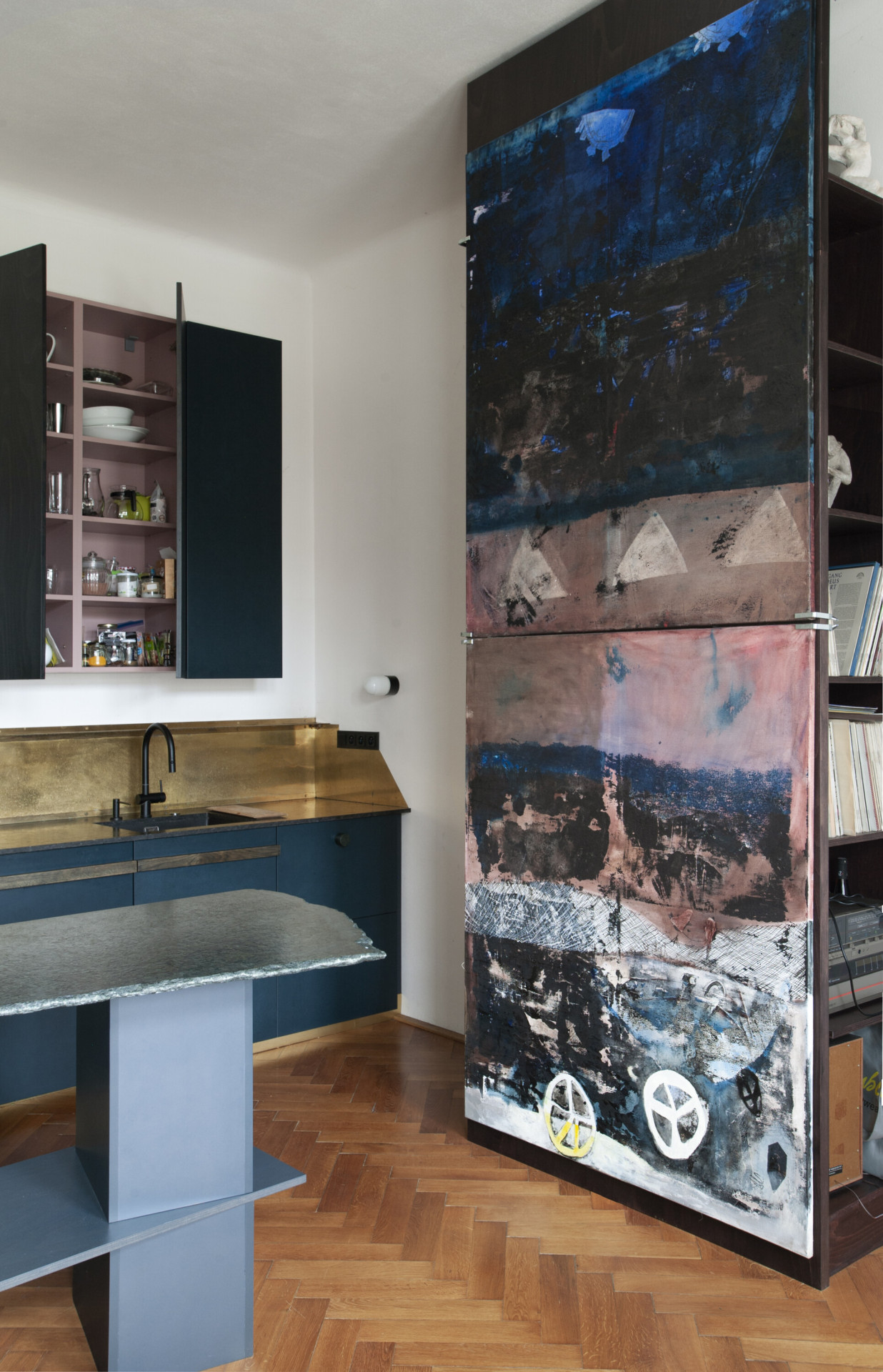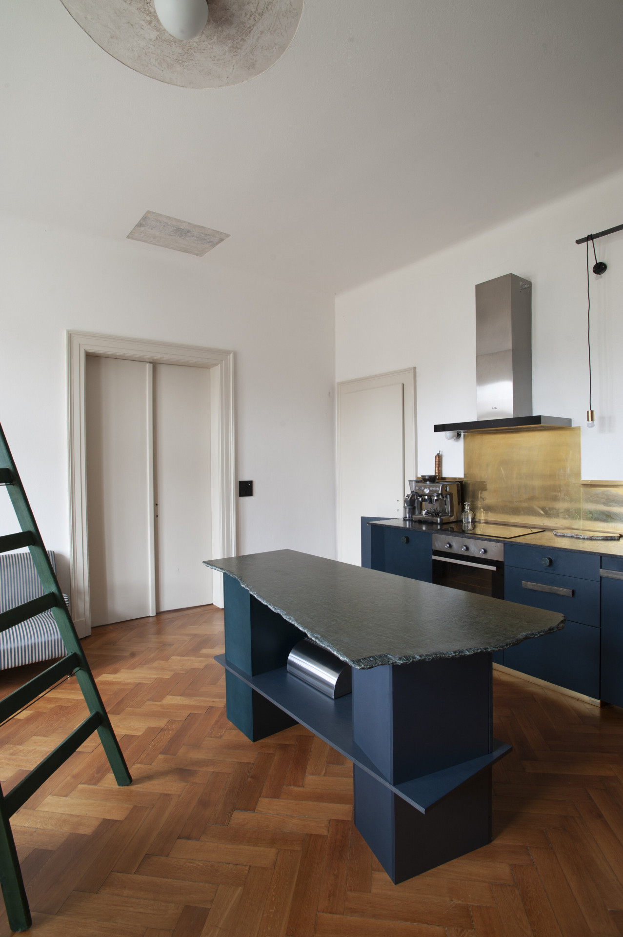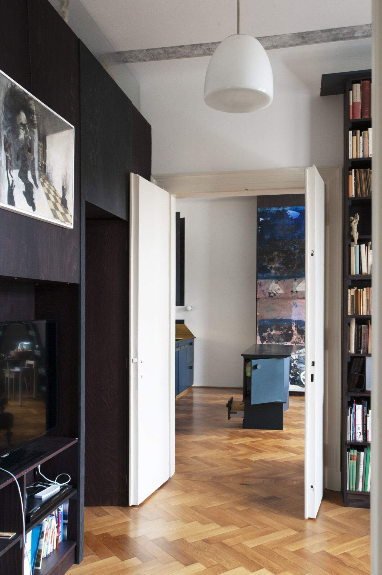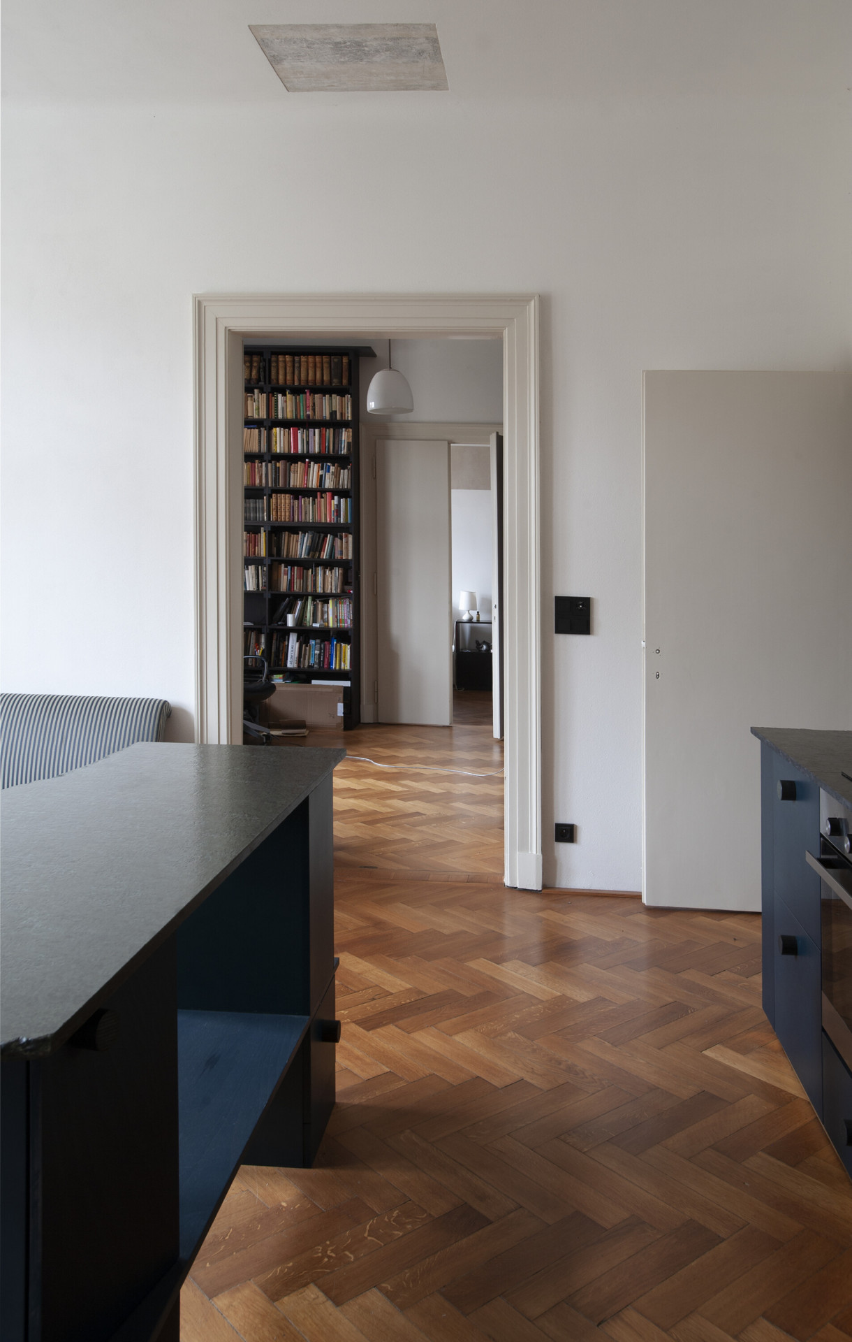 Dispozice bytu byla z velké části zachována, především koncepce třech hlavních průchozích místností vytvářejících plynulou enfiládu. V první místnosti vznikla nově obytná kuchyně, které dominuje centrální kuchyňský ostrov nepravidelného organického tvaru. Tento objekt balancující na pomezí sochy a užitého designu je umístěn přímo na centrální osu dveří, čímž posiluje motiv enfilády a prostorové sekvence třech místností. V dalších místnostech se uprostřed nachází pracovna s novou knihovnou a dvěma oddělenými šatnami a ložnice s nově přístupnou koupelnou se sprchovým koutem. Sekundární zóna bytu obsahuje prostornou koupelnu s pračkou a rezervní pokoj pro hosty nebo budoucí potomky