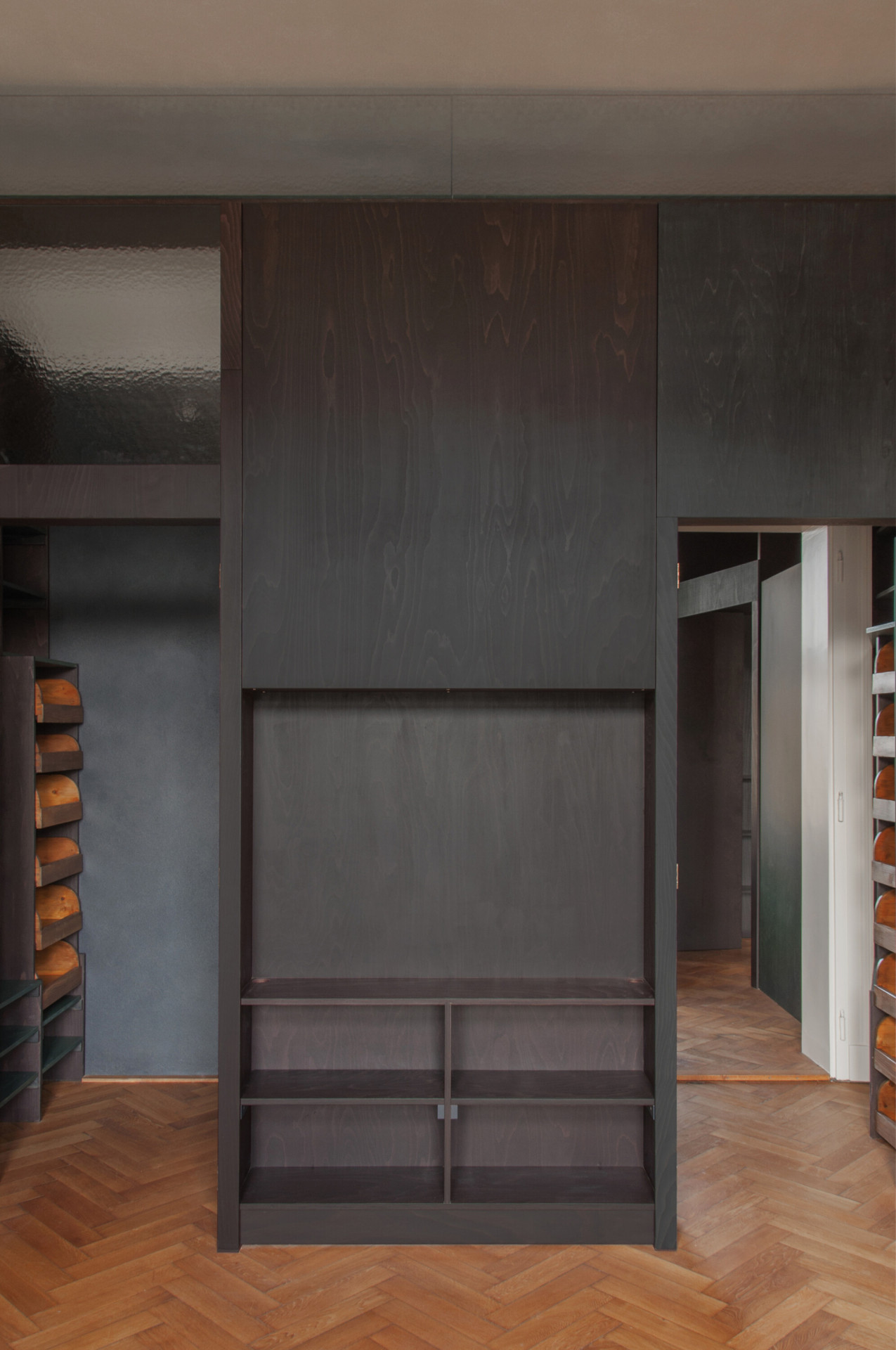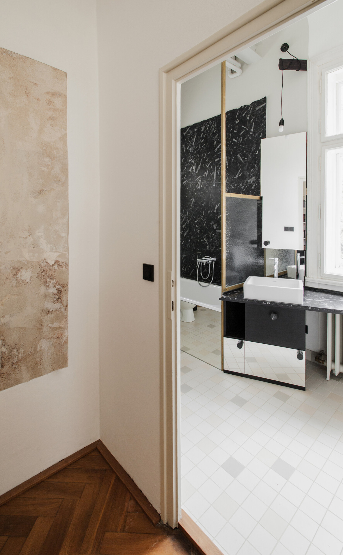 „Dělící stěna je hluboká a zajišťuje dostatek potřebného úložného prostoru při vstupu do bytu. Její geometrie je mírně zešikmená a natáčí zrcadlovou plochu do těžiště podesty. Stává se objektem, sochou, která sebevědomě a zároveň s pokorou ke stávajícímu interiéru vytváří prostorové napětí a zachovává velkorysost haly,“ upřesňují architekti.