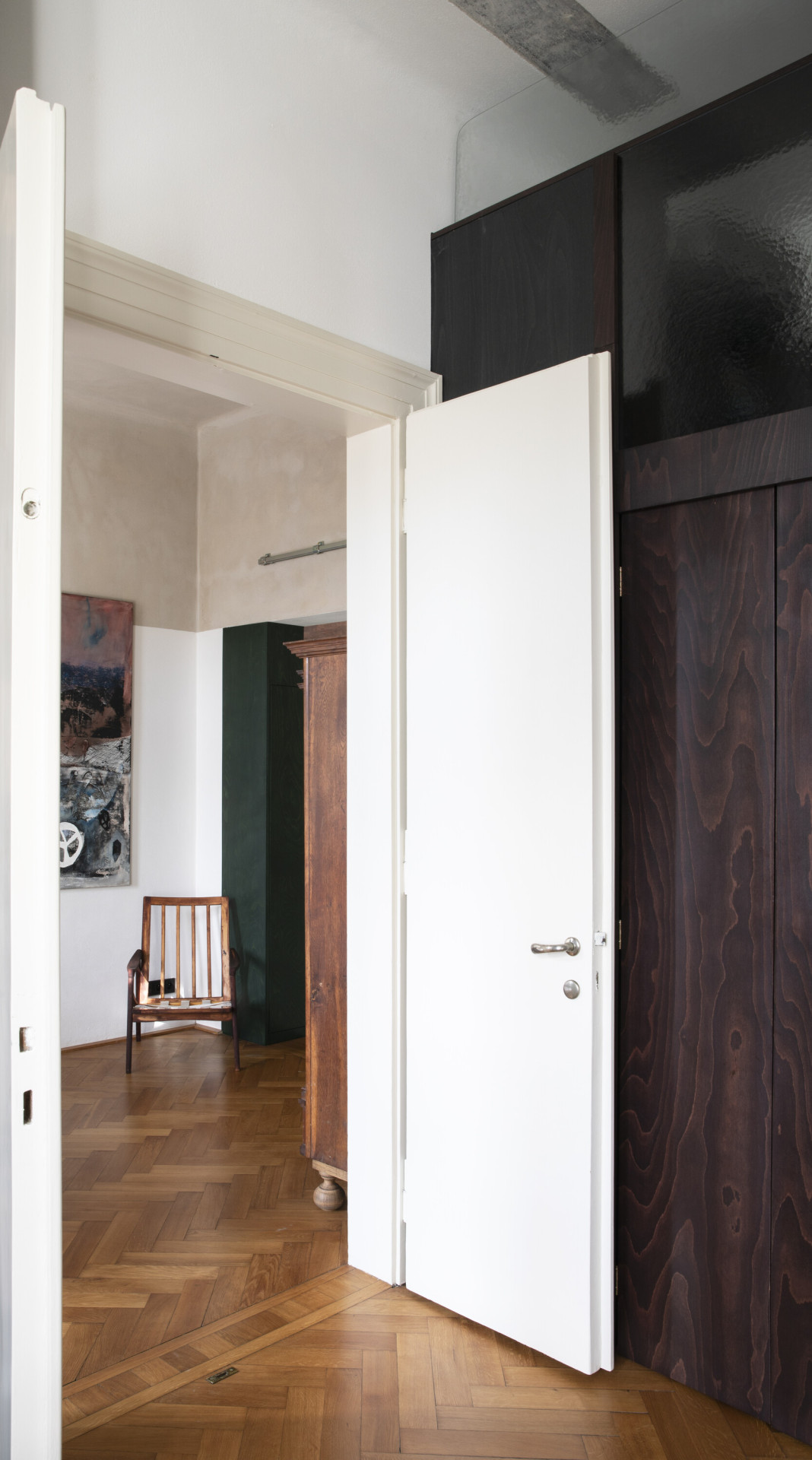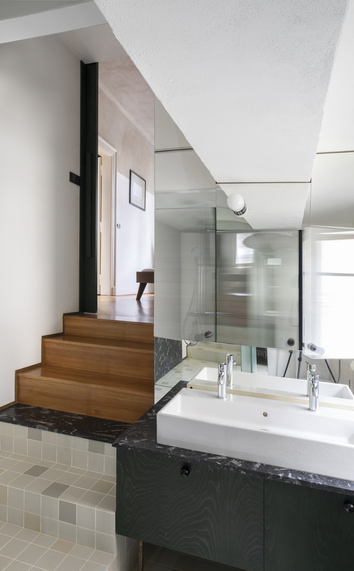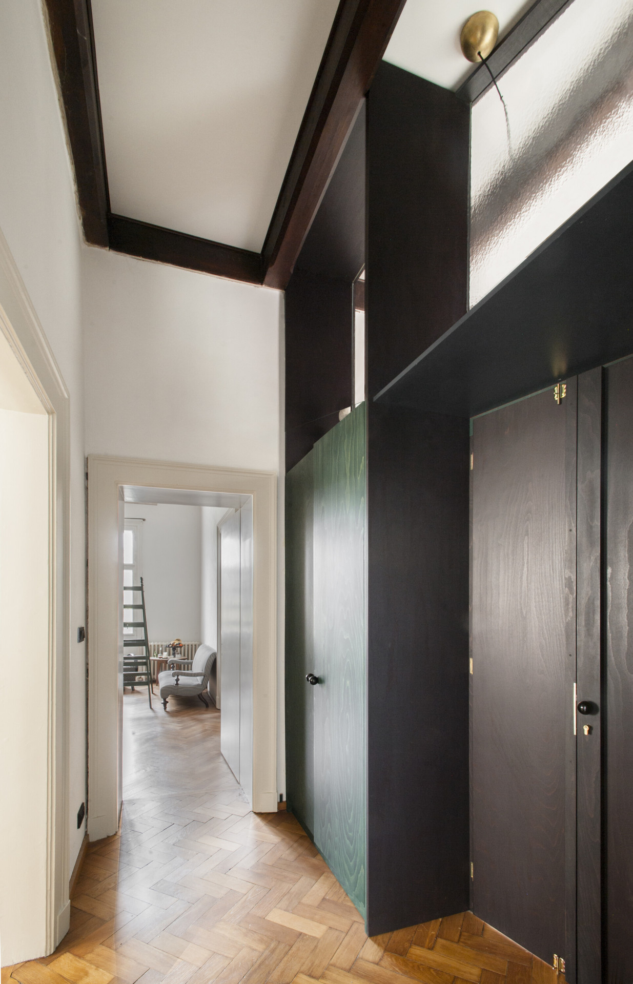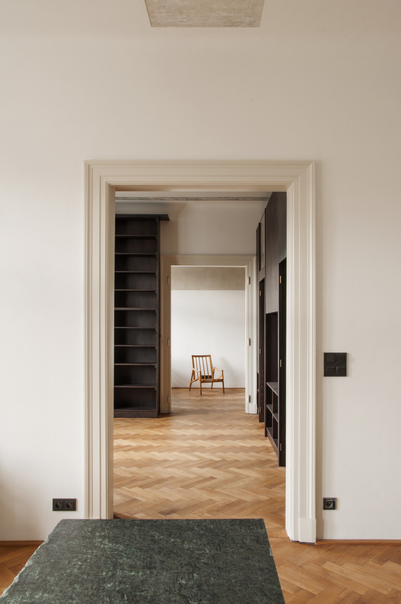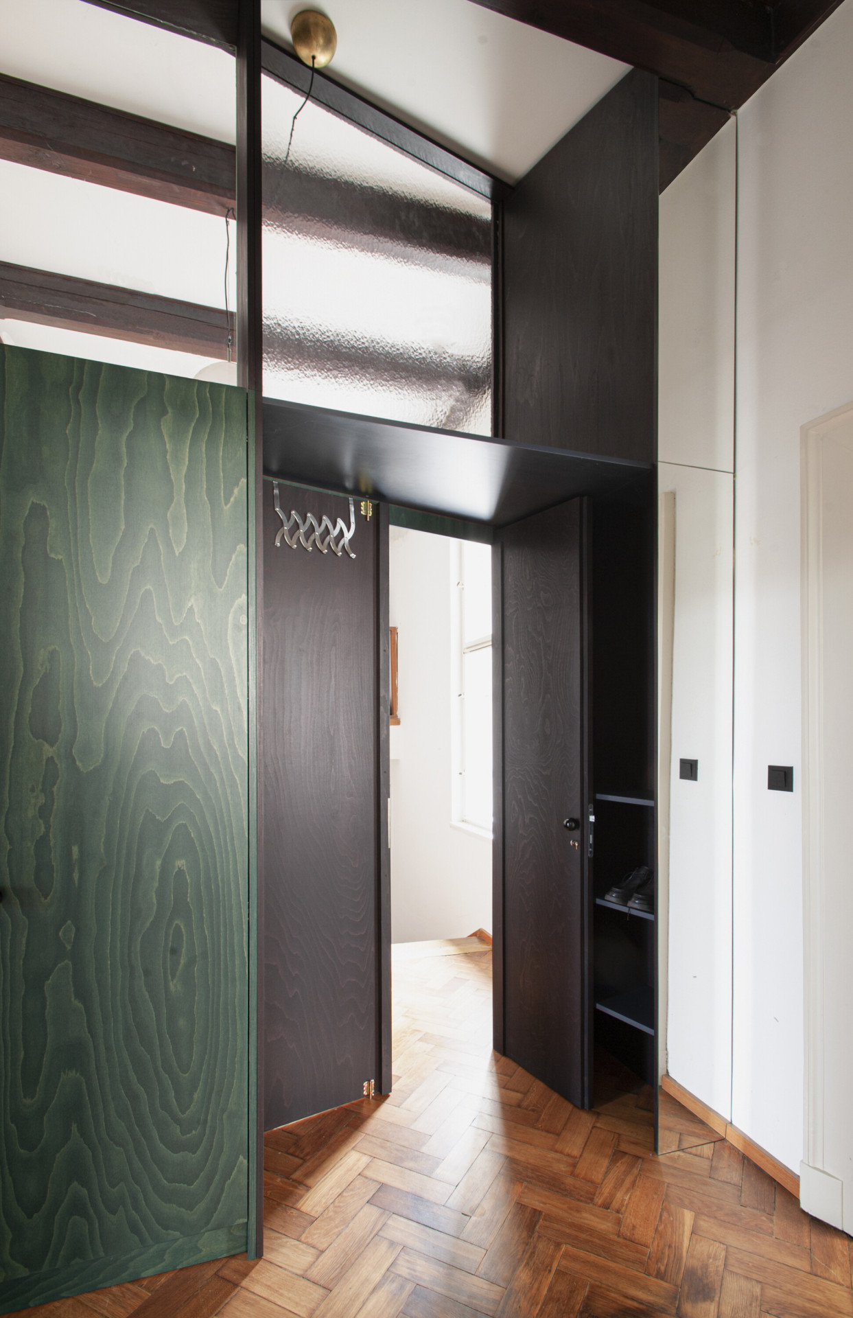 Autorská dvojice stála před zadáním rekonstrukce interiéru bytu, který vznikl vyčleněním samostatné bytové jednotky na jednom podlaží vícegenerační secesní vily v Praze. Hlavním požadavkem klientů bylo zvýšit míru soukromí a dostatečně jej oddělit od společného schodiště. Autoři zde umístili nový prvek dělící stěny s horním světlíkem, která v sobě ukrývá vstupní dveře a úložný prostor. Tento dominantní objekt redefinuje logiku schodišťové haly a pomocí zešikmení a zrcadlové plochy, která odráží konstrukci stropních trámů, už na první pohled dává najevo, že se jedná o nepůvodní objekt vytvářející nové vazby uvnitř prostoru.