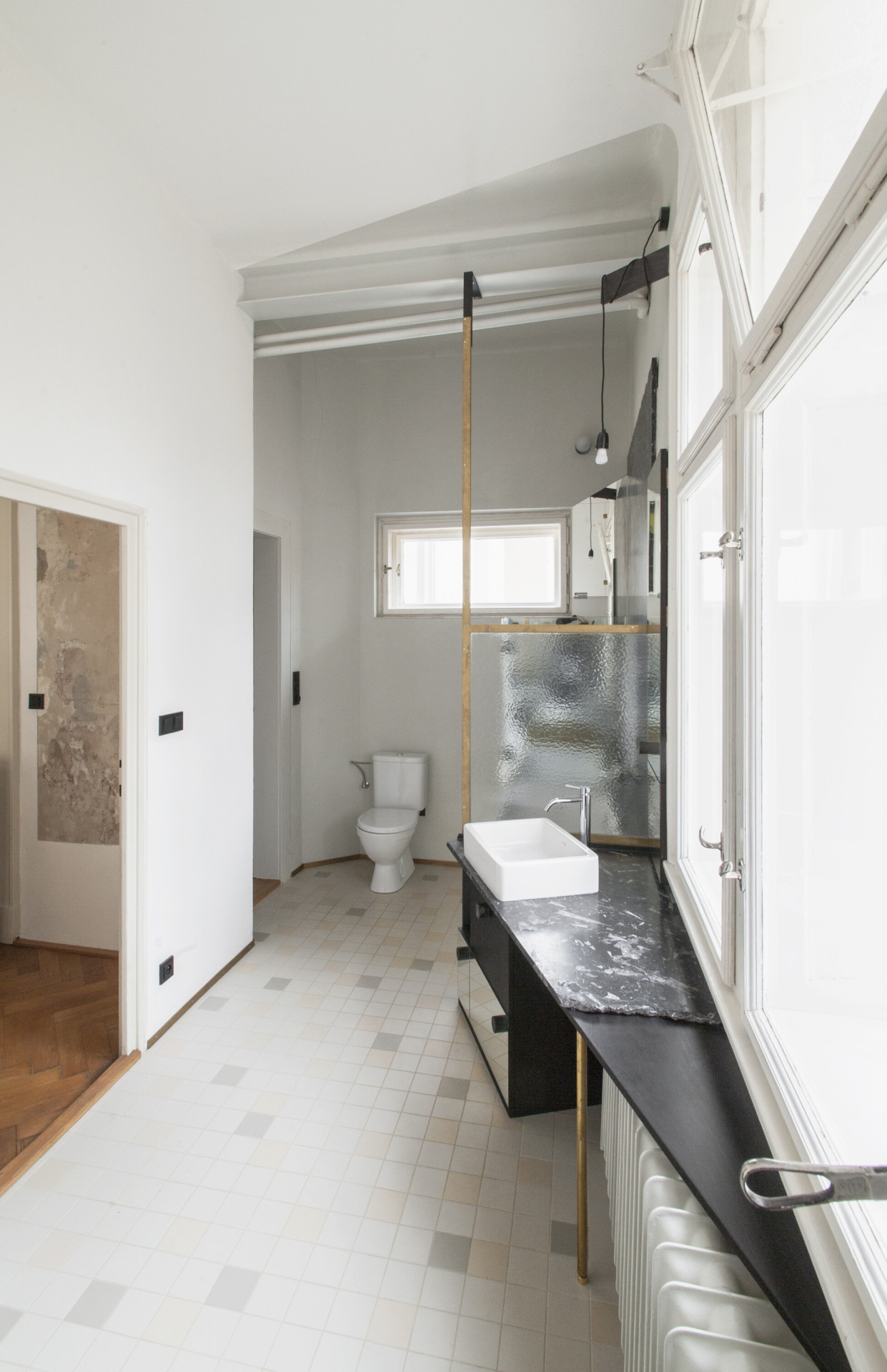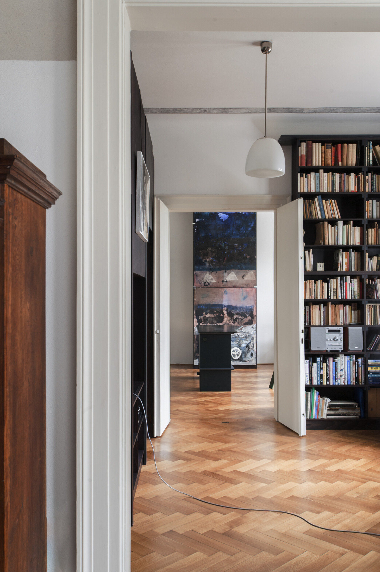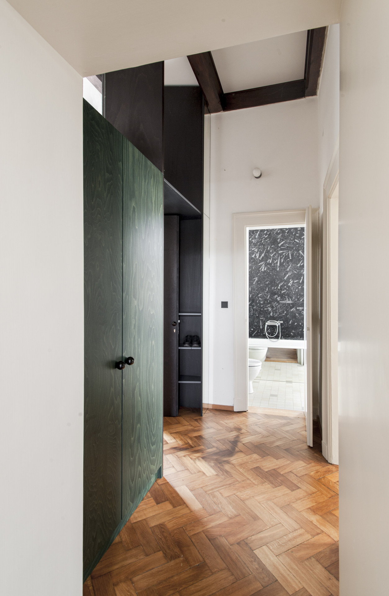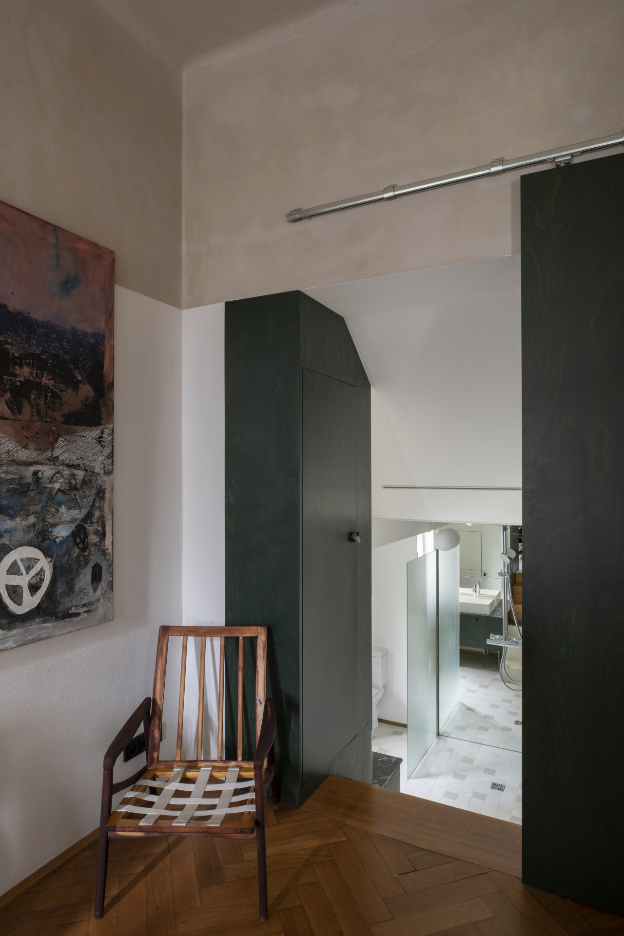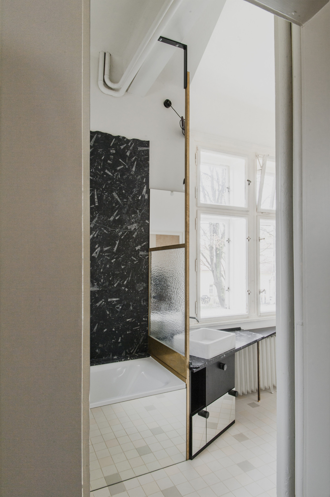 Autorská dvojice stála před zadáním rekonstrukce interiéru bytu, který vznikl vyčleněním samostatné bytové jednotky na jednom podlaží vícegenerační secesní vily v Praze. Hlavním požadavkem klientů bylo zvýšit míru soukromí a dostatečně jej oddělit od společného schodiště. Autoři zde umístili nový prvek dělící stěny s horním světlíkem, která v sobě ukrývá vstupní dveře a úložný prostor. Tento dominantní objekt redefinuje logiku schodišťové haly a pomocí zešikmení a zrcadlové plochy, která odráží konstrukci stropních trámů, už na první pohled dává najevo, že se jedná o nepůvodní objekt vytvářející nové vazby uvnitř prostoru.