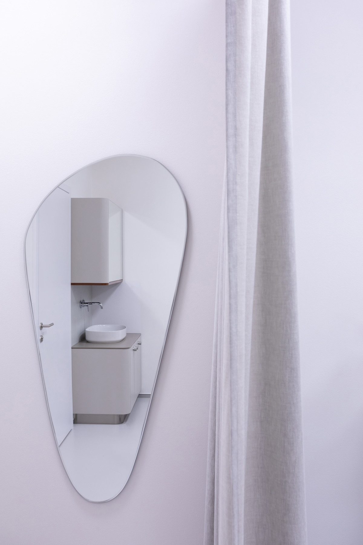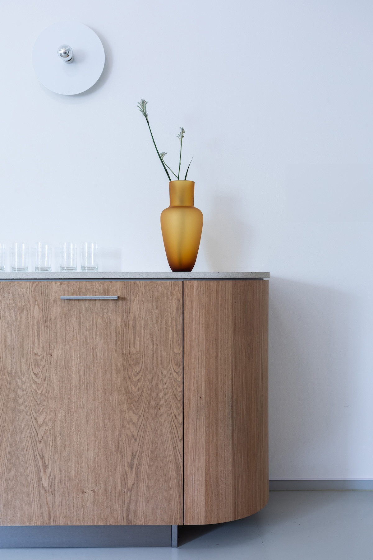 Kolem zaoblené stěny se vine na míru vyrobená skříň. Dalšími výraznými prostorovými aktéry jsou křesílka od dánského designera Henrika Pedersena. Jako osvětlení místnosti vybrala autorka závěsné lampy ze Skandinávie a nástěnná svítidla od designera Georga Gisela.