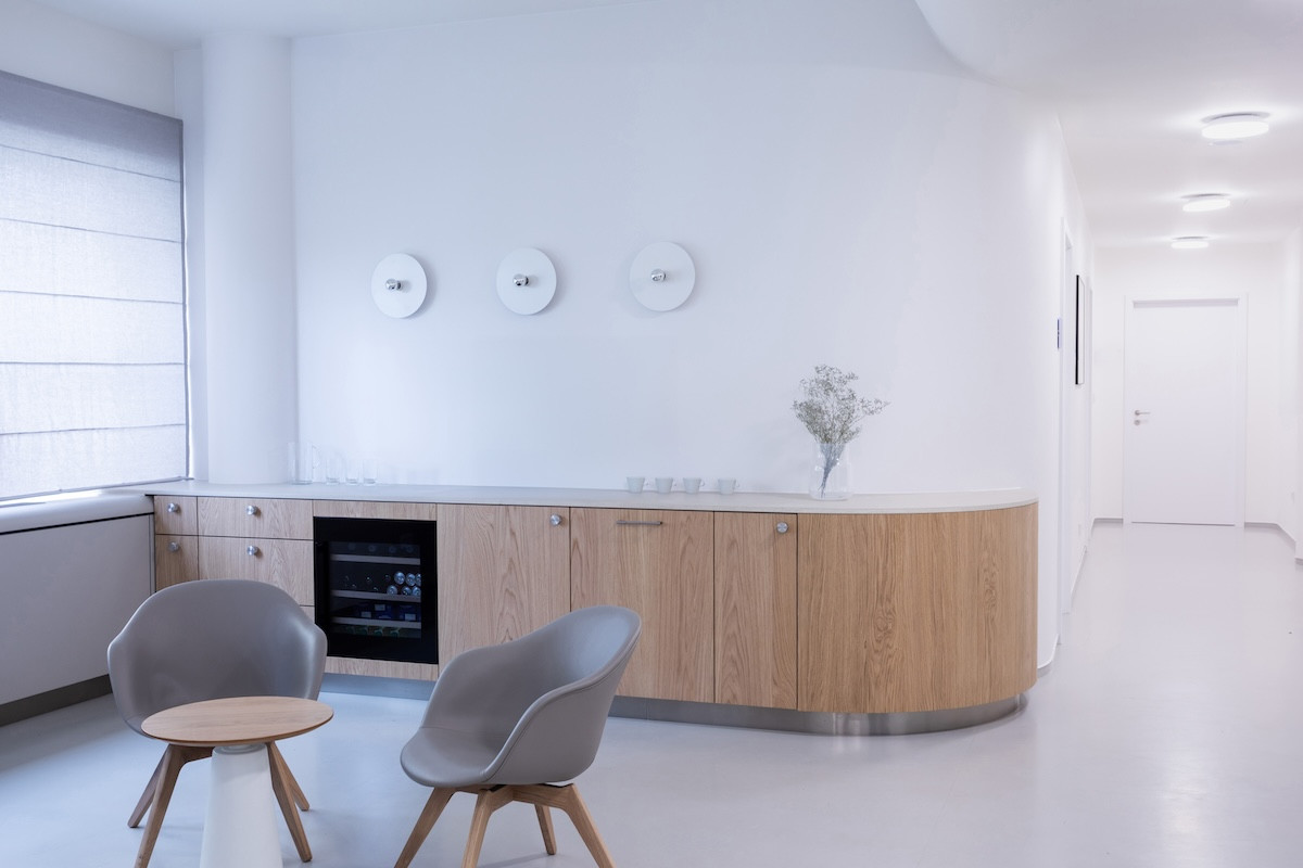 Podoba nemocničního nábytku v ordinacích, různá lůžka a vyšetřovací křesla, je předem daná dostupnou nabídkou. Autorka interiéru se proto snažila především barevně sladit celý interiér a sanitární prvky doplnit o nadčasové kousky, které jsou jak estetické, tak praktické. To lze pozorovat například ve výběru kožených křesel pro pacienty. Nebo třeba u zásobníků na desinfekci, které jsou skryté uvnitř skříní, aby nerušily celkový vizuální dojem.