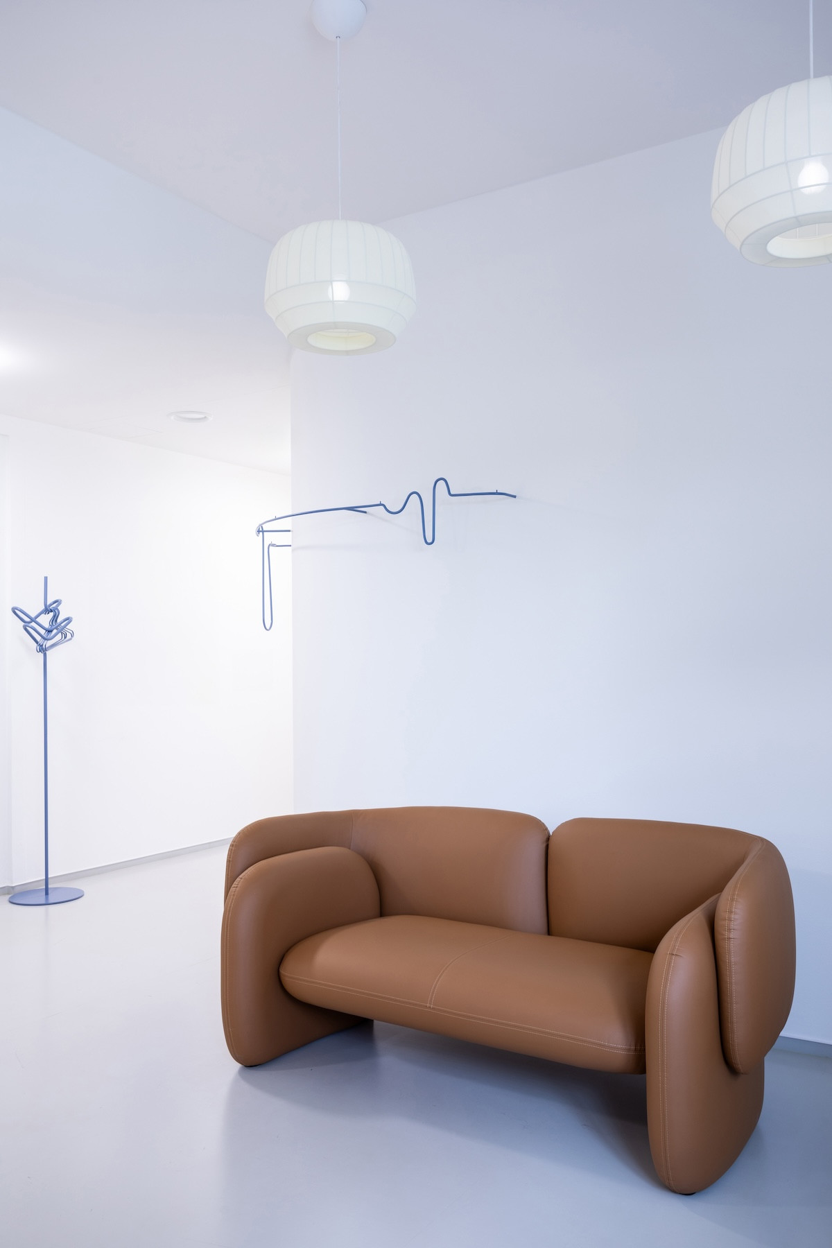 Po příchodu se ocitnete na recepci, která rozhodně nepůsobí jako klasická čekárna. Připadáte si spíš jako v příjemném lounge. Hlavní roli obsadilo kožené sofa, která svým tvarem působí jako umělecký objekt. Na stěně se klikatí hravý nástěnný věšák, který připomíná křivku EKG.