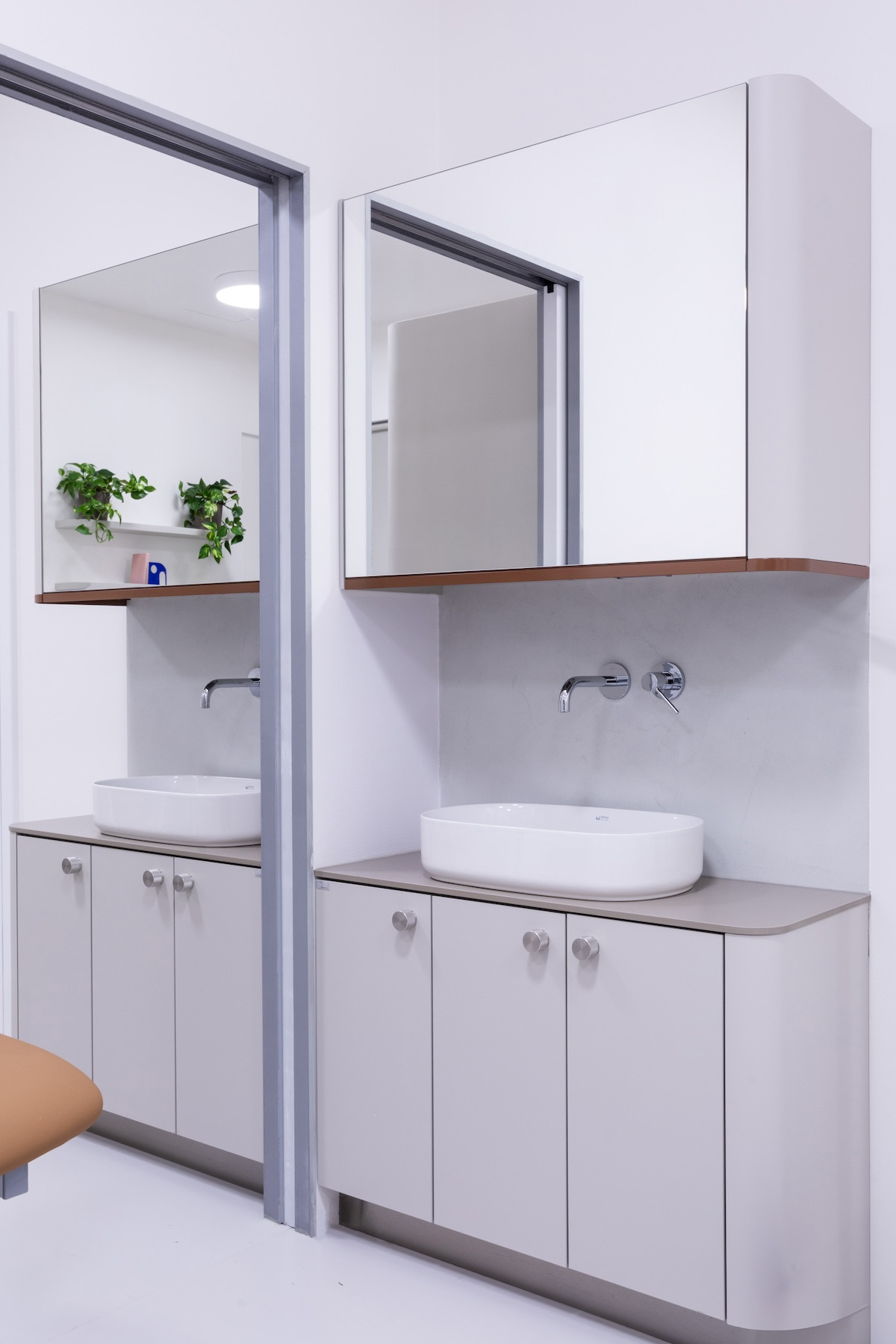 Není běžné, že by polikliniky měly svoji vlastní vizuální identitu. To ovšem neplatí pro Health+. Mají svůj vlastní grafický vizuál, který pracuje s výraznými barvami a organickými tvary. Na ty navázala i autorka architektonického řešení. Zaoblení se objevuje v prostorách recepce i v ordinacích, například v podobě zrcadel, nábytku či rohů stěn. Veškeré prvky výrazně zjemnily a zútulnily celý interiér.