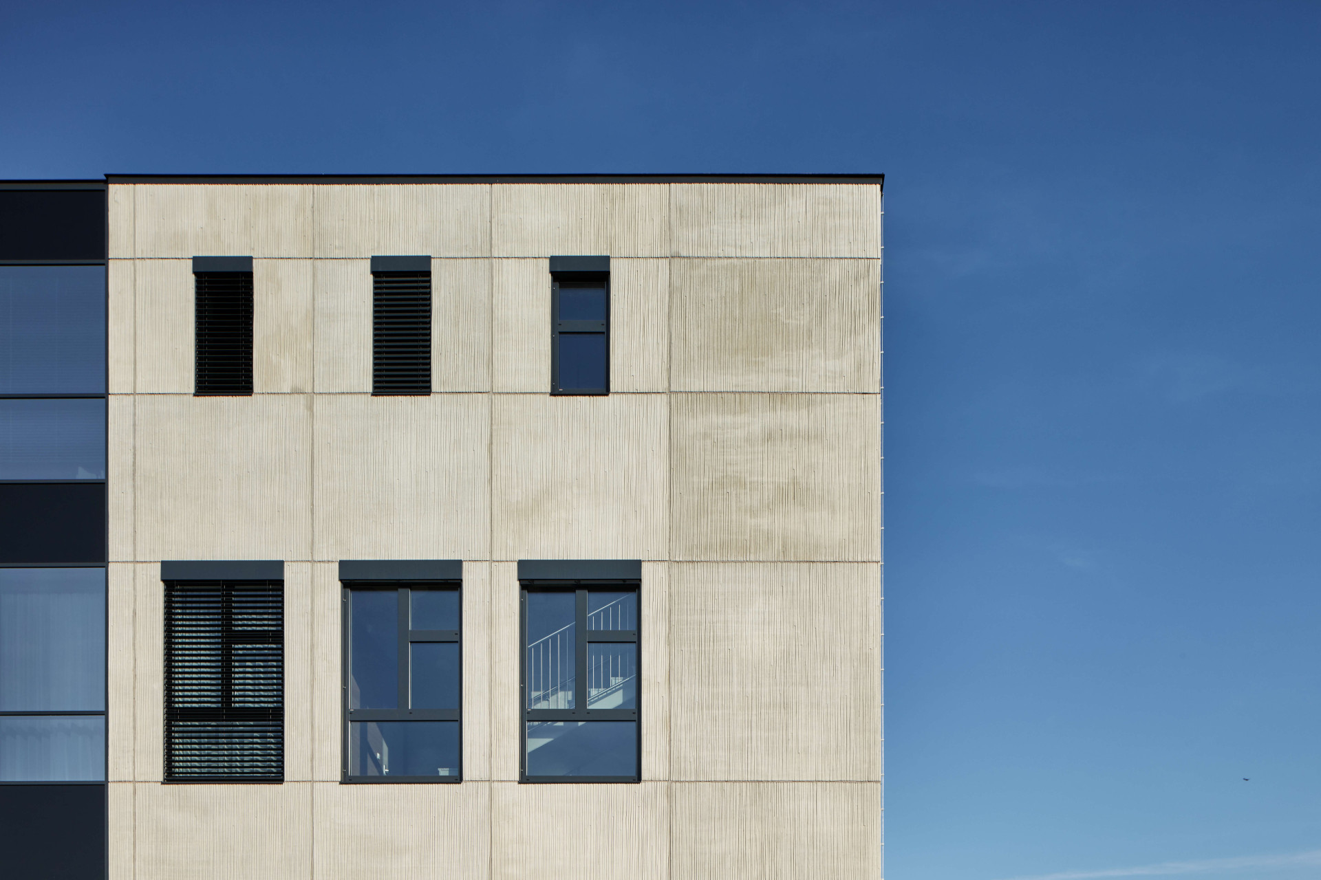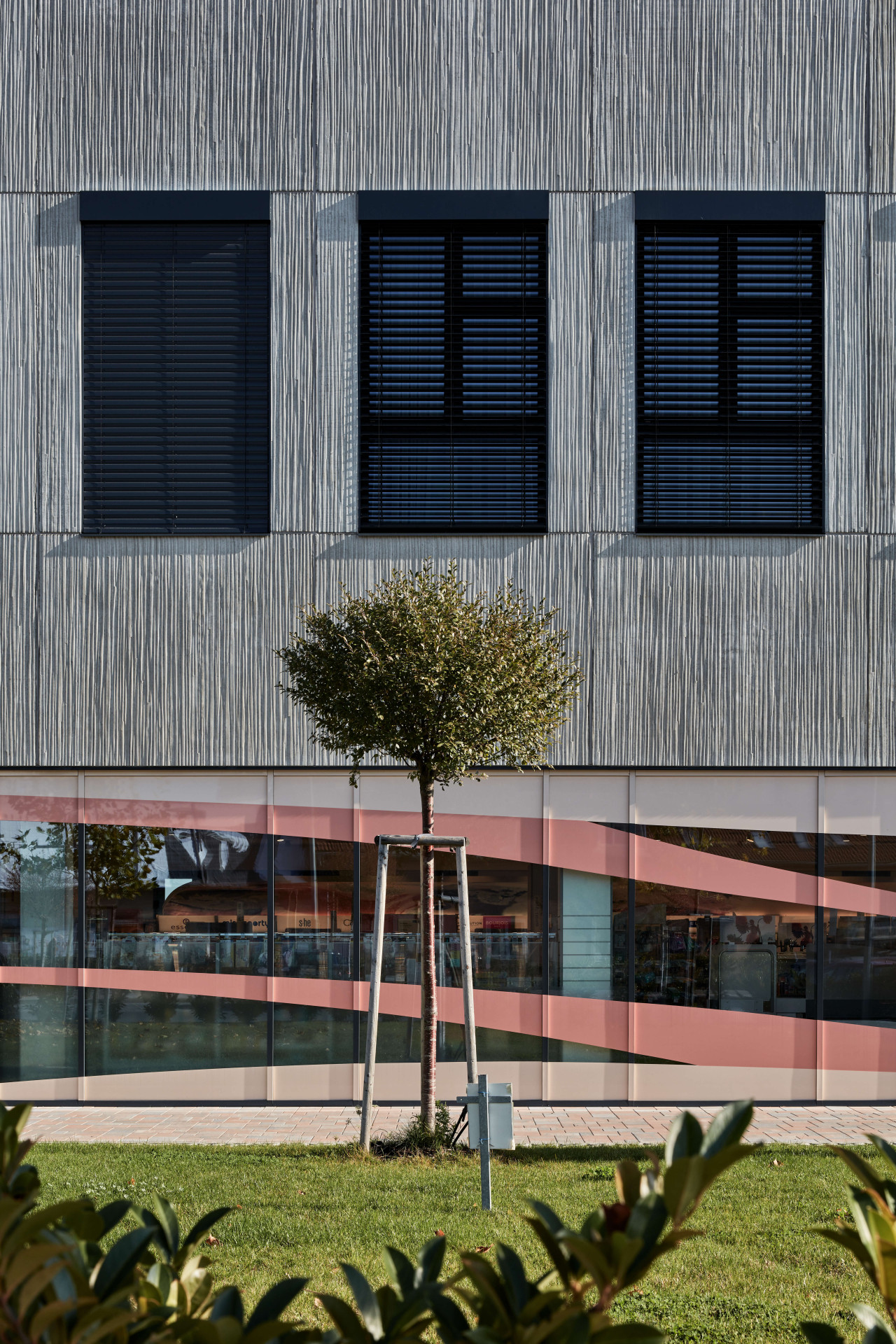 Obchodní centrum se do svého okolí obrací prosklenými fasádami, díky kterým jsou i vnitřní prostory v nepřetržitém kontaktu s exteriérem. Křehkou skleněnou fasádu na několika místech ozvláštňuje kontakt s betonovými fasádními deskami s nápaditým vzorem. Pro jejich výrobu byly použity matrice společnosti RECKLI z edice SELECT, která nabízí na 250 velmi rozličných designů. V případě obchodního centra v Čakovicích byla použita matrice 2/32 Inn se strukturou složenou z vertikálních linií připomínající otisky různě širokých větviček.