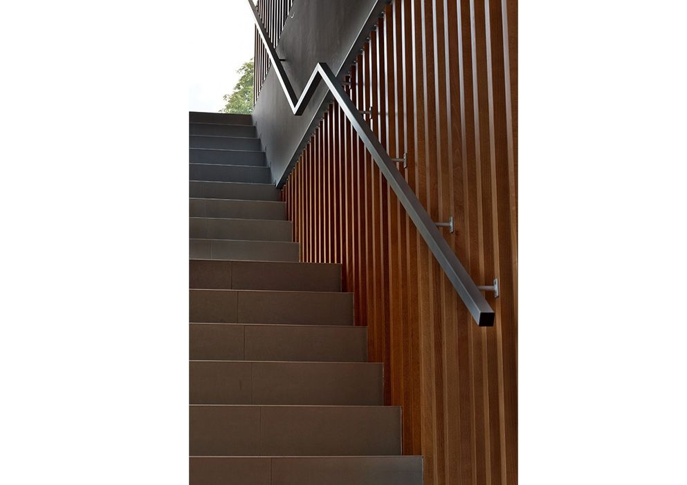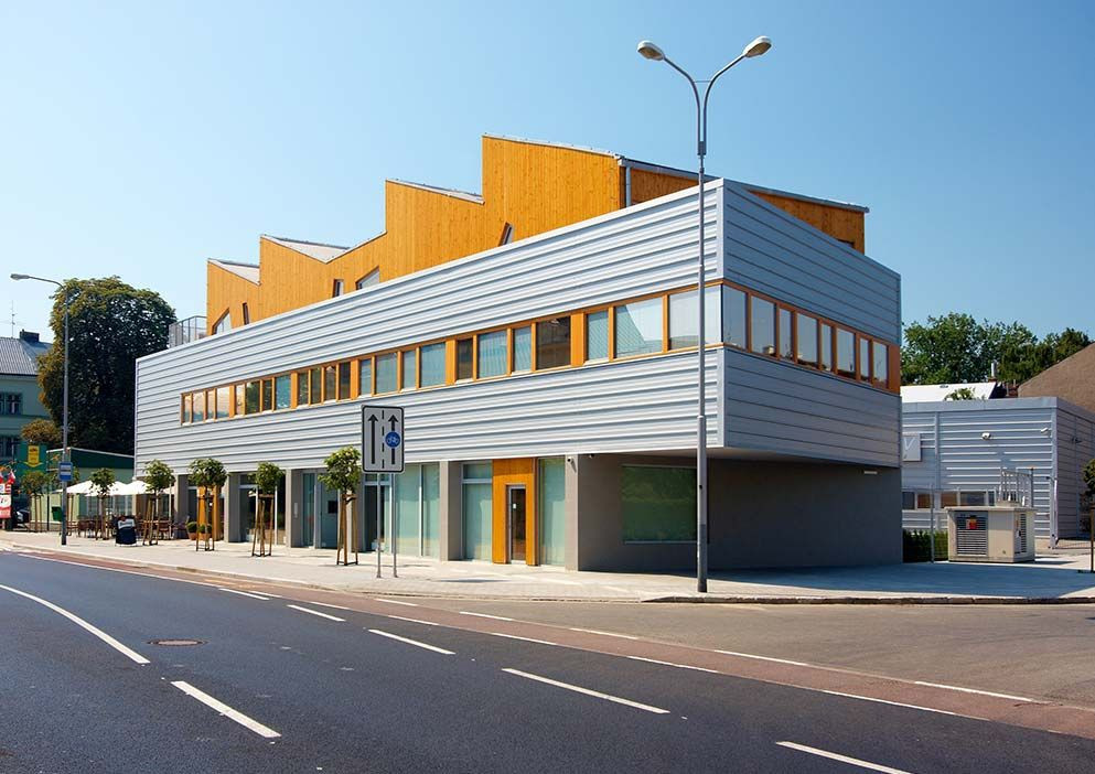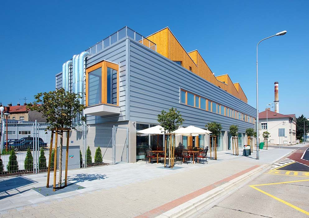 Pilová střecha se zakusuje do panoramatu „Vítkovických hradčan“. Přiznaná technologie dává připmenout industriální kořeny této lokality - vždyť se nacházíme nedaleko Vítkovických železáren...