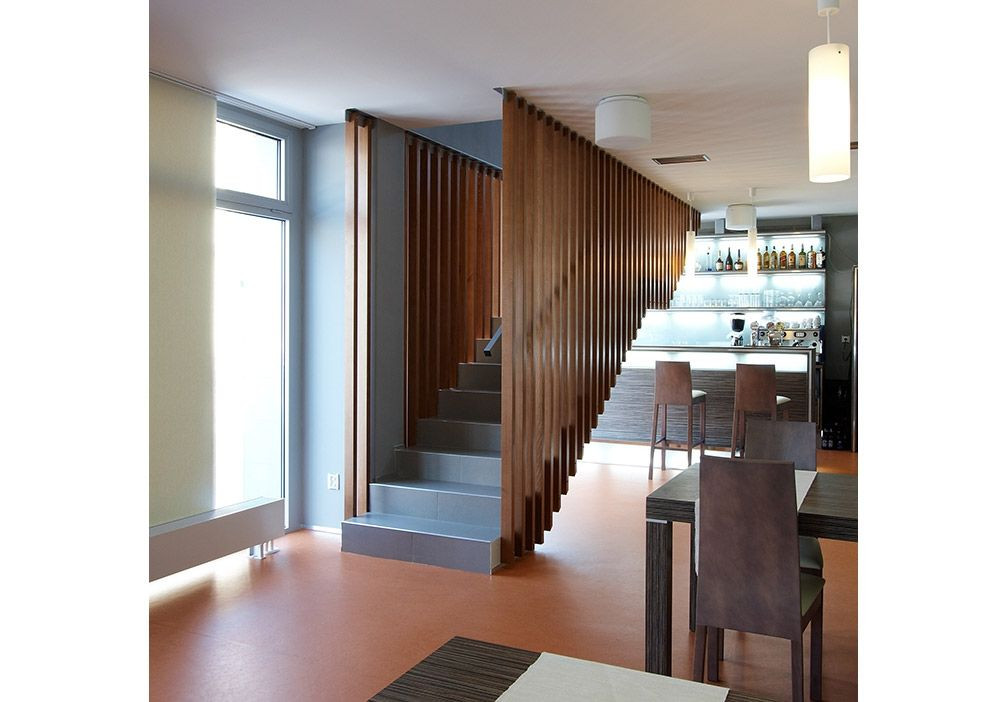 Dispozice je rozdělena vstupní halou do areálu firmy s recepcí na dvě části. V severní nárožní části je navržený obchod se vstupem z ulice Výstavní a se zásobováním z areálu firmy. V jižní části je navržena restaurace. Odbytová část je navržena podél ulice Výstavní, zázemí se zásobováním je umístěno do dvorní části.