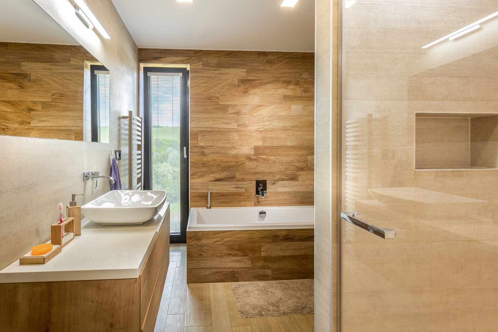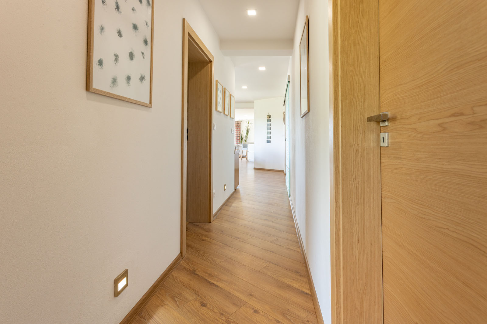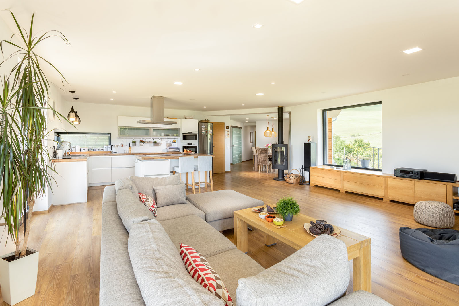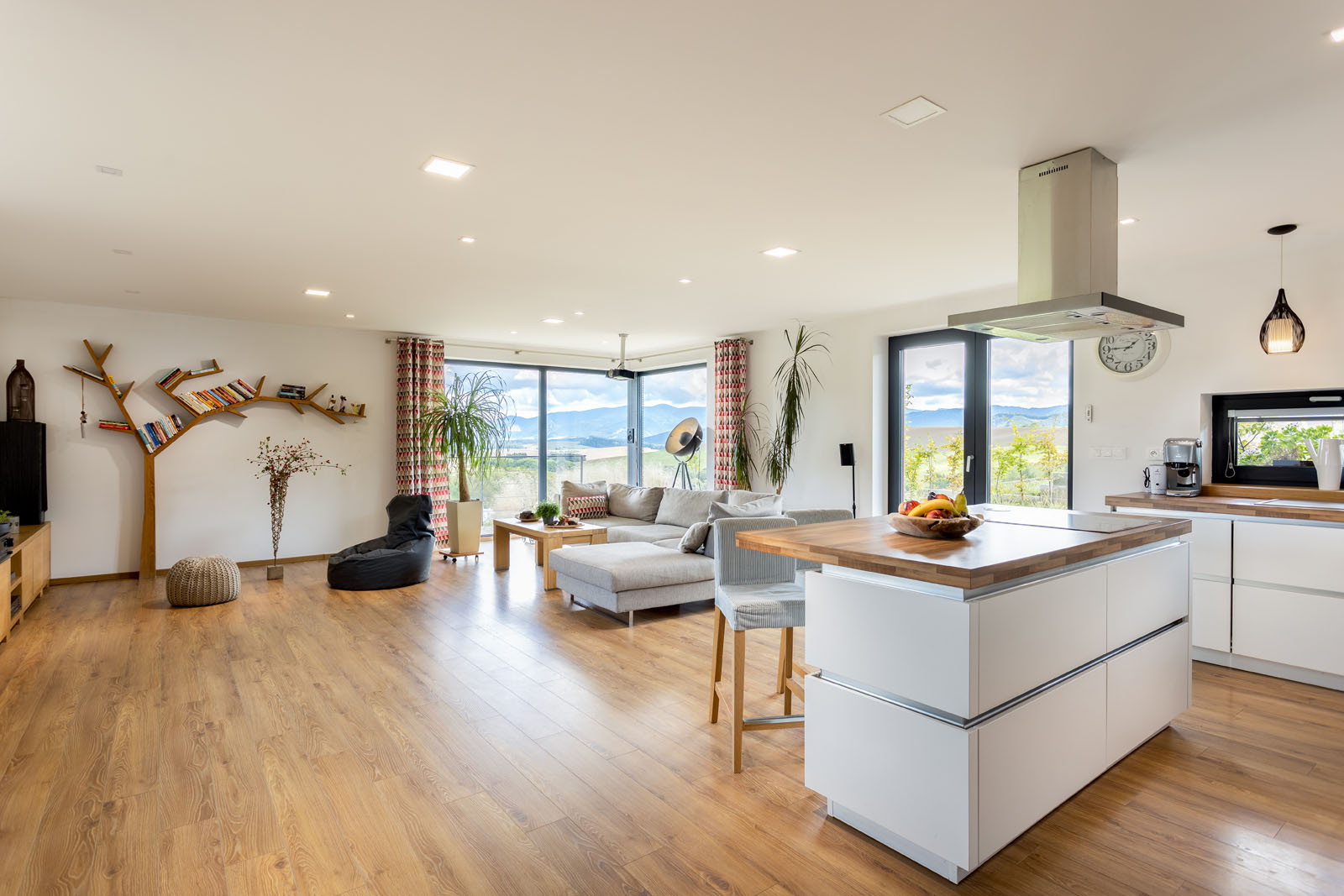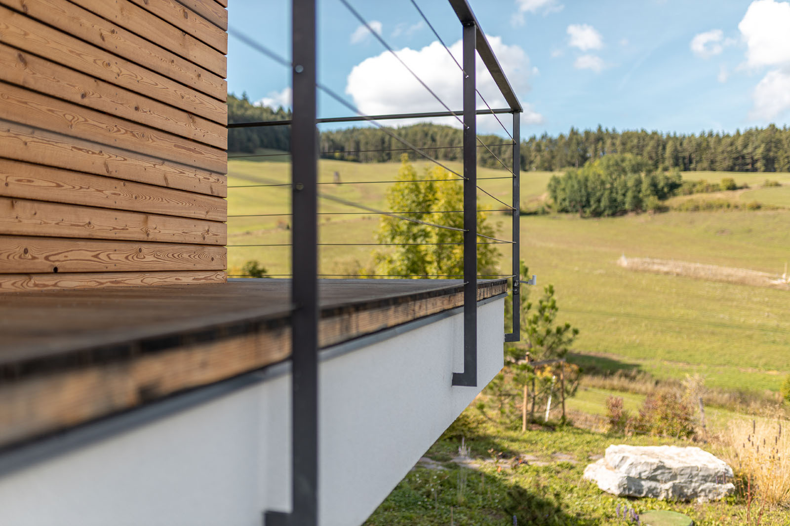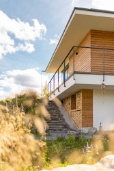 Dispozice je volná – obývací pokoj je propojený s terasou a zahradou a volně na něj navazuje klidová zóna s ložnicí. Možností posezení na terase dům nabízí několik – ze všech částí domu je možné vyjít ven do zahrady. U obývacího pokoje je příjemné dát si venku kávu, dolní terasa, ukrytá ve svahu, slouží pro grilování a společenské příležitosti. Krásný výhled poskytuje také vyvýšená část ochozu nad terénem u ložnice.