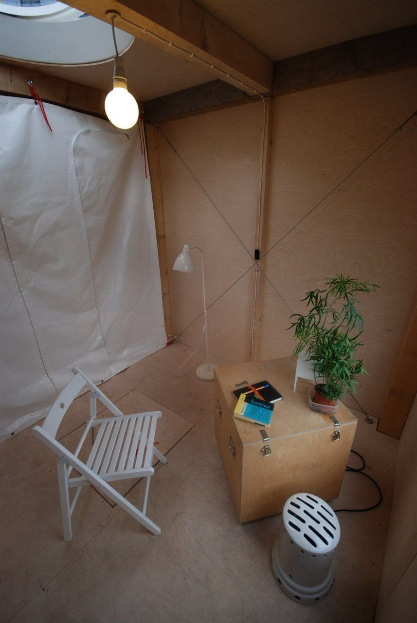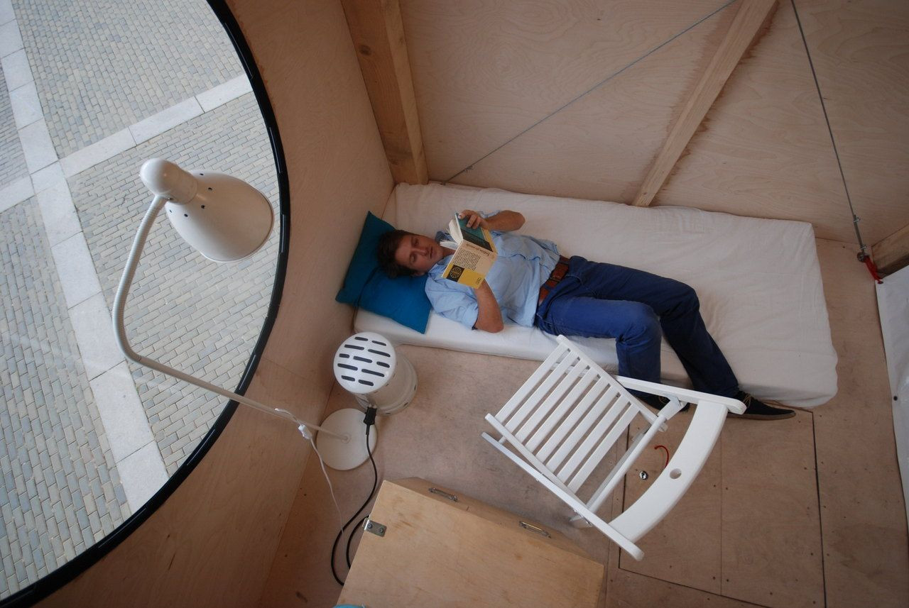 V roce 2012 se na tradičně netradiční výstavě v Domě umění v Českých Budějovicích představilo architektonické studio Mjölk, které kromě zřízení jejich dočasné kanceláře ve výstavních prostorách galerie zrealizovalo na náměstí dřevěný objekt na vysokých nohách. Minimální, avšak pohodlně zařízený interiér s kruhovým oknem, nasměrovaným do prostoru náměstí, nabízel krátkodobému obyvateli možnost intenzivnějšího prožívání jeho vztahu k obklopujícímu prostoru.