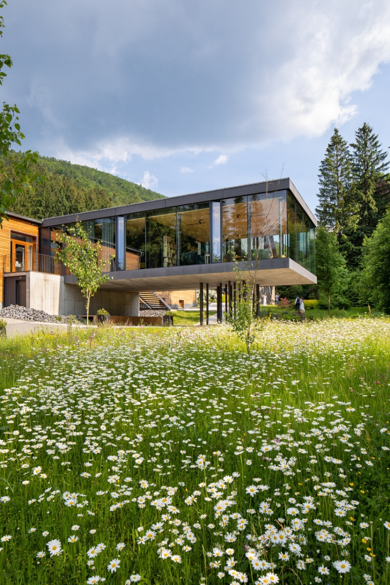 K nenápadné budově se sedlovou střechou a dřevěným obkladem se architekti rozhodli připojit minimalistický kvádr, který díky svému konstrukčnímu řešení působí, jako by se vznášel nad krajinou. Přísně pravoúhlou hmotu totiž podpírá pouze několik subtilních ocelových pilířů.
