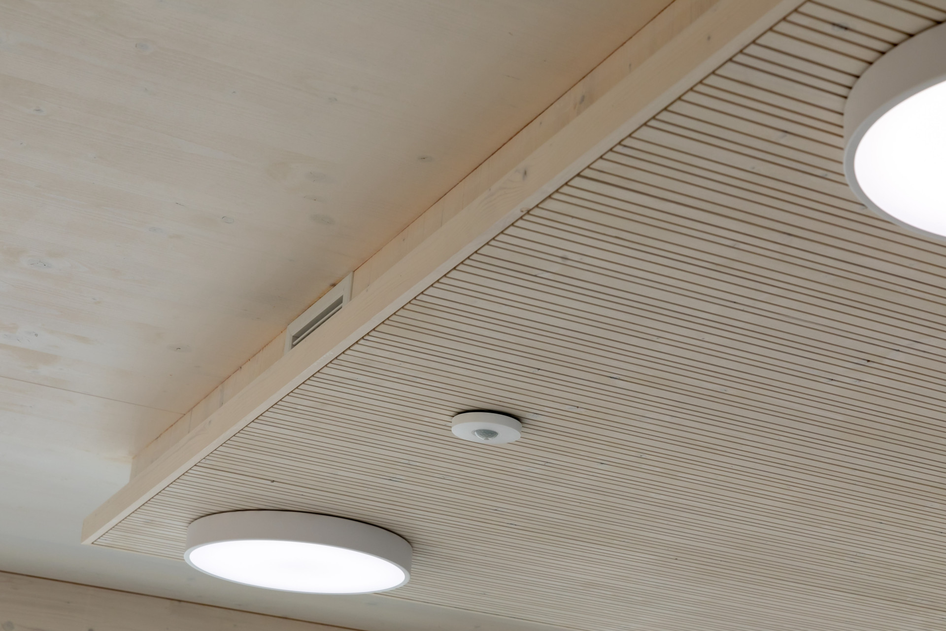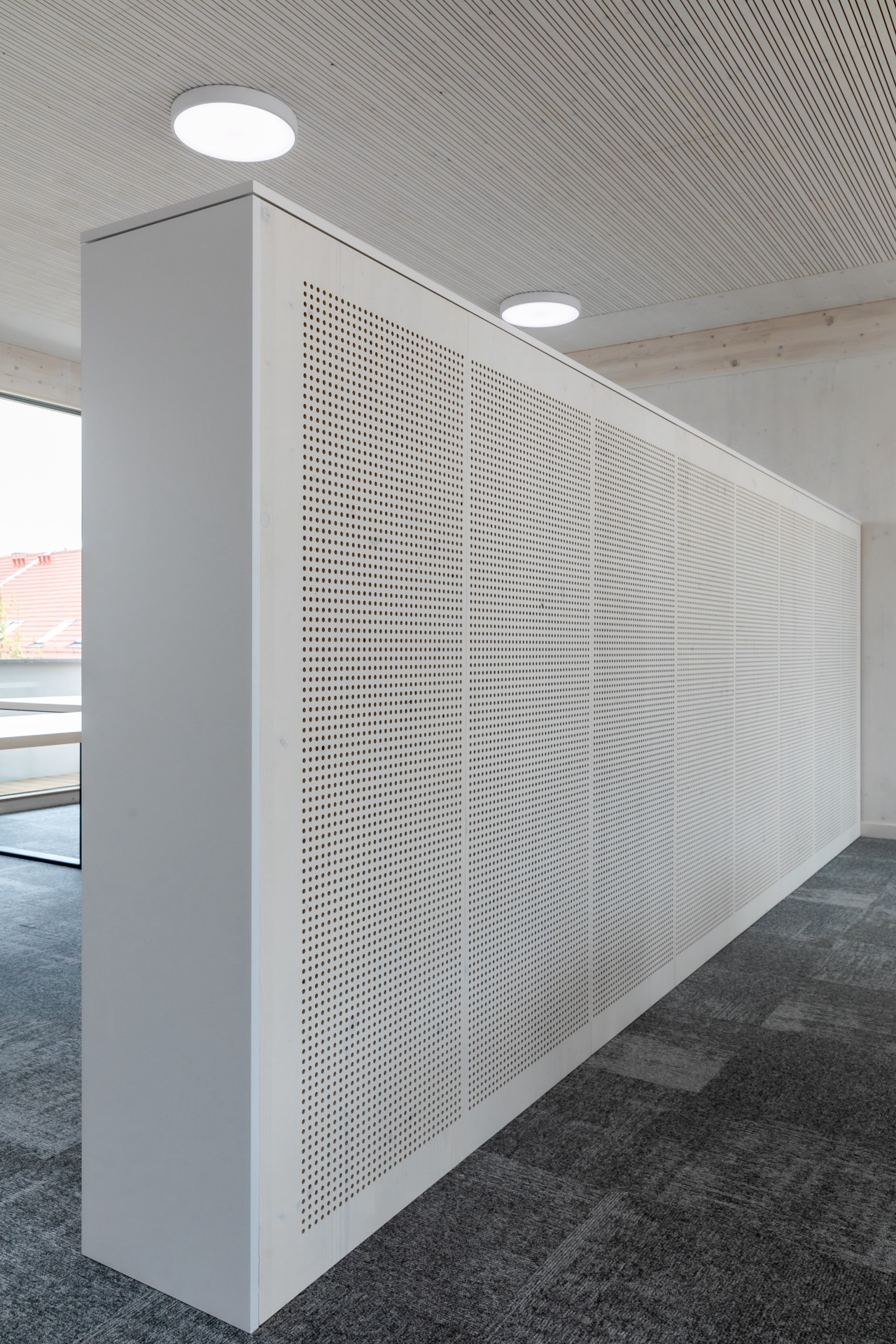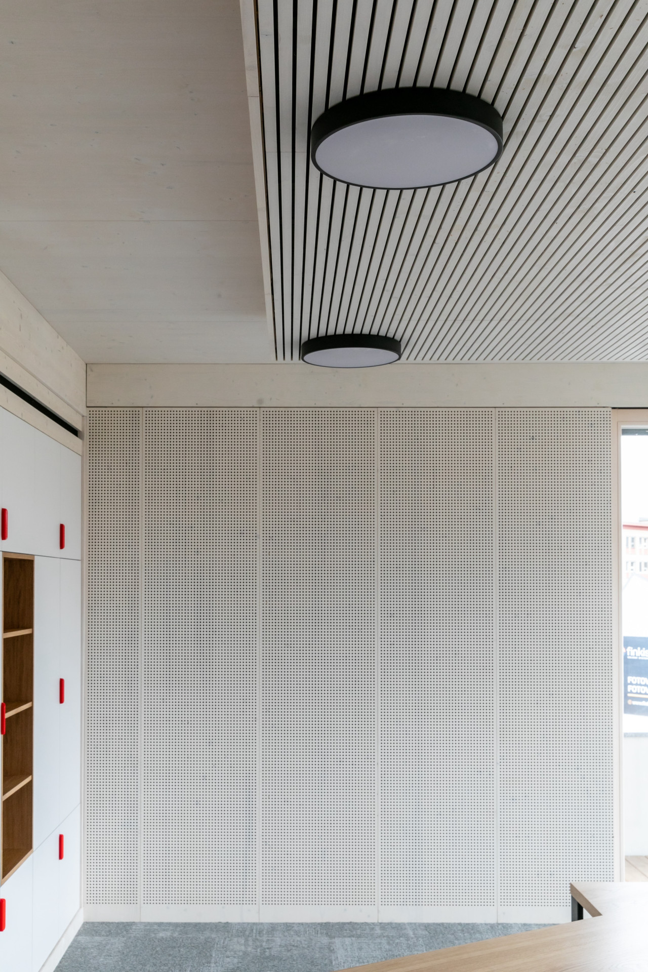 Ve většině místností jsou na stropě lokálně umístěné dřevěné akustické panely NOVATOP ACOUSTIC pro optimalizaci prostorové akustiky, zároveň jsou i výrazným designovým prvkem, se kterým architektka v celém konceptu od začátku počítala. Je jimi zaklopená 12 cm dutina na rozvod vzduchotechniky, která byla původně zvažovaná pouze u modulů. Nakonec se k tomuto řešení přistoupilo ve všech místnostech, díky čemuž je v nich cca 10 vyústek, které zajišťují zcela rovnoměrné a příjemné proudění vzduchu.