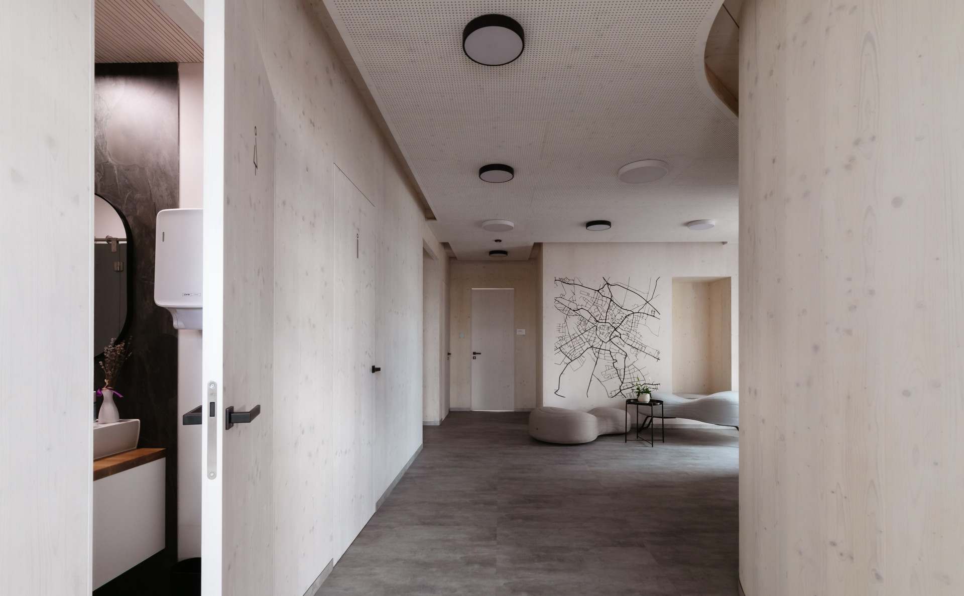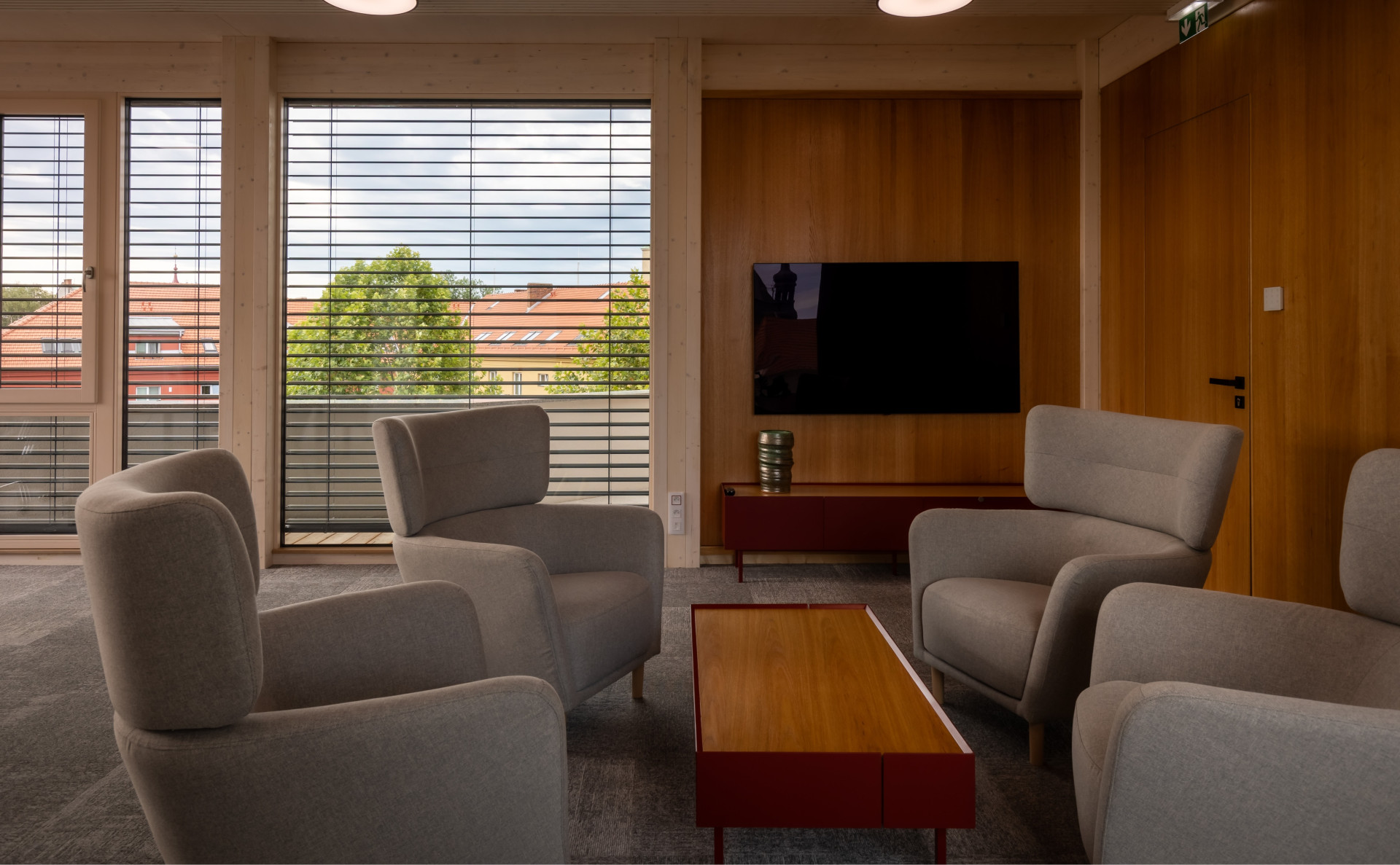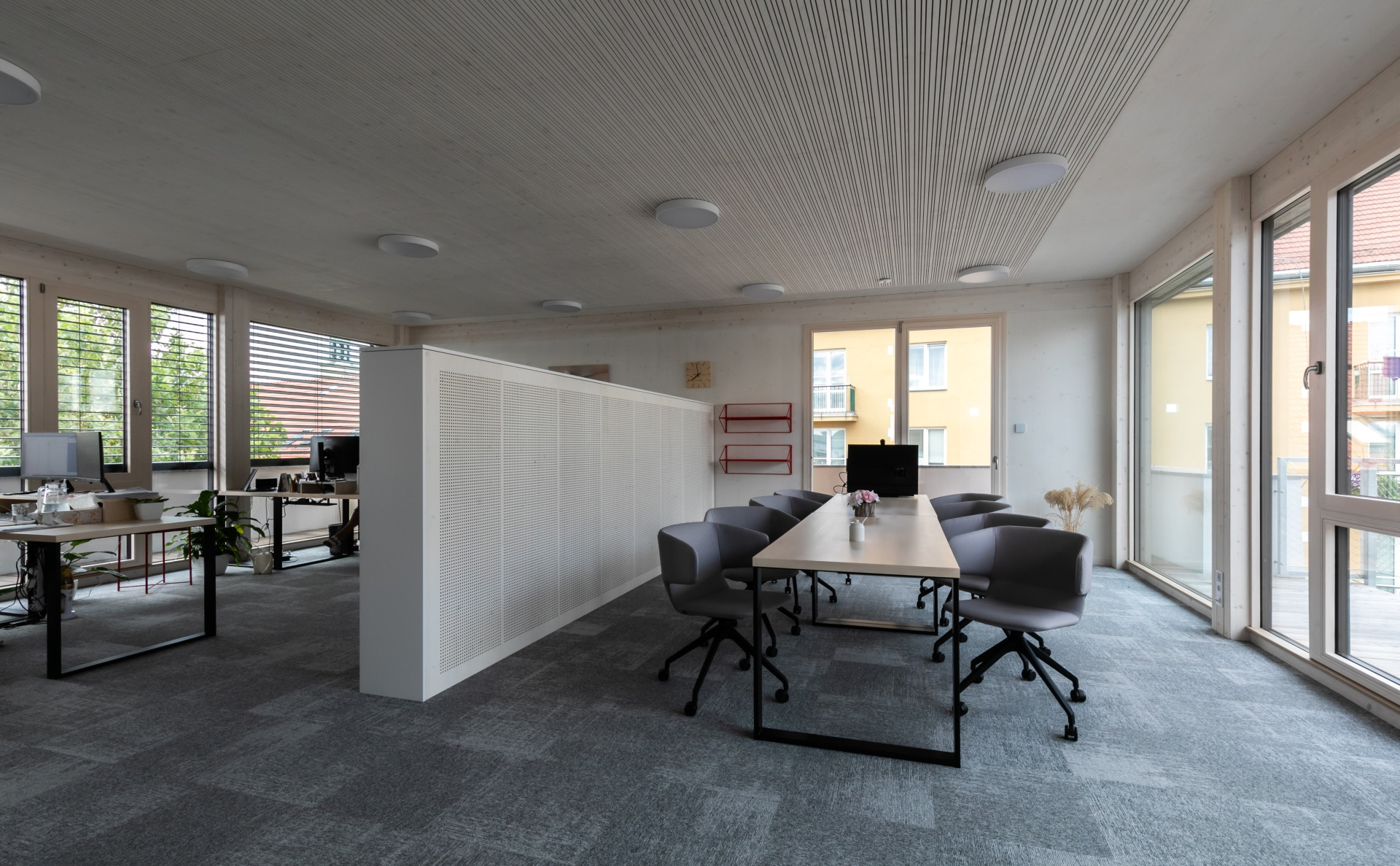 Ve většině místností jsou na stropě lokálně umístěné dřevěné akustické panely NOVATOP ACOUSTIC pro optimalizaci prostorové akustiky, zároveň jsou i výrazným designovým prvkem, se kterým architektka v celém konceptu od začátku počítala. Je jimi zaklopená 12 cm dutina na rozvod vzduchotechniky, která byla původně zvažovaná pouze u modulů. Nakonec se k tomuto řešení přistoupilo ve všech místnostech, díky čemuž je v nich cca 10 vyústek, které zajišťují zcela rovnoměrné a příjemné proudění vzduchu.
