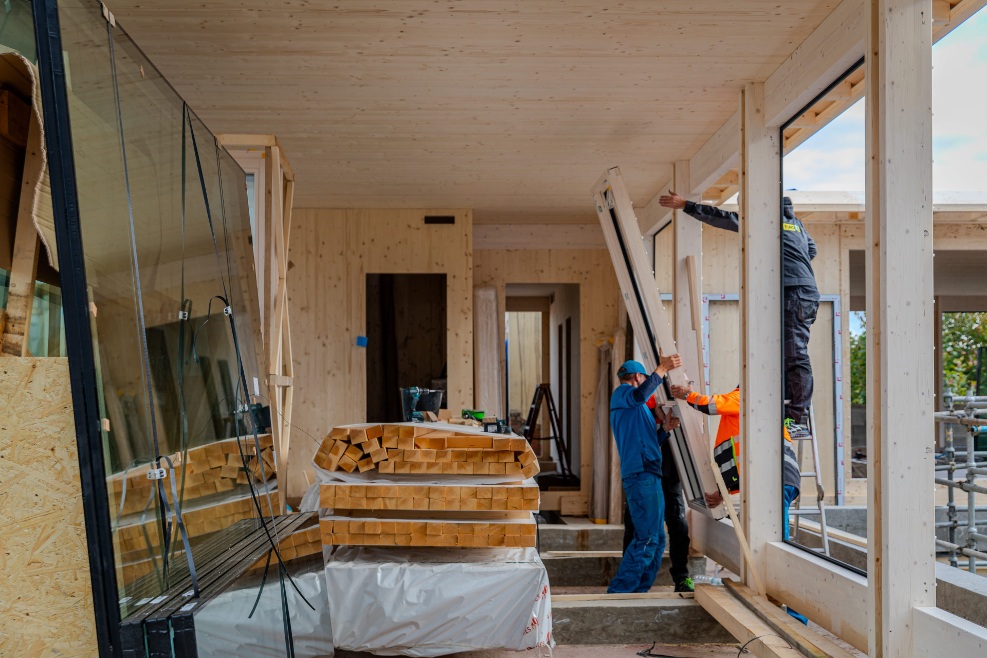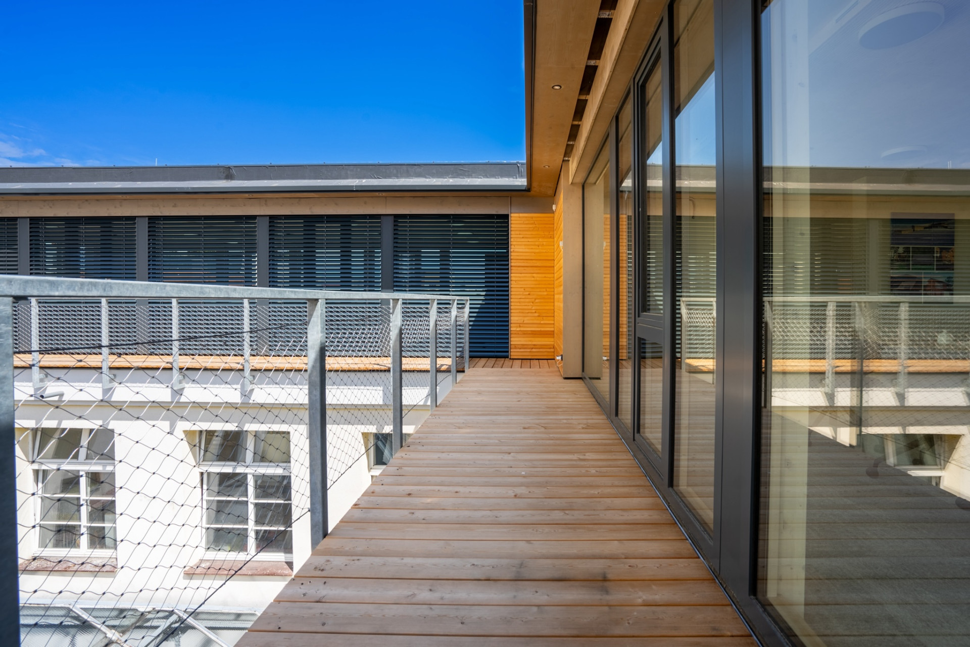 Nástavba má tři hlavní lodě, koncipované jako otevřené kancelářské prostory s rozponem až 8 m, uprostřed jsou pak technické místnosti, kuchyňky, vstupní chodba a sociální zázemí. Středová část byla řešena modulově a ostatní konstrukce prefabrikovány plošně. Konstrukci jednotlivých lodí tvoří prefabrikované rámy z BSH, které byly ihned po montáži zaskleny. Štítové stěny jsou z pohledových CLT panelů NOVATOP SOLID. Střešní elementy NOVATOP OPEN byly kompletně prefabrikované, včetně přesahů, vyplněné izolací a zakryté dřevovláknitou deskou, která je hydrofobní. Během montáže dřevěné konstrukce se nahoře na stavbě vyskládaly i okna a dveře. Montáž oken probíhala paralelně s montáží střechy, a to přímo do BSH rámů. Zasklení je fixní, bezrámové, což je značná finanční úspora, a velkým bonusem je krásný čistý design.