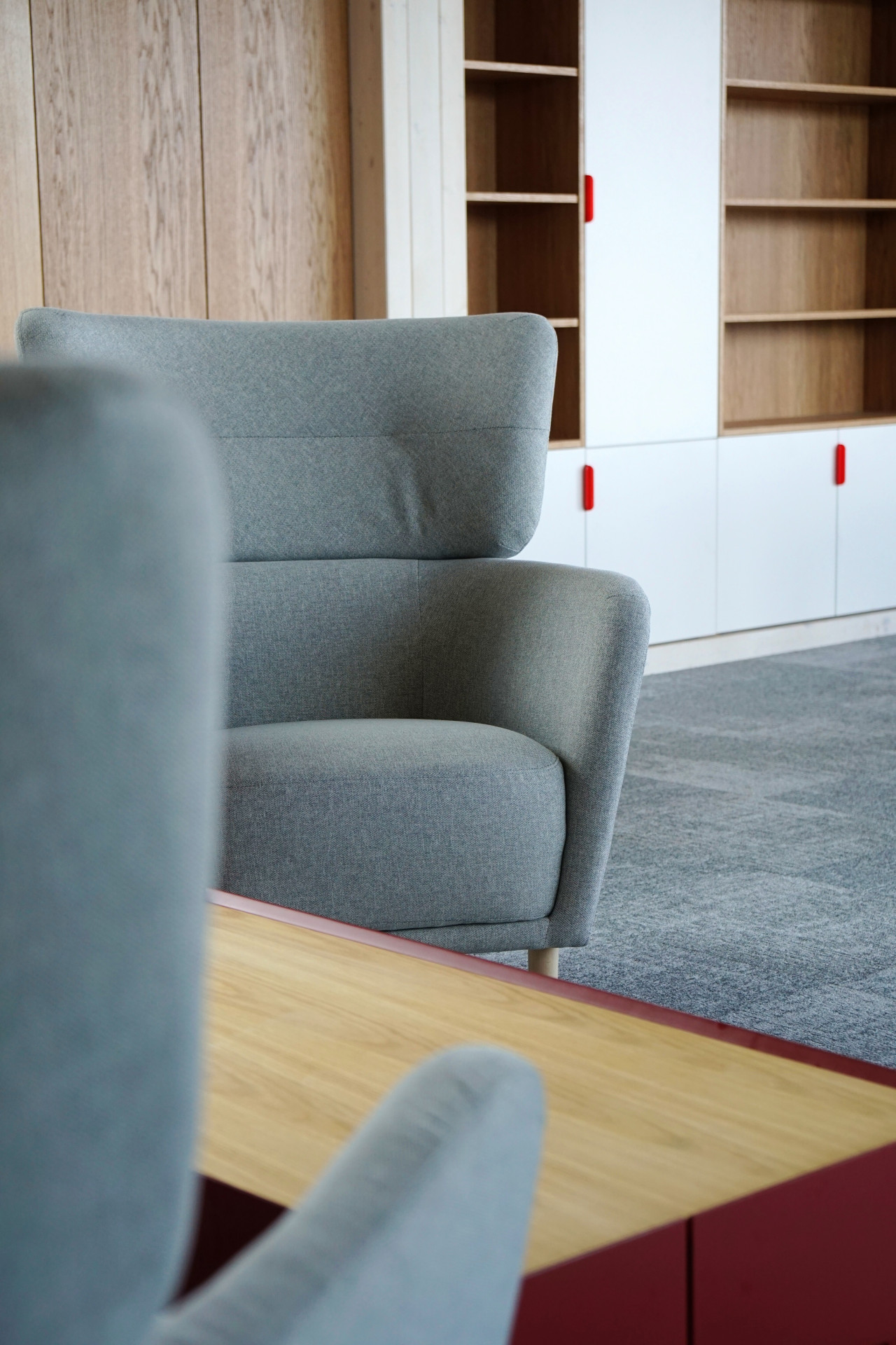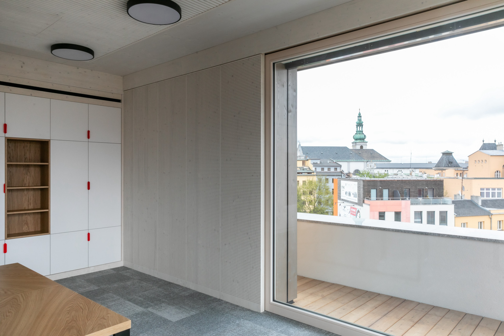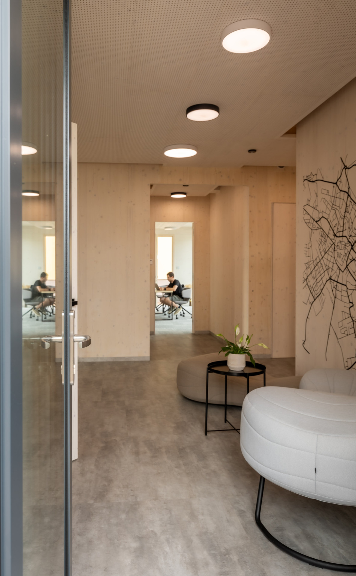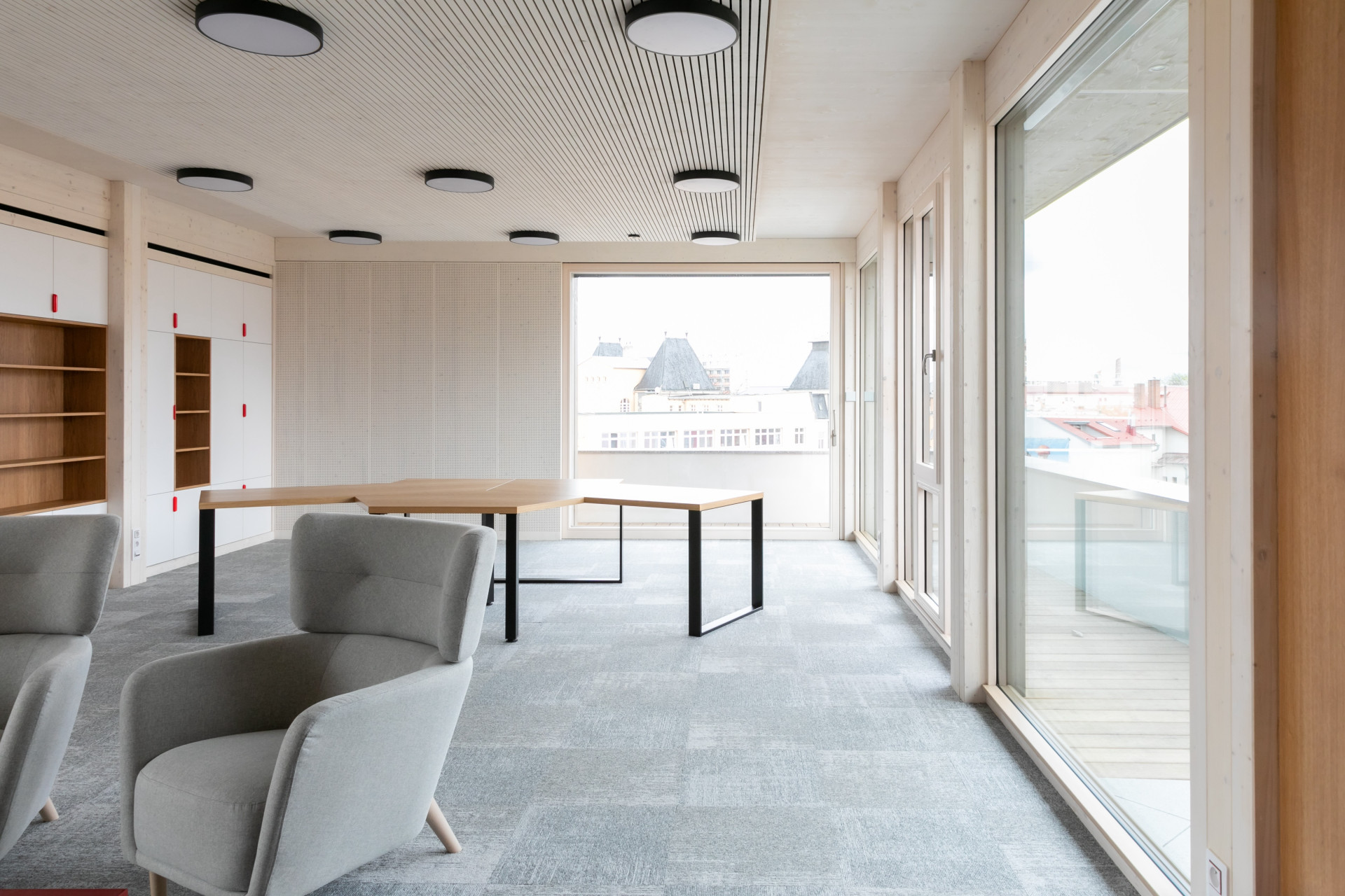 Interiéru dominuje všudy přítomné dřevo. Pohledová kvalita NOVATOP odolává vzniku povrchových trhlin a u všech přiznaných panelů působí jednotně. Součástí jednoho moduly byla stěna SOLID olepená dubovou dýhou, která v sobě měla zároveň ztracené dveře, takže dekor dýhy je celistvý na celé ploše stěny. Dveře se pak jen truhlářsky opracovaly a zafrézovaly panty. Vše se přebrousilo a naolejovalo v rámci dokončovacích prací. Stejný dekor dýhy doprovází i další interiérové prvky v jedné ze tří kanceláří.