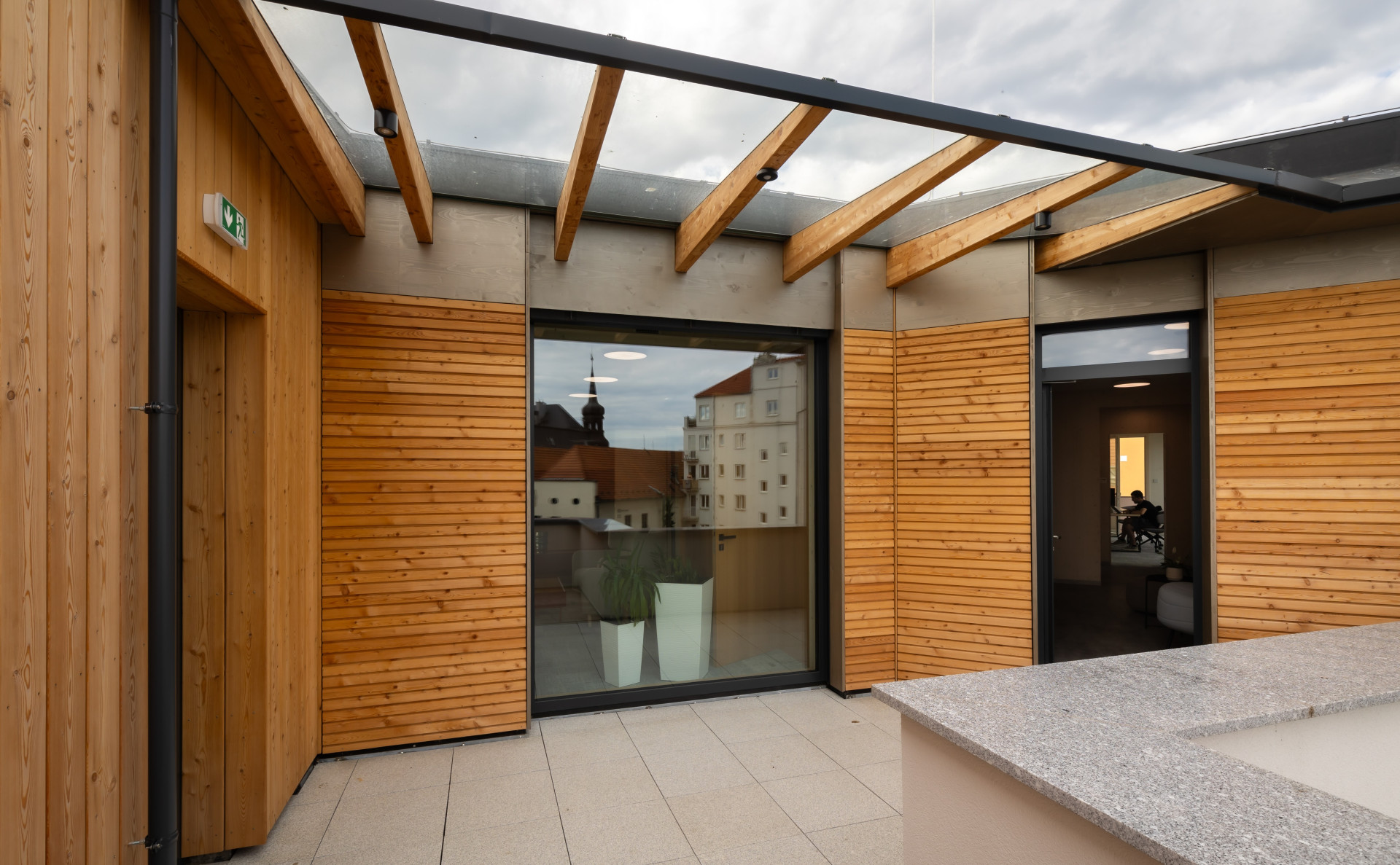 Zadání pro architekta bylo navrhnout nástavbu s terasami, díky kterým se nové patro mírně „utopí“ a stane se přirozenou součástí původního historického objektu, který se nachází v památkové zóně centra Opavy. Z toho plynul i striktní požadavek památkářů na střechu, která musí respektovat stávající obvod stavby, což se docílilo velkými přesahy střech nad terasami.