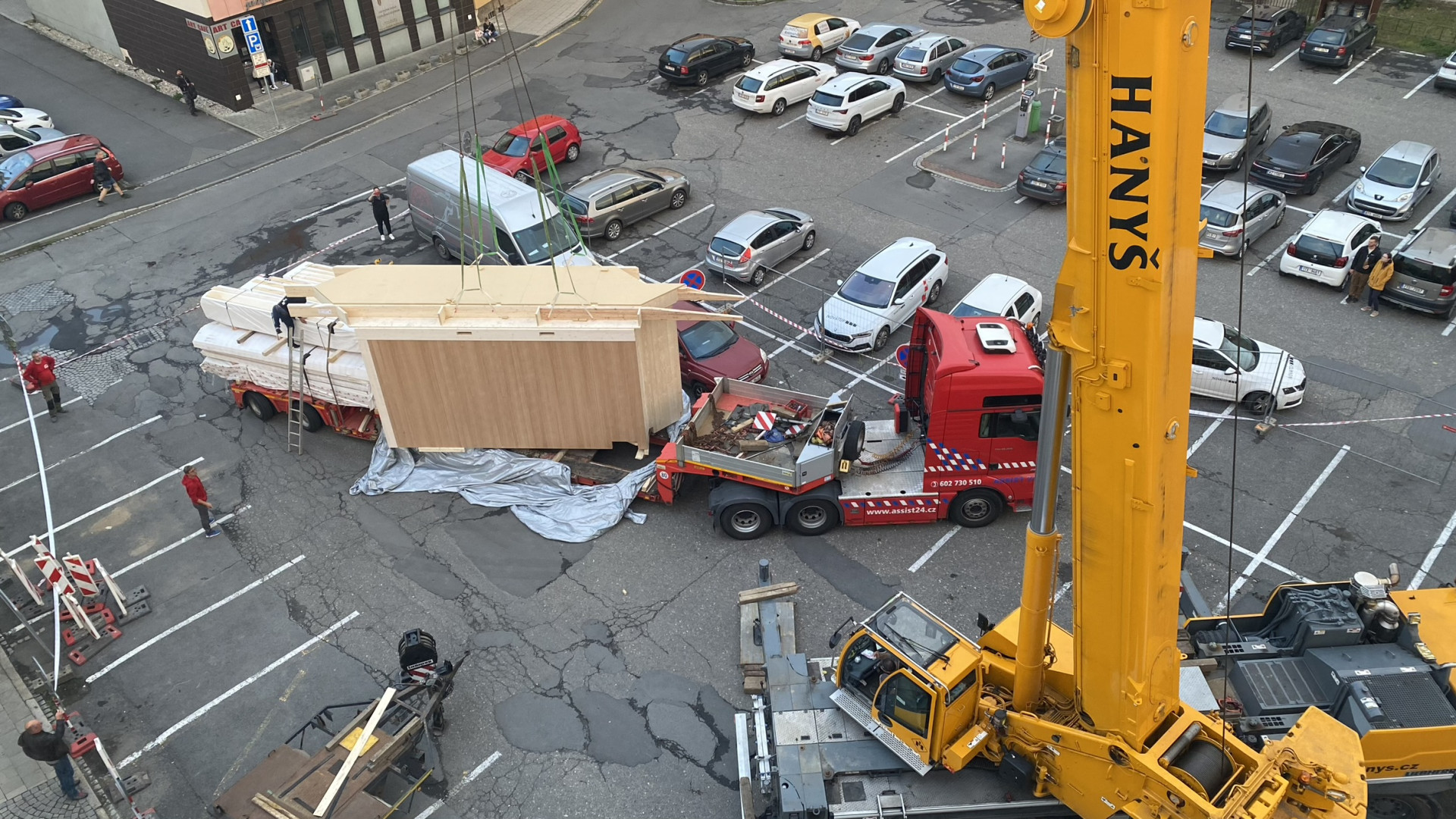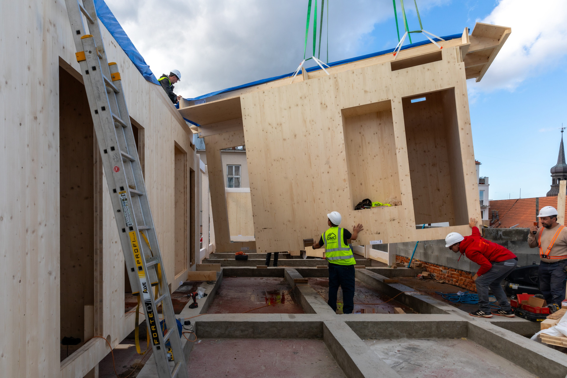 Architekti zvolili dřevěnou nástavbu ze tří důvodů – za prvé kvůli nejasné podobě spodní stavby a jejímu rozdílnému modulu oproti nástavbě, za druhé kvůli rychlosti a snaze o maximální stupeň prefabrikace a za třetí kvůli udržitelnosti, protože investorovi je dřevo víc než blízké. Celá nástavba je prefabrikovaná. Důvodů bylo víc – primárně šlo o časový limit. Město stanovilo časový limit výstavby pouze na jeden týden.