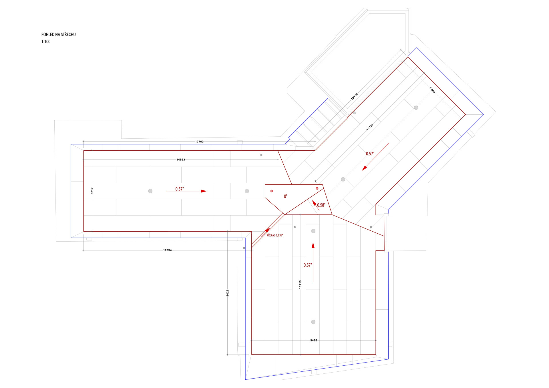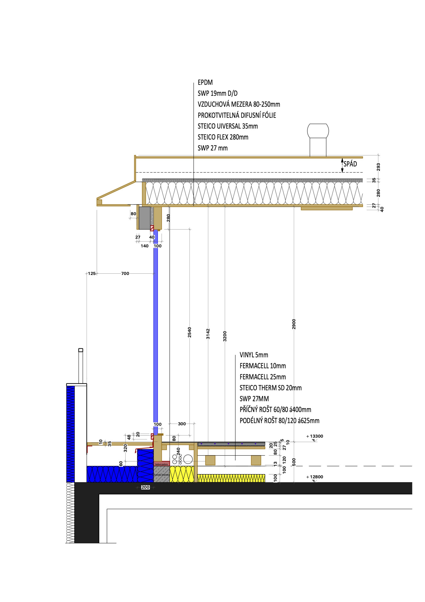 Střecha se přetáhla kvalitní difuzní folií, která umožňuje nulový spád a prokotvení. Na ni se pak kladly spádové klíny, připravené z dřevěných obdélníků, z nich každý následující byl o 3 mm nižší než předchozí. Je to pro výrobu jednodušší než vyrábět trojúhelníky, zároveň je možné pro jejich výrobu efektivně využít ořezy. Klíny byly zaklopeny třívrstvou deskou a na ni je natažená EPD folie.