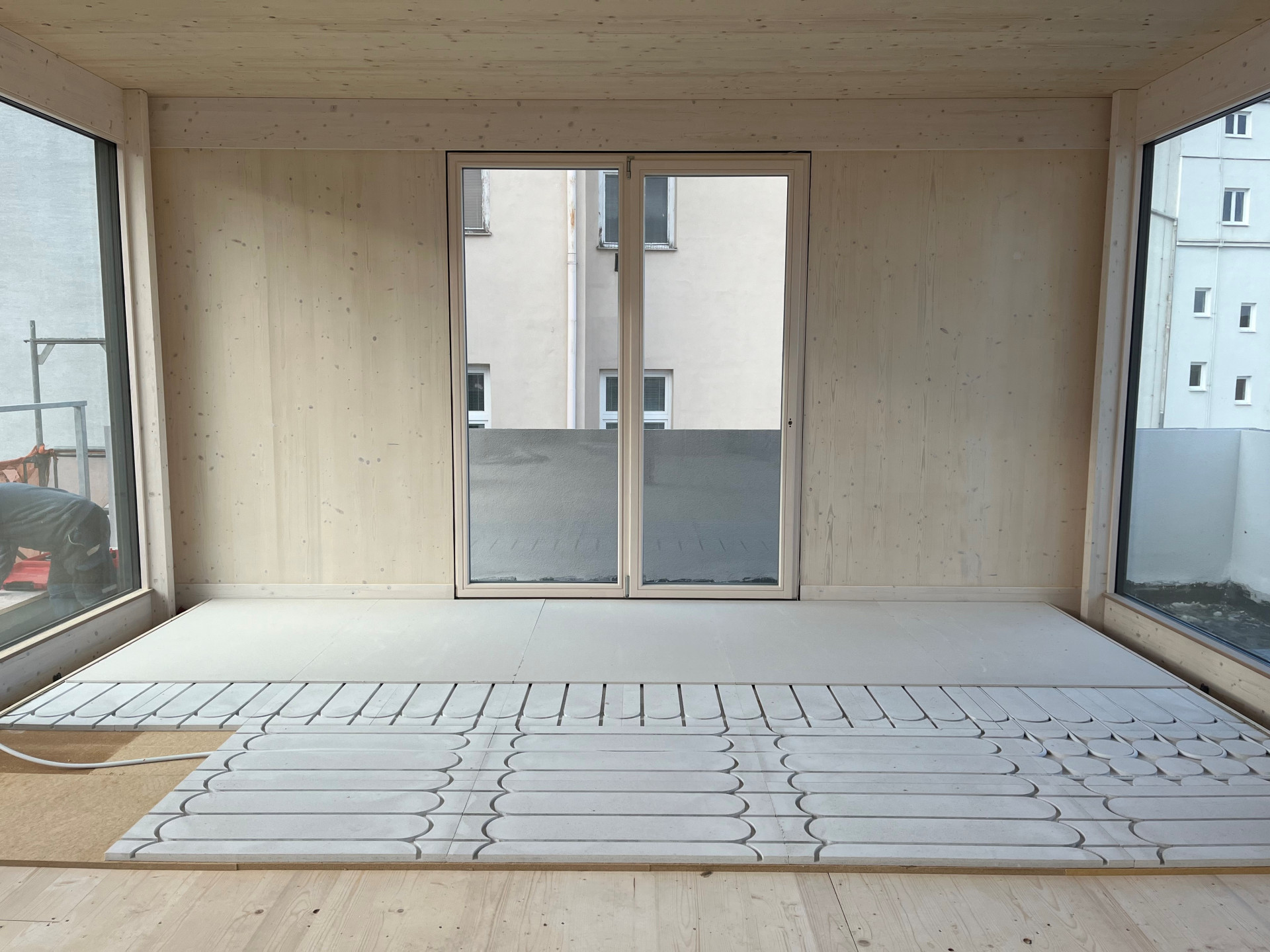 Podlahová izolace je více méně formální, ale ovlivňuje i vzduchovou neprůzvučnost skladby. Izolovalo se venku extrudovaným polystyrenem a na rošt se pokládaly segmenty modřínové terasy, které jsou snadno odnímatelné pro účely údržby. Uvnitř je použitá minerální izolace a následně speciální deska pro podlahové vytápění fermacell Therm25, navržená pro systém suché podlahy s integrovaným vedením trubek podlahového vytápění či chlazení – zde se budou využívat obě funkce. Po celém obvodu je instalační kanál široký 300 mm, kde je kompletně rozvedená kabeláž pro sítě a instalace, nad ním je odnímatelný poklop. I sloup v BSH rámu má uvnitř vertikální instalační kanál 10x10 cm, který vnikl slepením trámů ze 3 kusů (20+10+20 cm). Díky tomu lze snadno modifikovat dispozici prostor nebo začlenit nové sítě, které budou v budoucnu využívané.