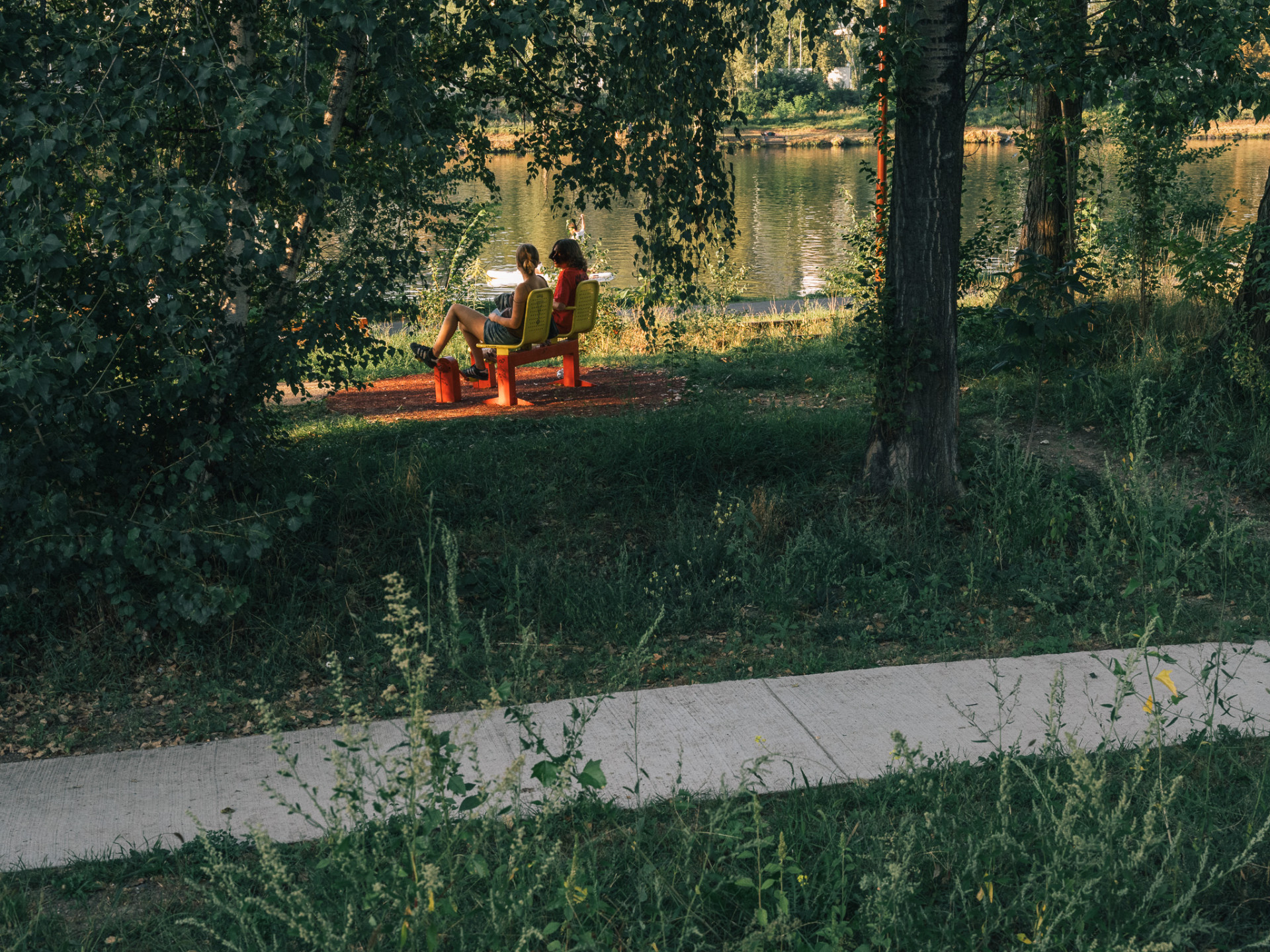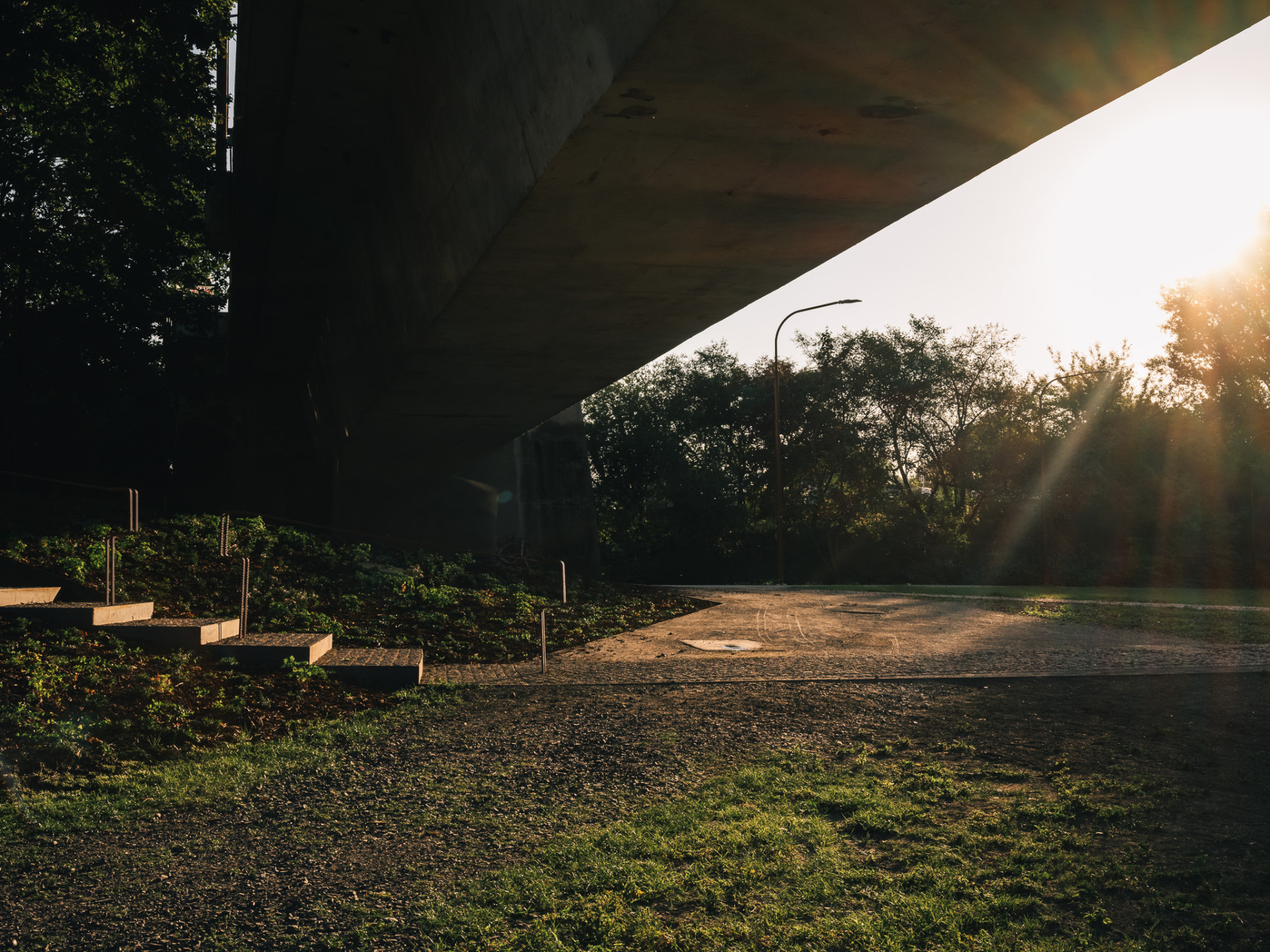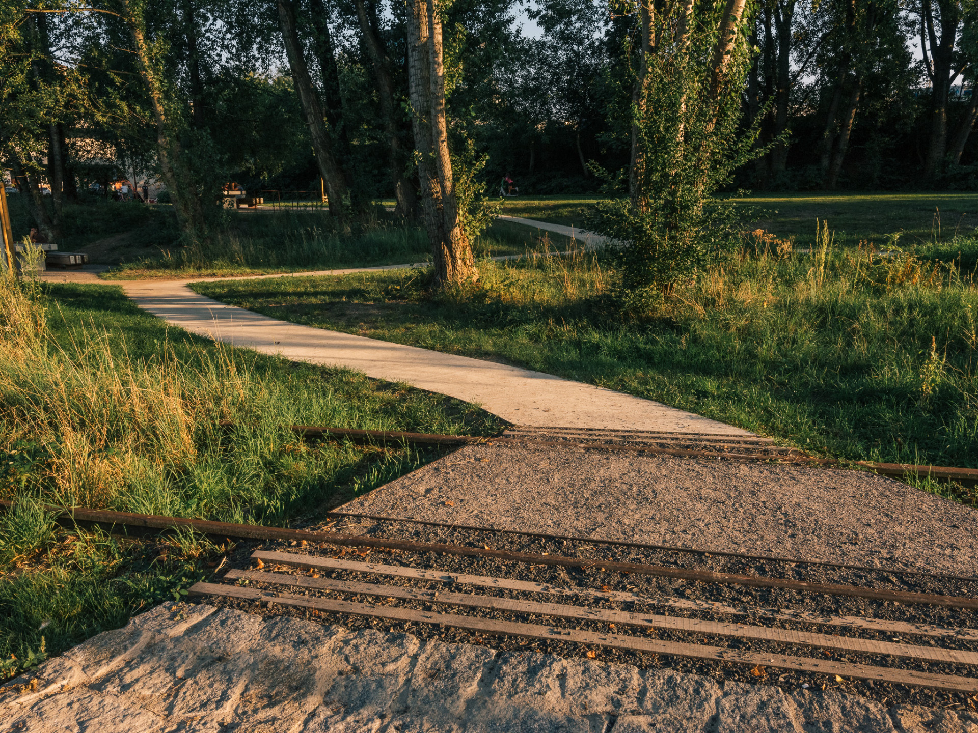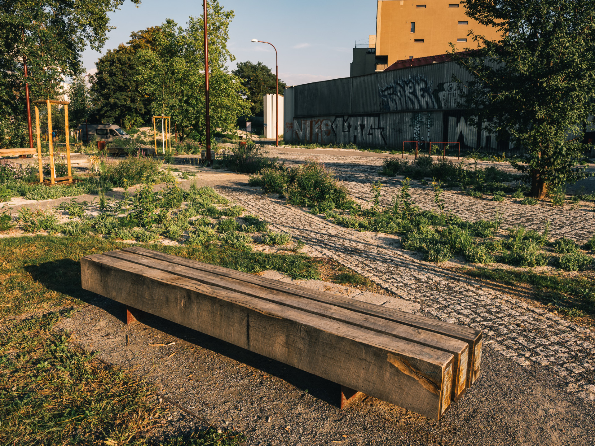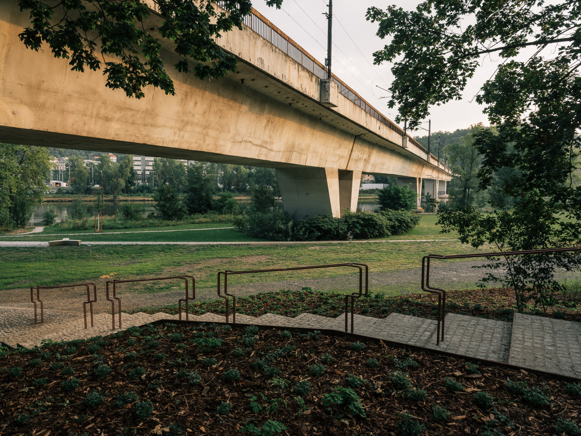 Prostor dnešního parku U Vody je za stěnou do značné míry skrytý. „Donedávna to bylo místo, kde jste měli pocit, že se může téměř vše. Jak v tom negativním smyslu, ale i v tom pozitivním,“ popisuje Tereza Rapsová. A dodává, že ateliér YYYY chtěl místu zachovat jeho „svobodnost“ − třeba právě volbou střídmých materiálů a podoby mobiliáře anebo způsobem práce se zelení.
