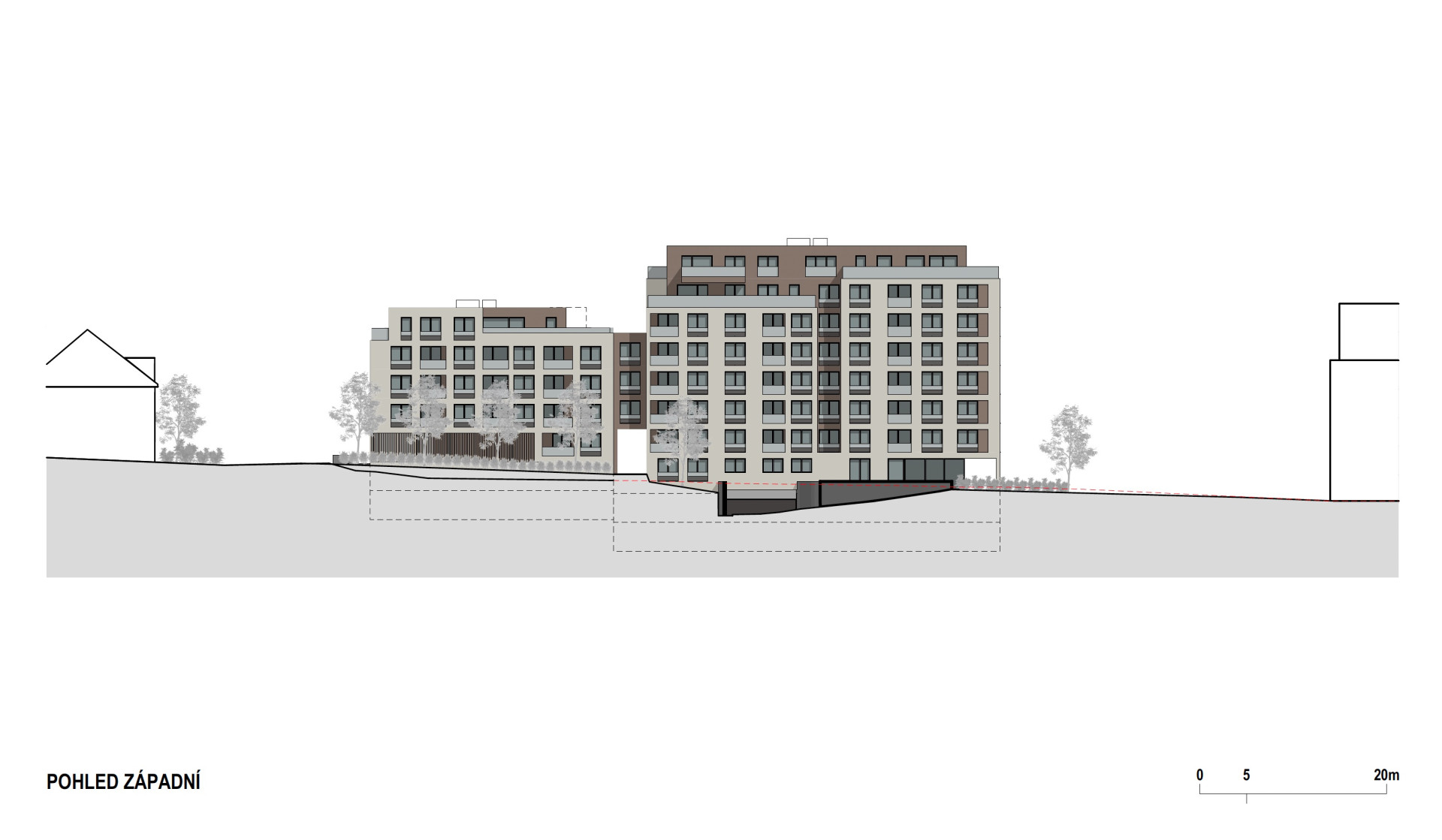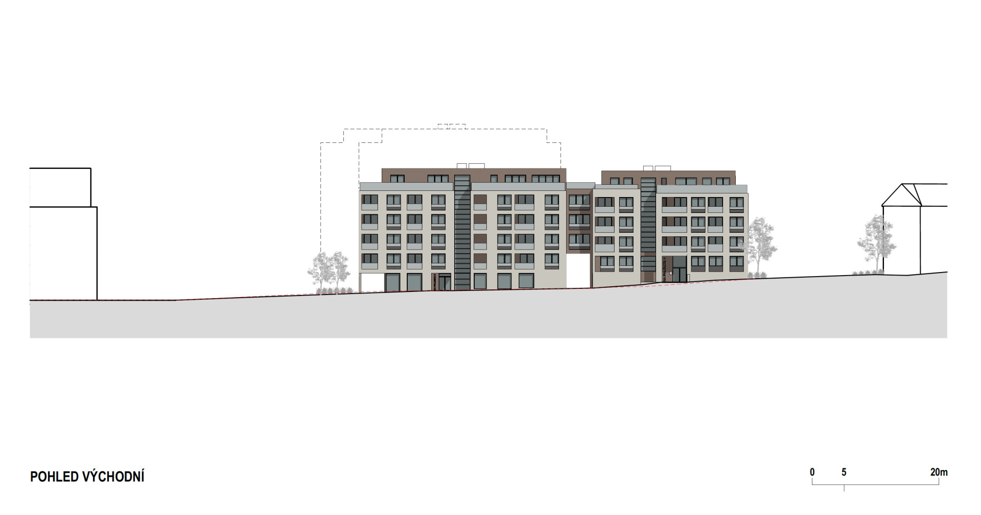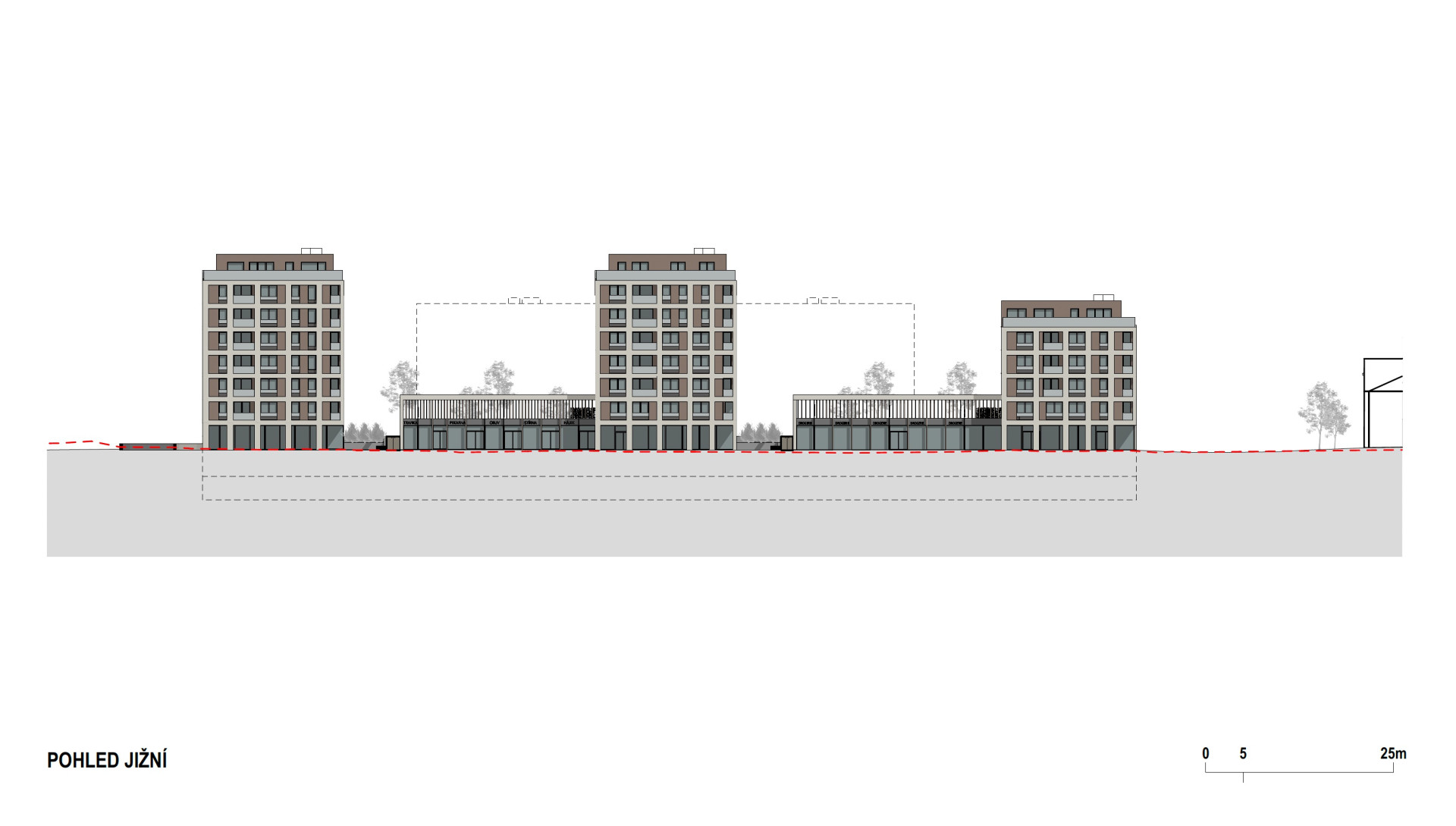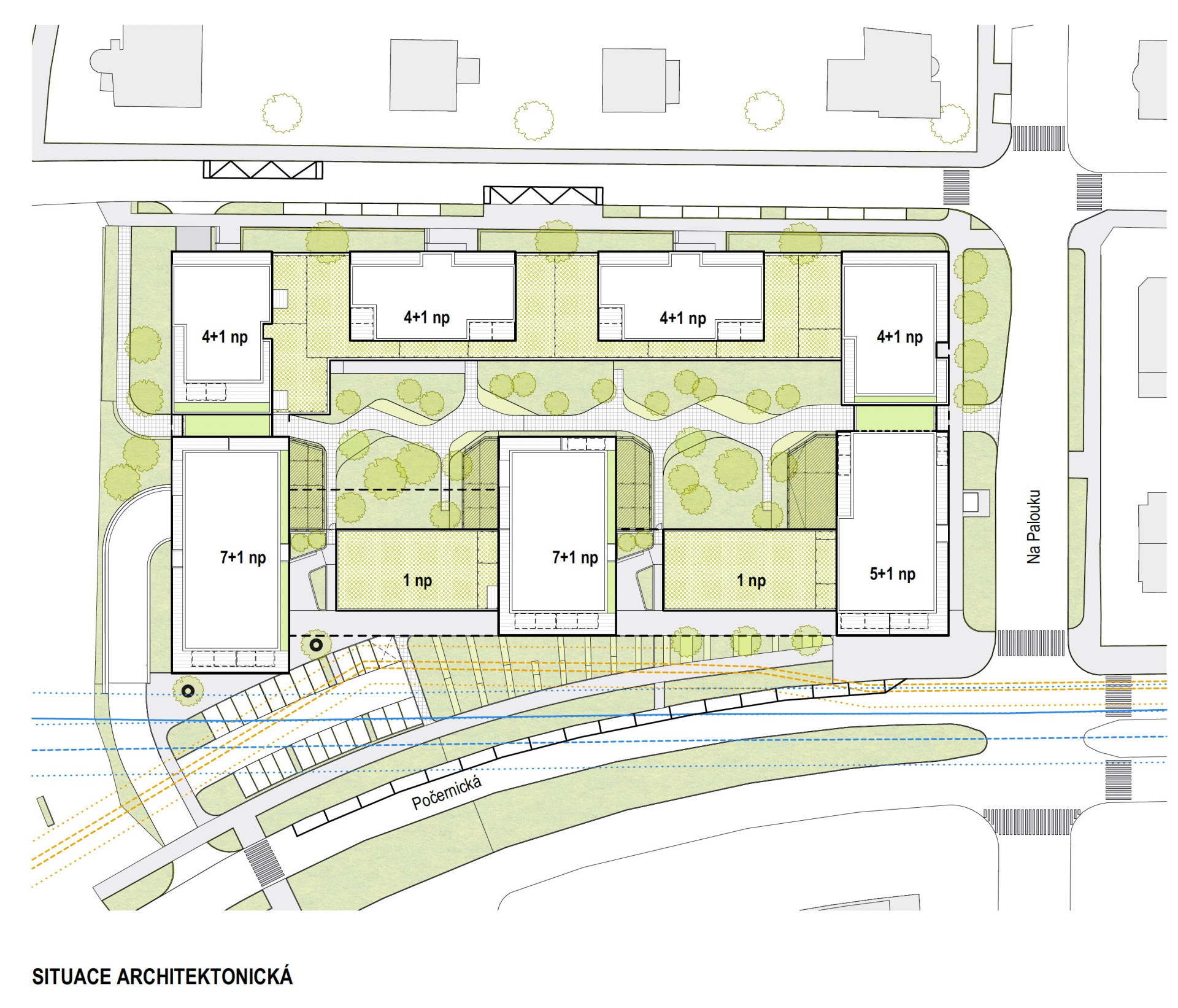 Jižní část pak zaplňuje trojice vyšších staveb (7+1 a 5+1) které jsou vzájemně propojeny kolmo orientovaným jednopodlažním křídlem obchodních a nebytových prostor vykazujícím městotvorný charakter. „Hmoty jednotlivých bytových domů jsou v úrovni 2. NP vykonzolovány přes obchodní parter v přízemí a vytváří tak dojem podloubí. Dům na jihozápadě půdorysně mírně předstupuje a pohledově tak uliční frontu uzavírá a reaguje na oblý tvar ulice Počernická,“ upřesňují autoři návrhu. „Obytný blok je ve směru východ-západ průchozí ve formě dvou velkorysých průchodů na výšku dvou podlaží z ulice Na palouku a Nad Vodovodem.“