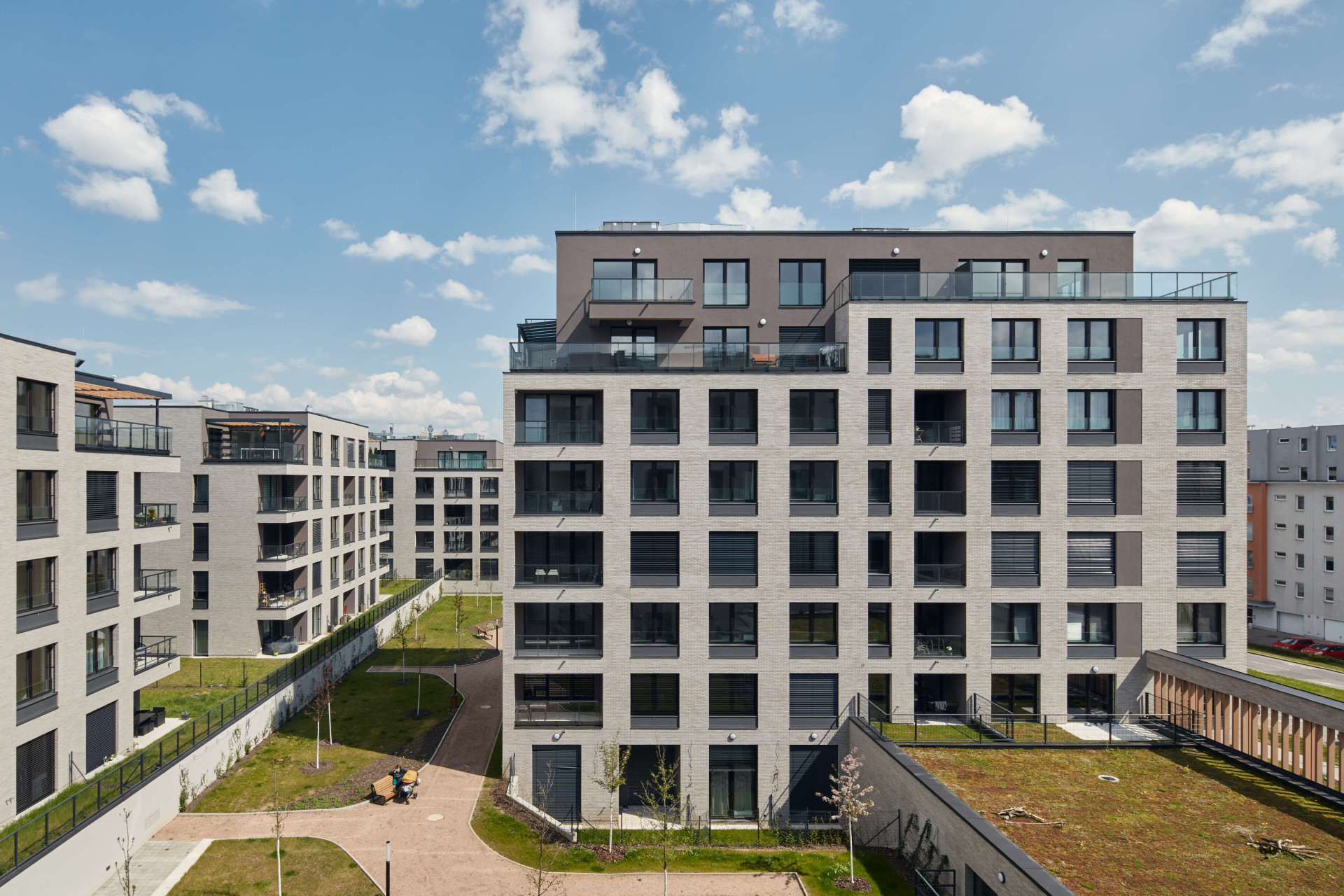 Většinu pohledově exponovaných střech pokrývá vegetace, celkem jde o bezmála tisíc metrů čtverečních zelených střech. Prostorný vnitroblok je zpracován do podoby klidného parku se širokým chodníkem navazujícím na dva průchody celým blokem. Zajímavostí jsou také budky pro rorýse obecného, které jsou integrovány přímo do izolace budov.